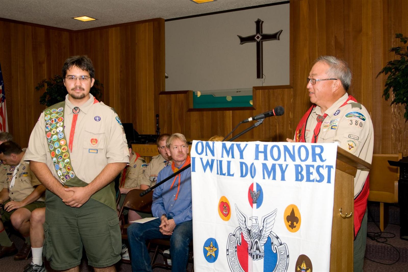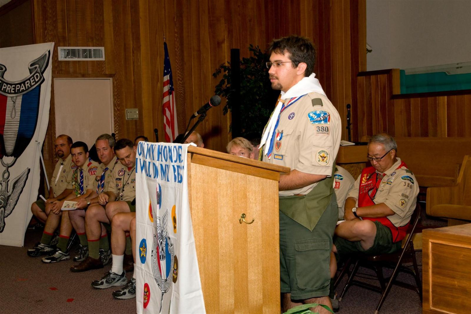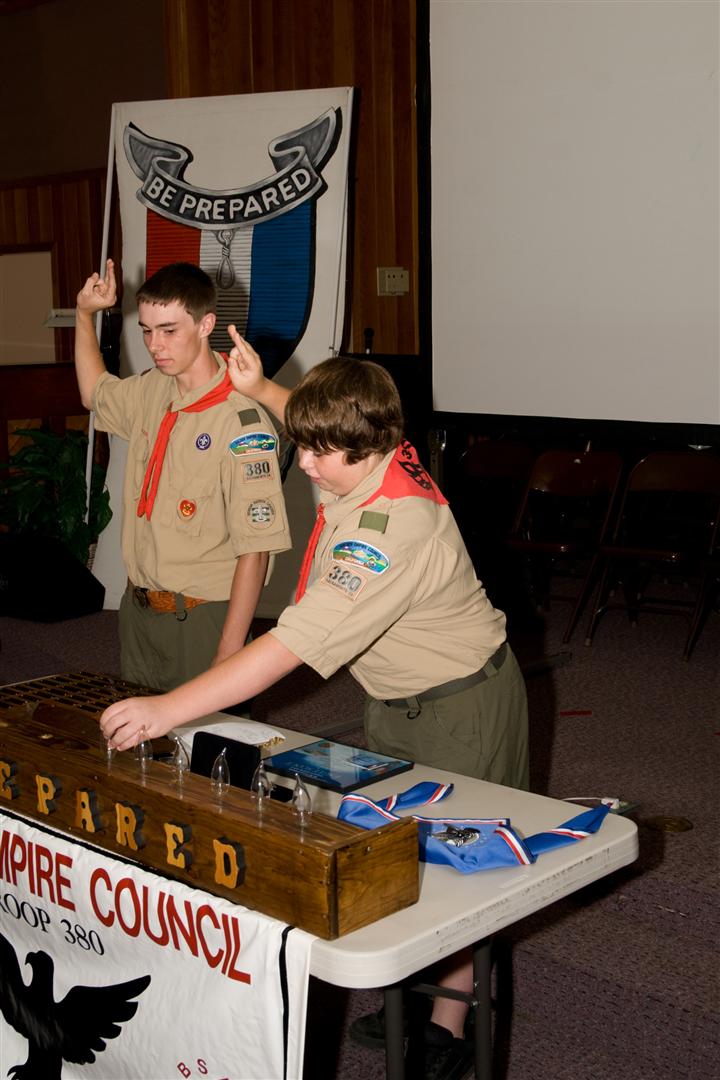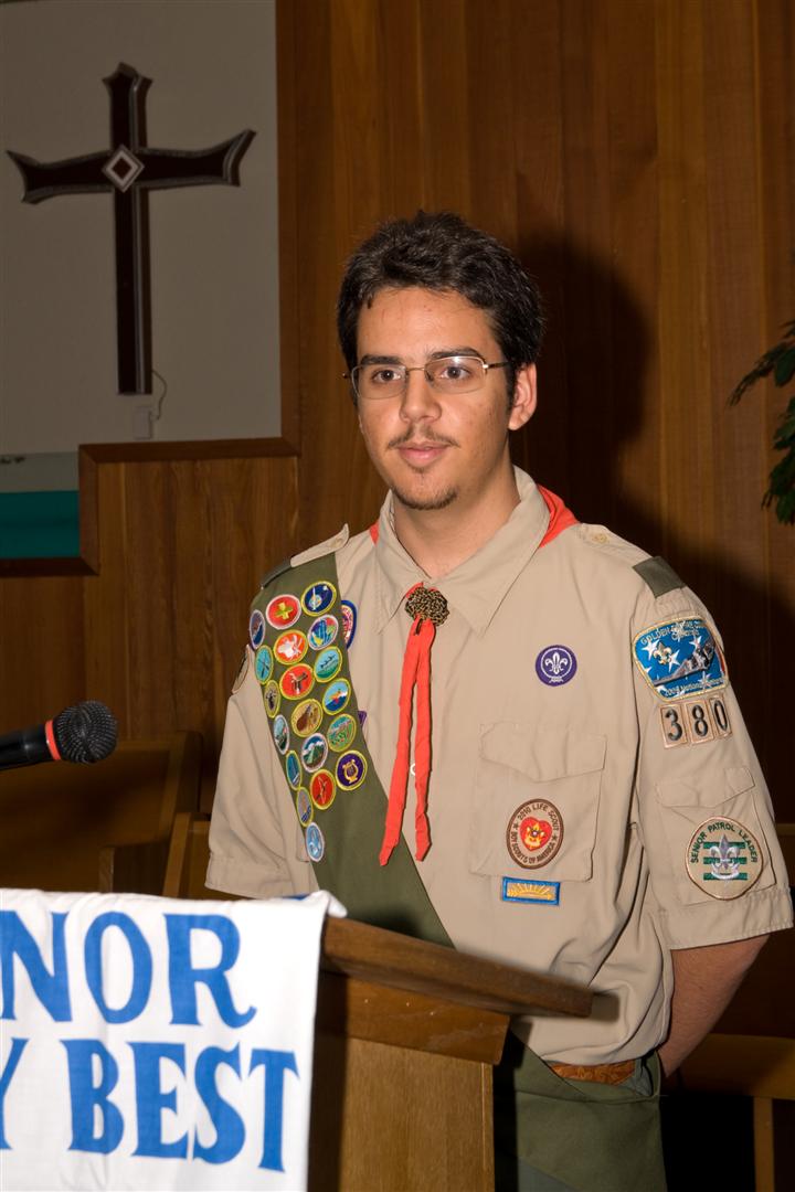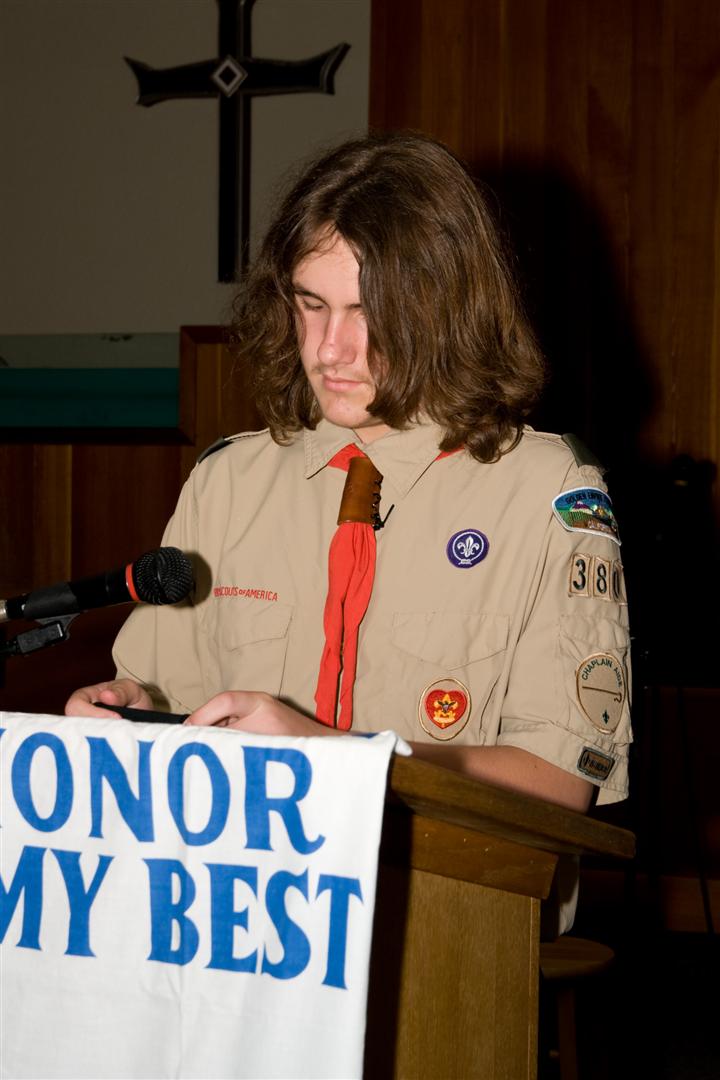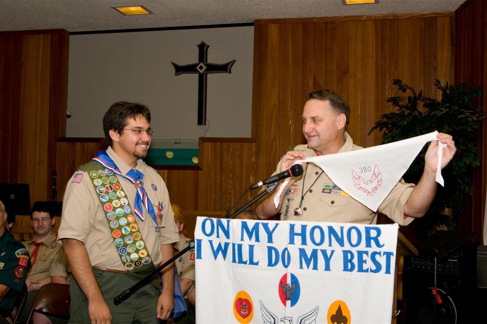 On July 3, 2010, Troop 380 held the Eagle Court of Honor for Corey Reynolds at Emmanuel Baptist Church. At the court of honor Garret R., a cousin of Corey and an Eagle Scout, himself, played trumpet for the opening colors which was followed by a slide show presentation showing some of the major events Corey had participated in. After the slide show was done, previous eagle Scouts were asked to join and form the Eagles’ Nest. The court of honor progressed to the presentation of the Eagle Scout Award to Corey. In addition to being presented the award, Corey and his father both made presentations to people instrumental to Corey earning the award. After the court of honor was concluded, refreshments of cookies, cake, and root beer floats were served. All in all, the evening was happy.