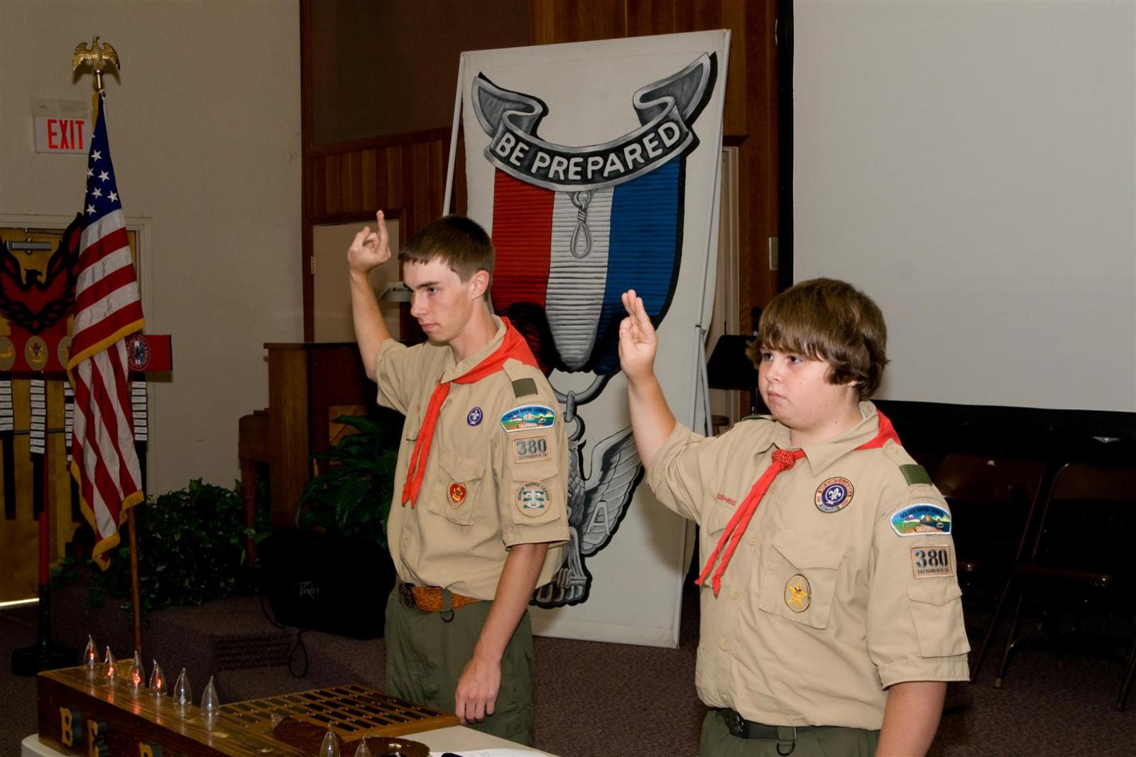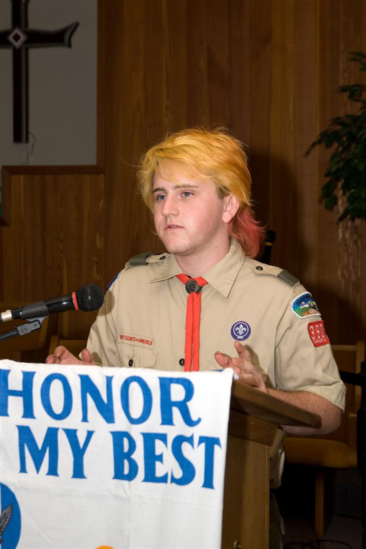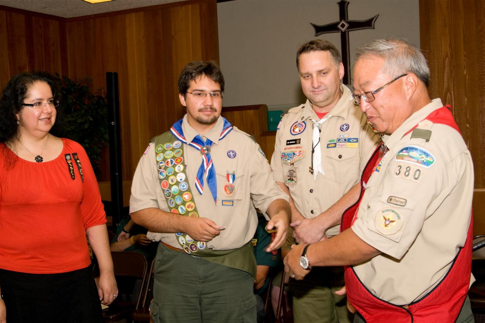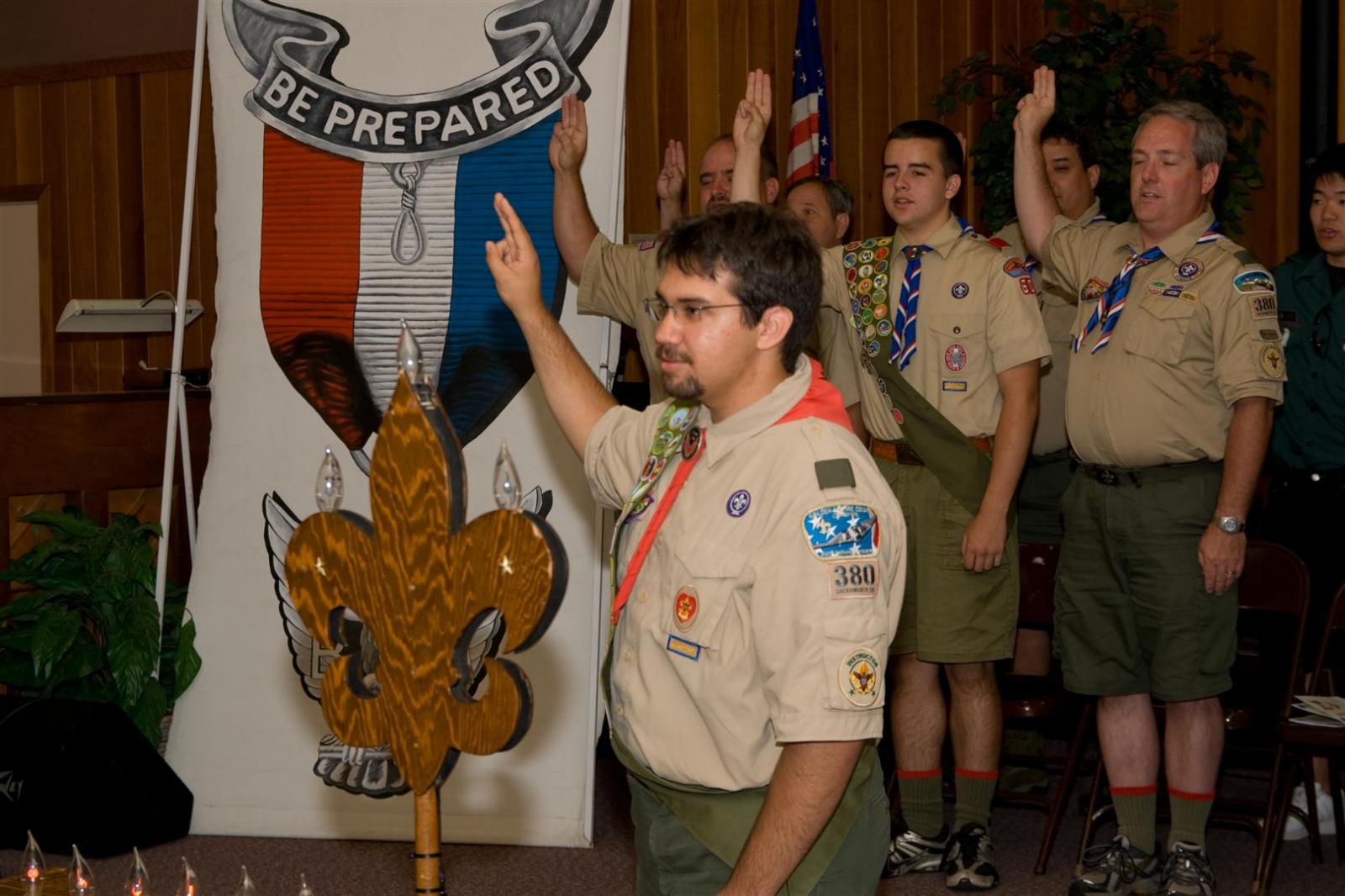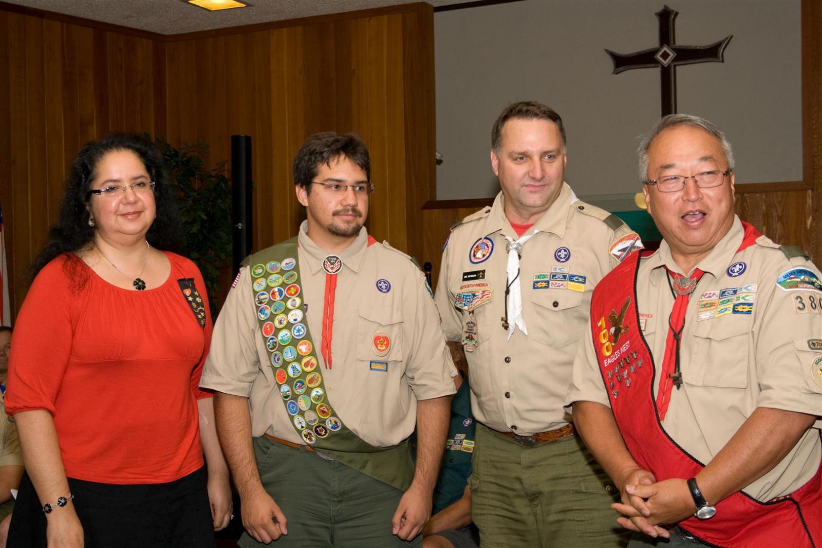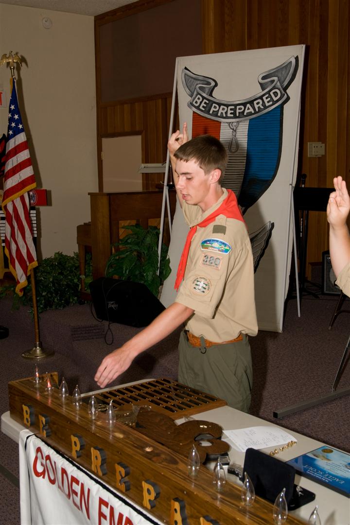 On July 3, 2010, Troop 380 held the Eagle Court of Honor for Corey Reynolds at Emmanuel Baptist Church. At the court of honor Garret R., a cousin of Corey and an Eagle Scout, himself, played trumpet for the opening colors which was followed by a slide show presentation showing some of the major events Corey had participated in. After the slide show was done, previous eagle Scouts were asked to join and form the Eagles’ Nest. The court of honor progressed to the presentation of the Eagle Scout Award to Corey. In addition to being presented the award, Corey and his father both made presentations to people instrumental to Corey earning the award. After the court of honor was concluded, refreshments of cookies, cake, and root beer floats were served. All in all, the evening was happy.
