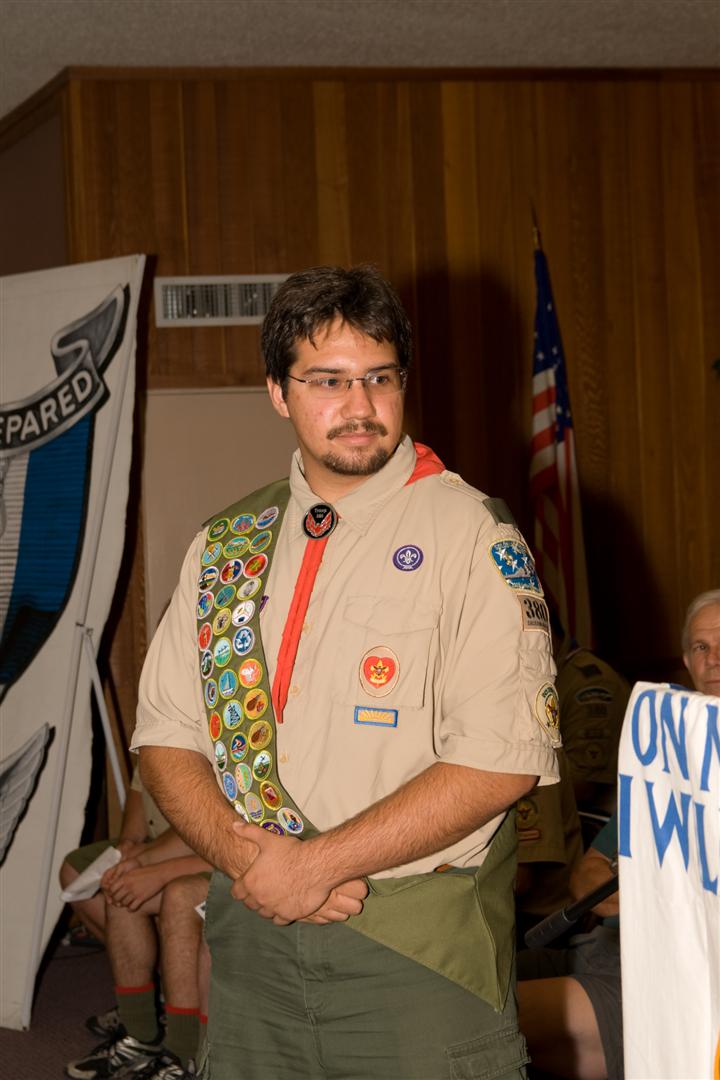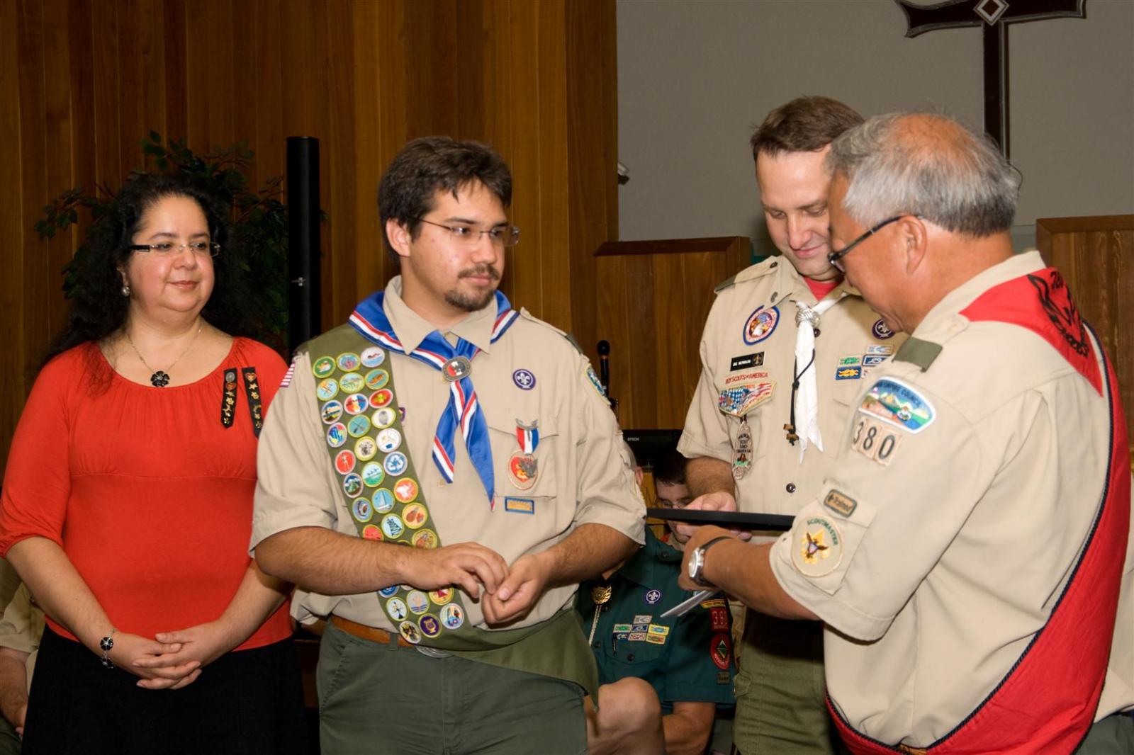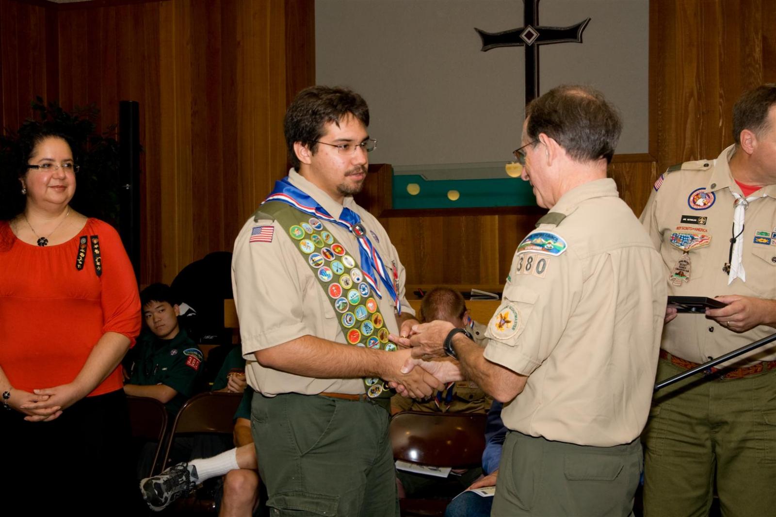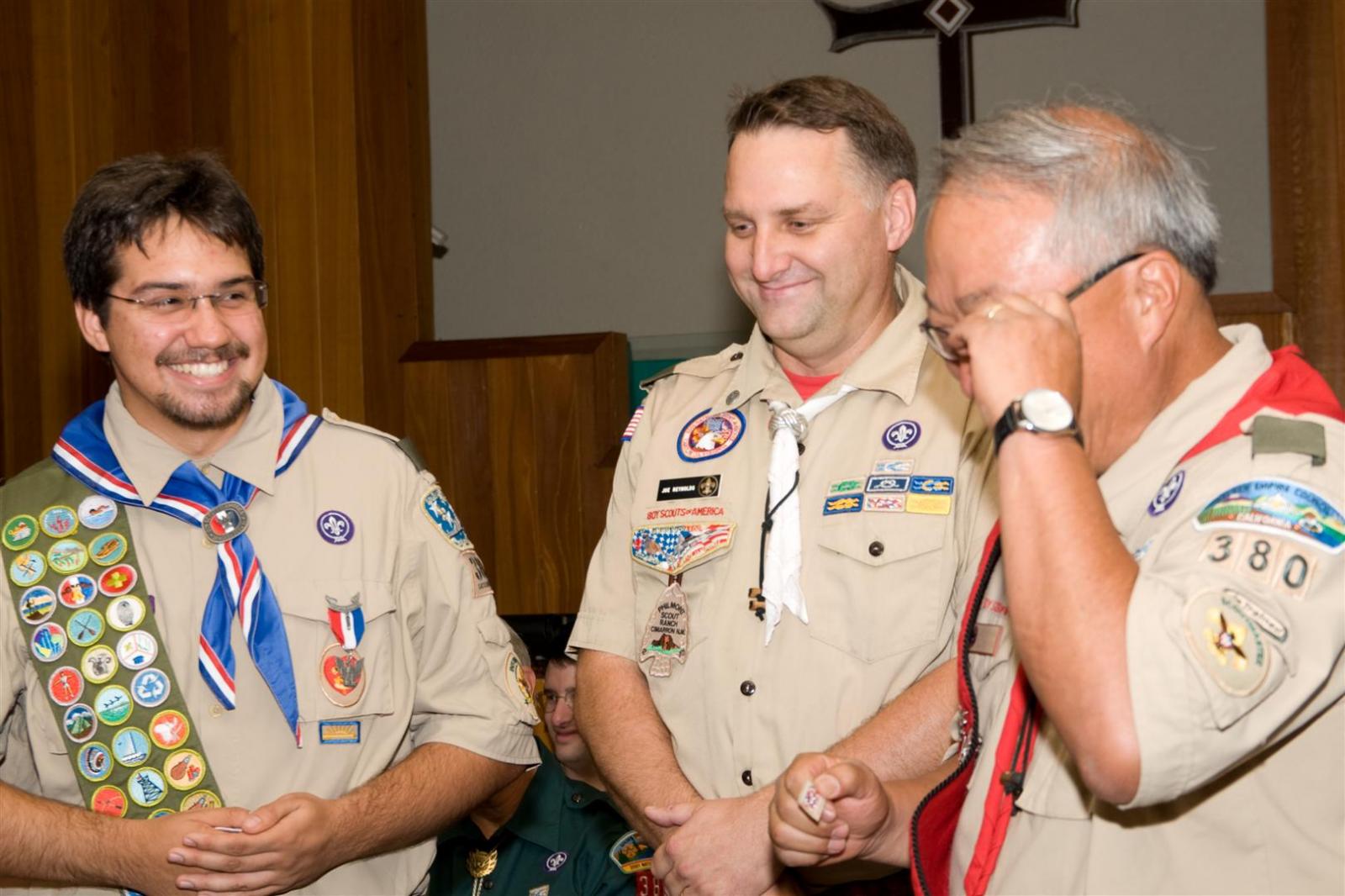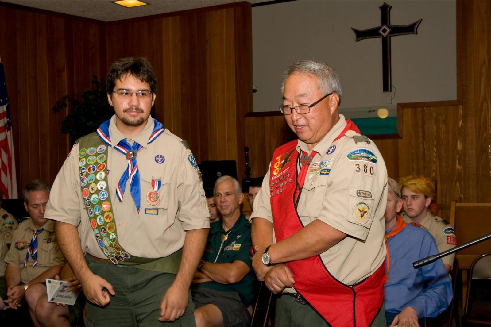 On July 3, 2010, Troop 380 held the Eagle Court of Honor for Corey Reynolds at Emmanuel Baptist Church. At the court of honor Garret R., a cousin of Corey and an Eagle Scout, himself, played trumpet for the opening colors which was followed by a slide show presentation showing some of the major events Corey had participated in. After the slide show was done, previous eagle Scouts were asked to join and form the Eagles’ Nest. The court of honor progressed to the presentation of the Eagle Scout Award to Corey. In addition to being presented the award, Corey and his father both made presentations to people instrumental to Corey earning the award. After the court of honor was concluded, refreshments of cookies, cake, and root beer floats were served. All in all, the evening was happy.
