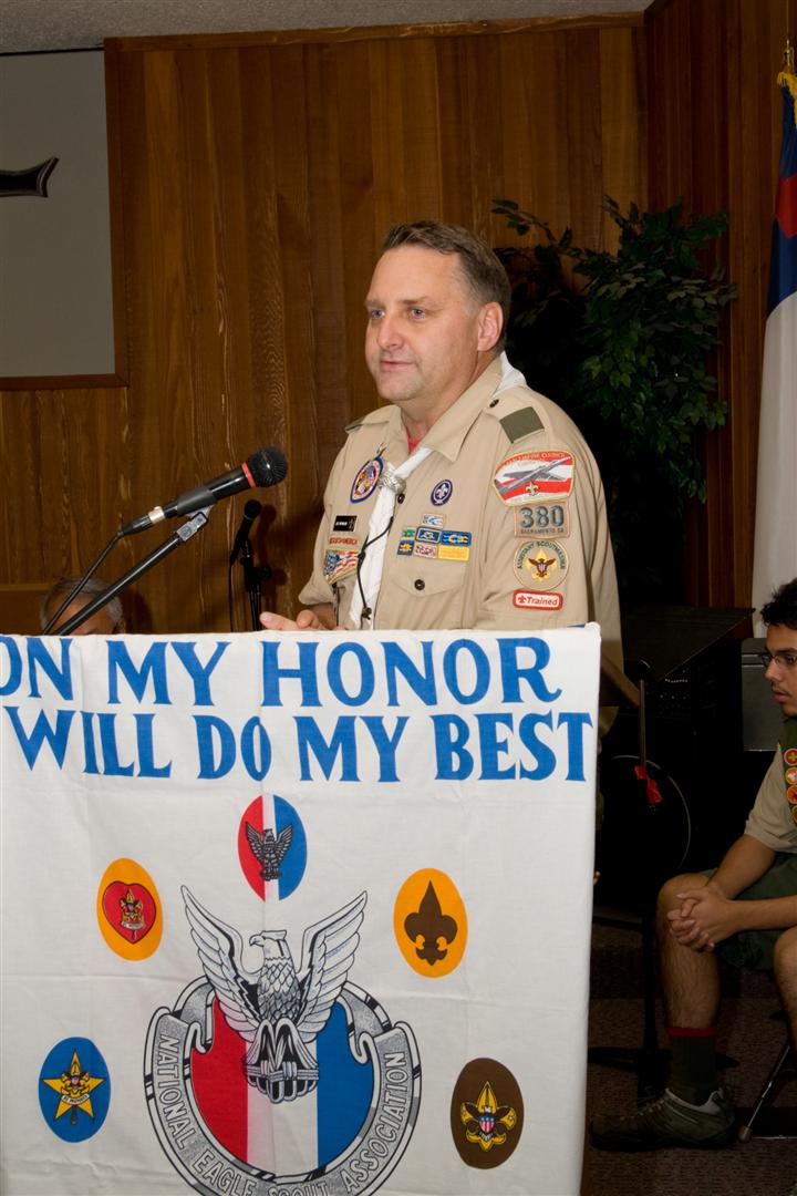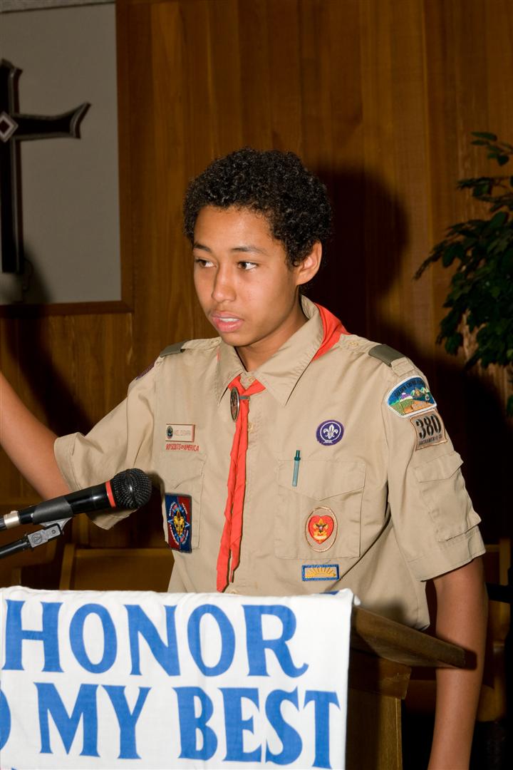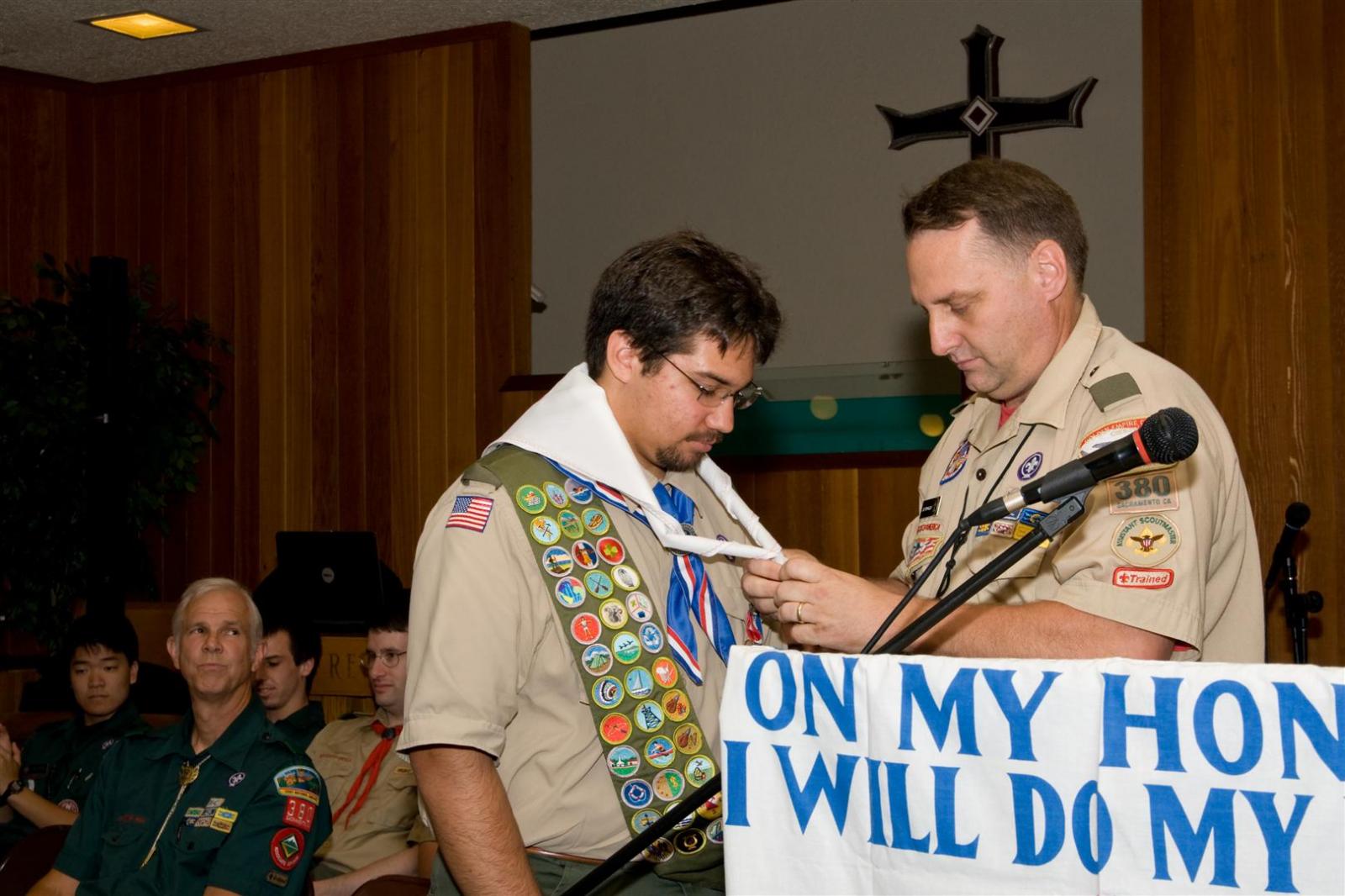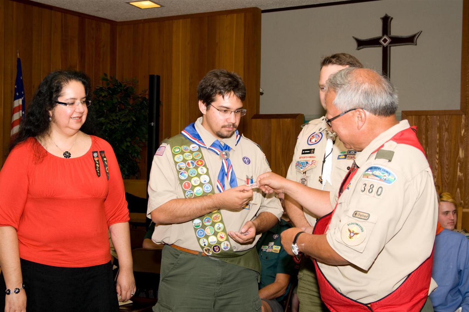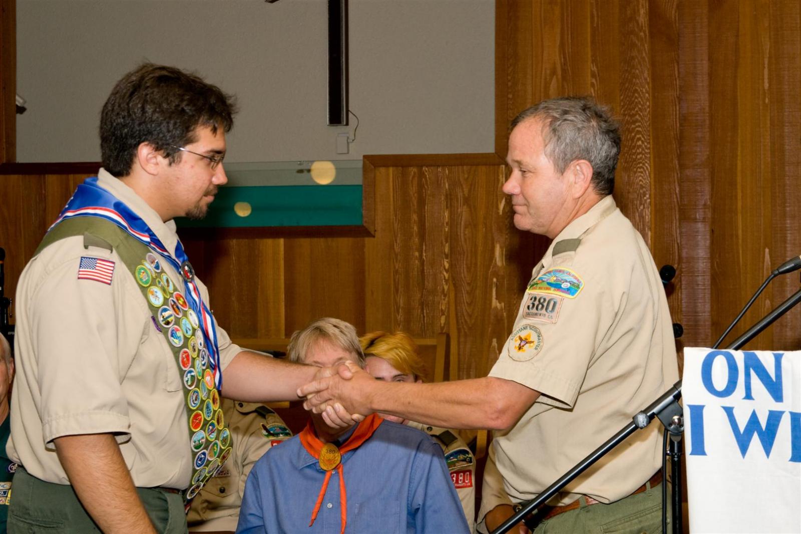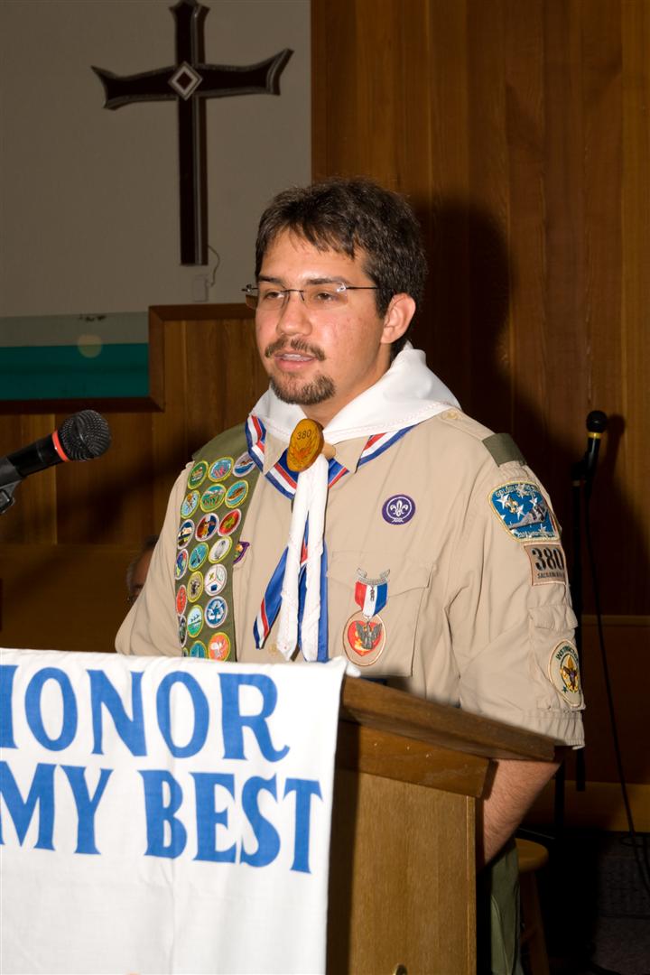 On July 3, 2010, Troop 380 held the Eagle Court of Honor for Corey Reynolds at Emmanuel Baptist Church. At the court of honor Garret R., a cousin of Corey and an Eagle Scout, himself, played trumpet for the opening colors which was followed by a slide show presentation showing some of the major events Corey had participated in. After the slide show was done, previous eagle Scouts were asked to join and form the Eagles’ Nest. The court of honor progressed to the presentation of the Eagle Scout Award to Corey. In addition to being presented the award, Corey and his father both made presentations to people instrumental to Corey earning the award. After the court of honor was concluded, refreshments of cookies, cake, and root beer floats were served. All in all, the evening was happy.