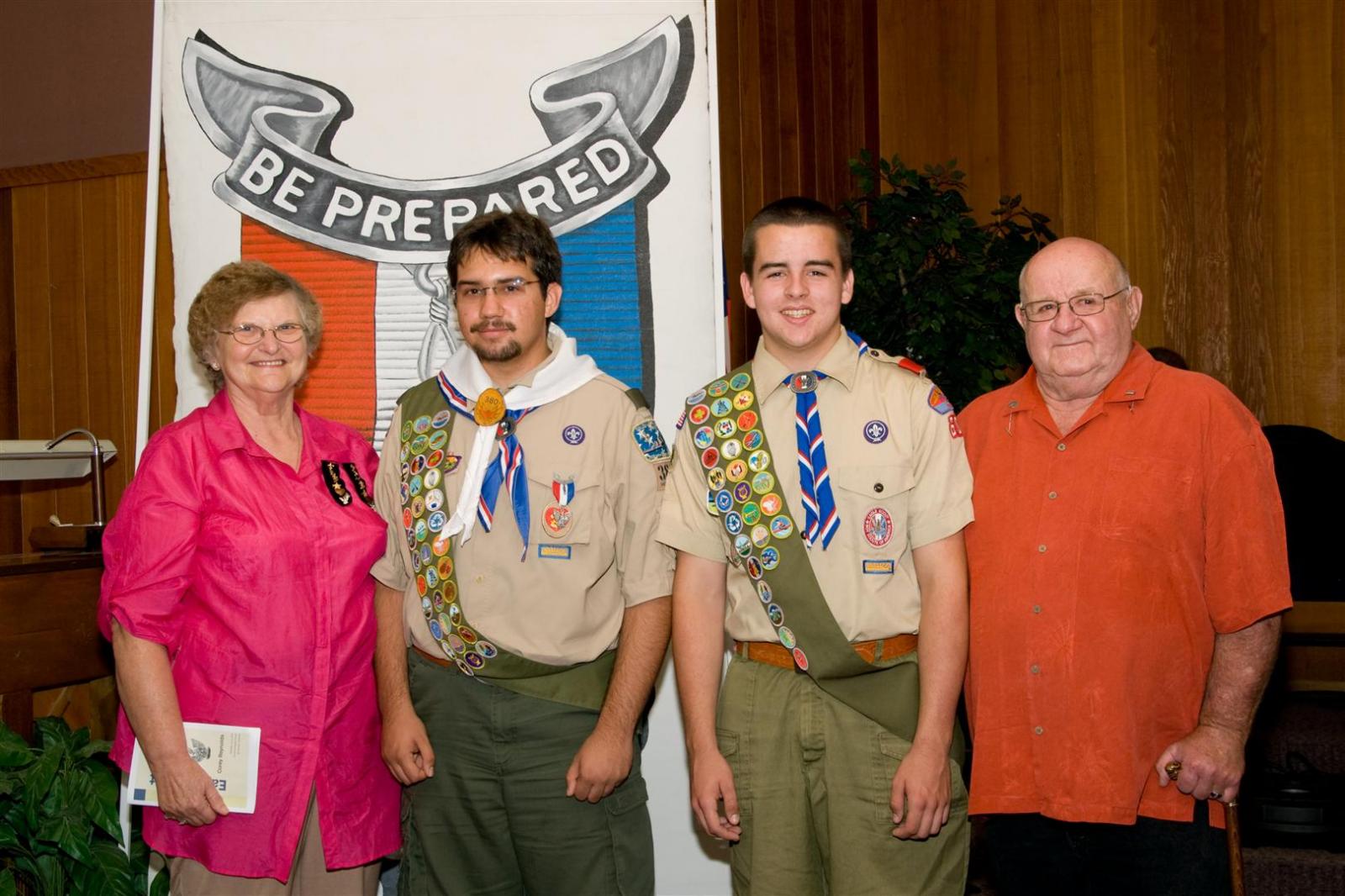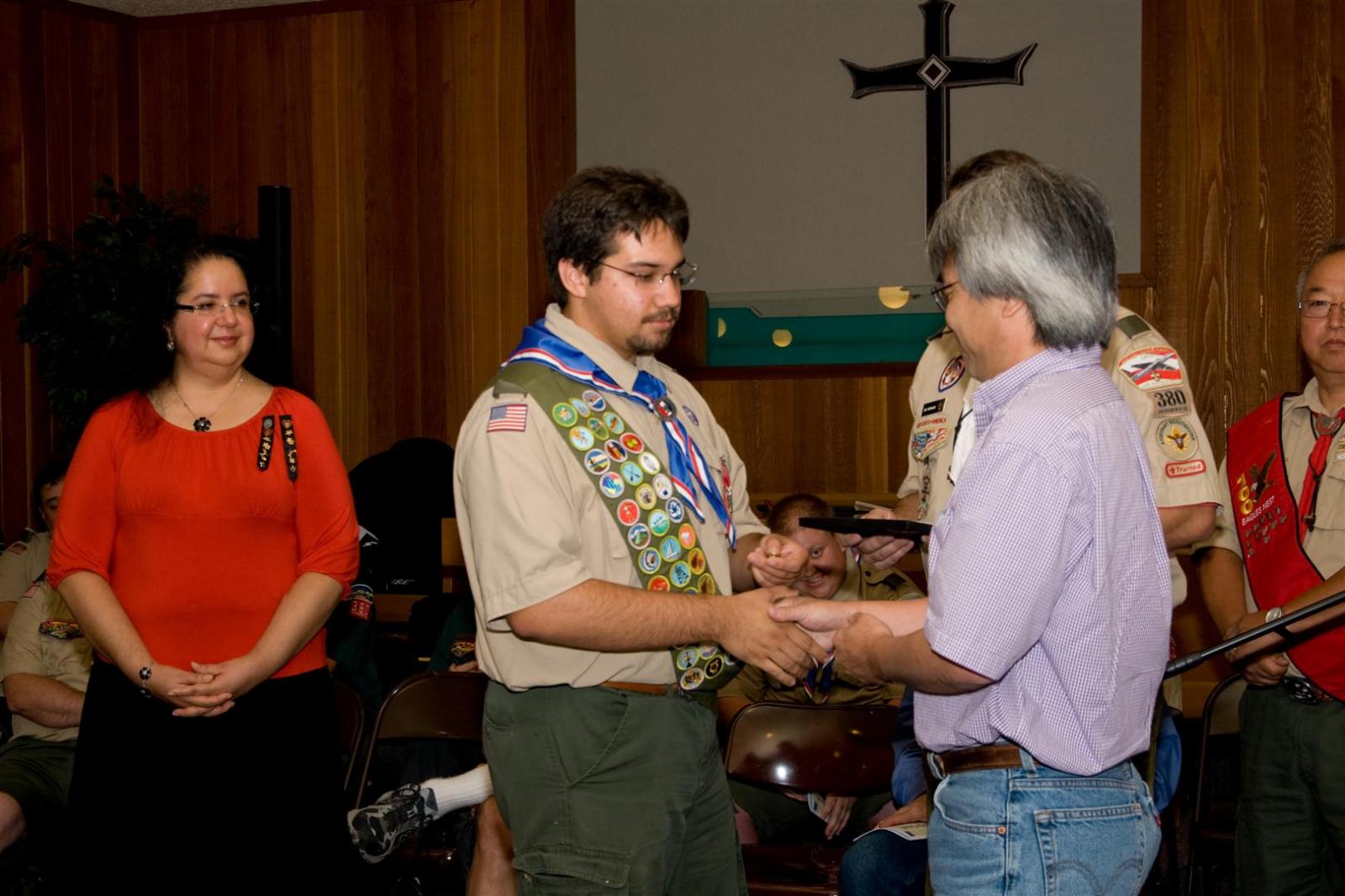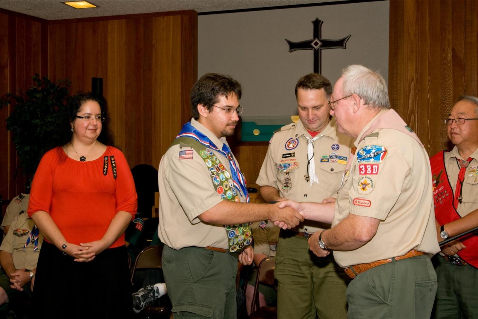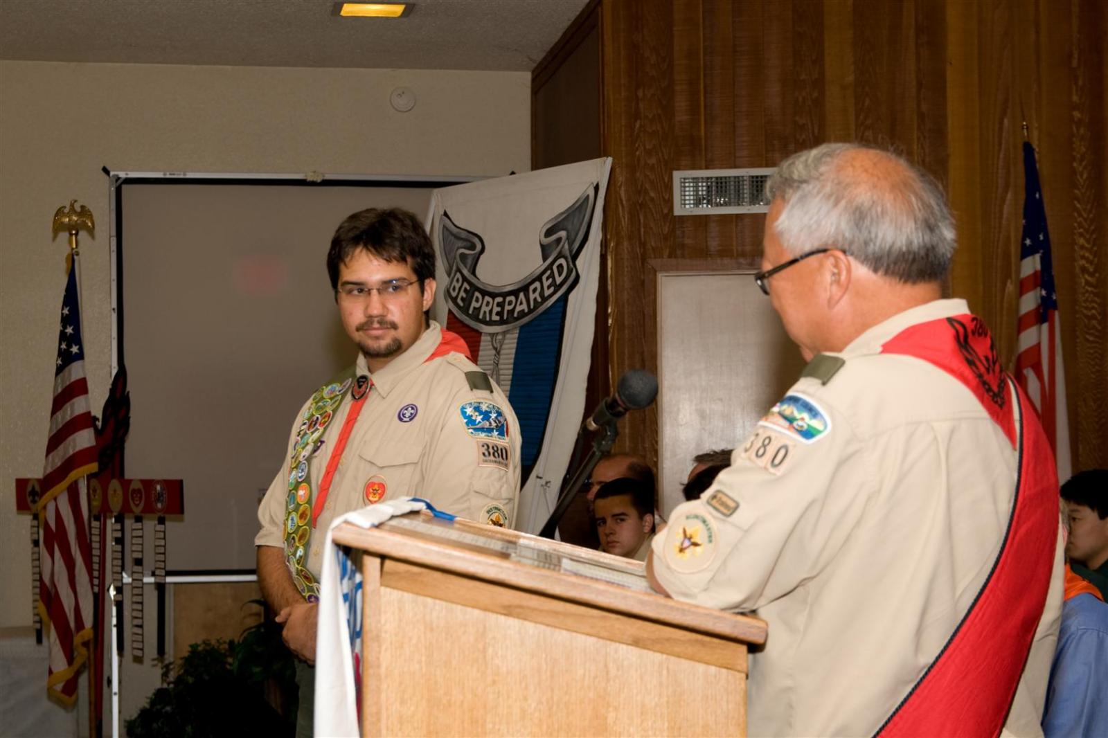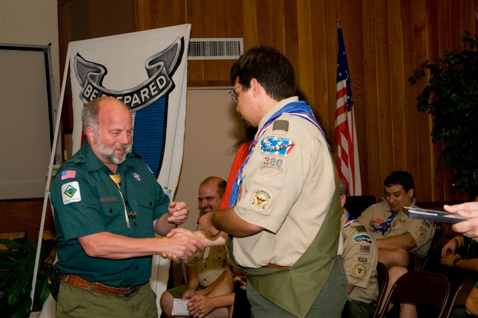 On July 3, 2010, Troop 380 held the Eagle Court of Honor for Corey Reynolds at Emmanuel Baptist Church. At the court of honor Garret R., a cousin of Corey and an Eagle Scout, himself, played trumpet for the opening colors which was followed by a slide show presentation showing some of the major events Corey had participated in. After the slide show was done, previous eagle Scouts were asked to join and form the Eagles’ Nest. The court of honor progressed to the presentation of the Eagle Scout Award to Corey. In addition to being presented the award, Corey and his father both made presentations to people instrumental to Corey earning the award. After the court of honor was concluded, refreshments of cookies, cake, and root beer floats were served. All in all, the evening was happy.