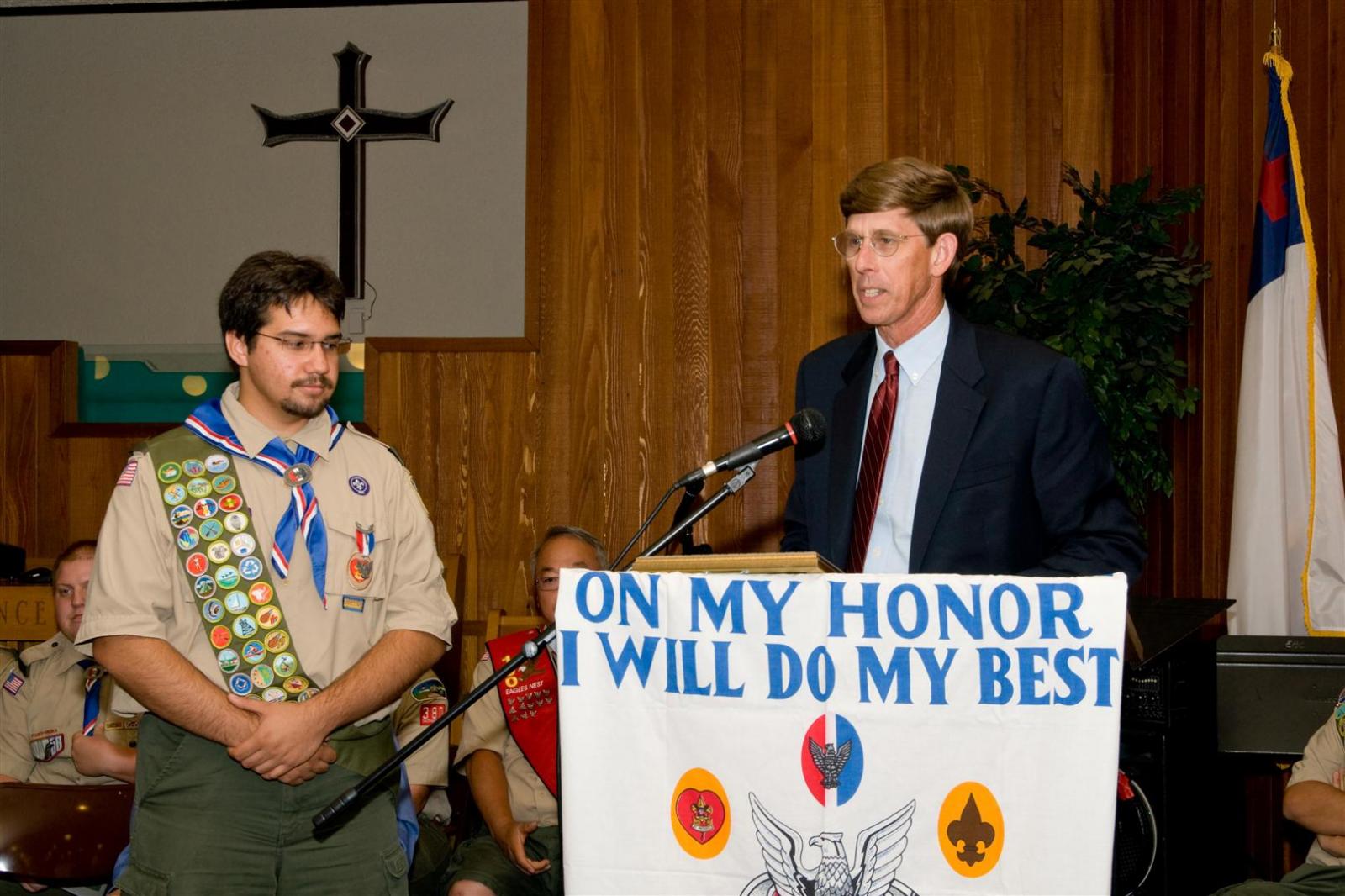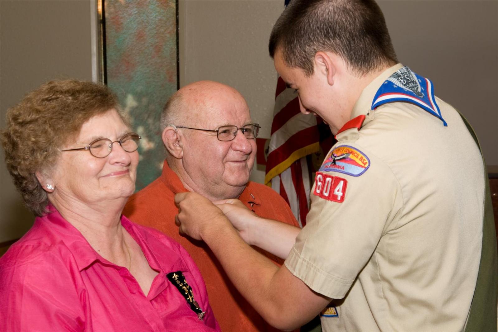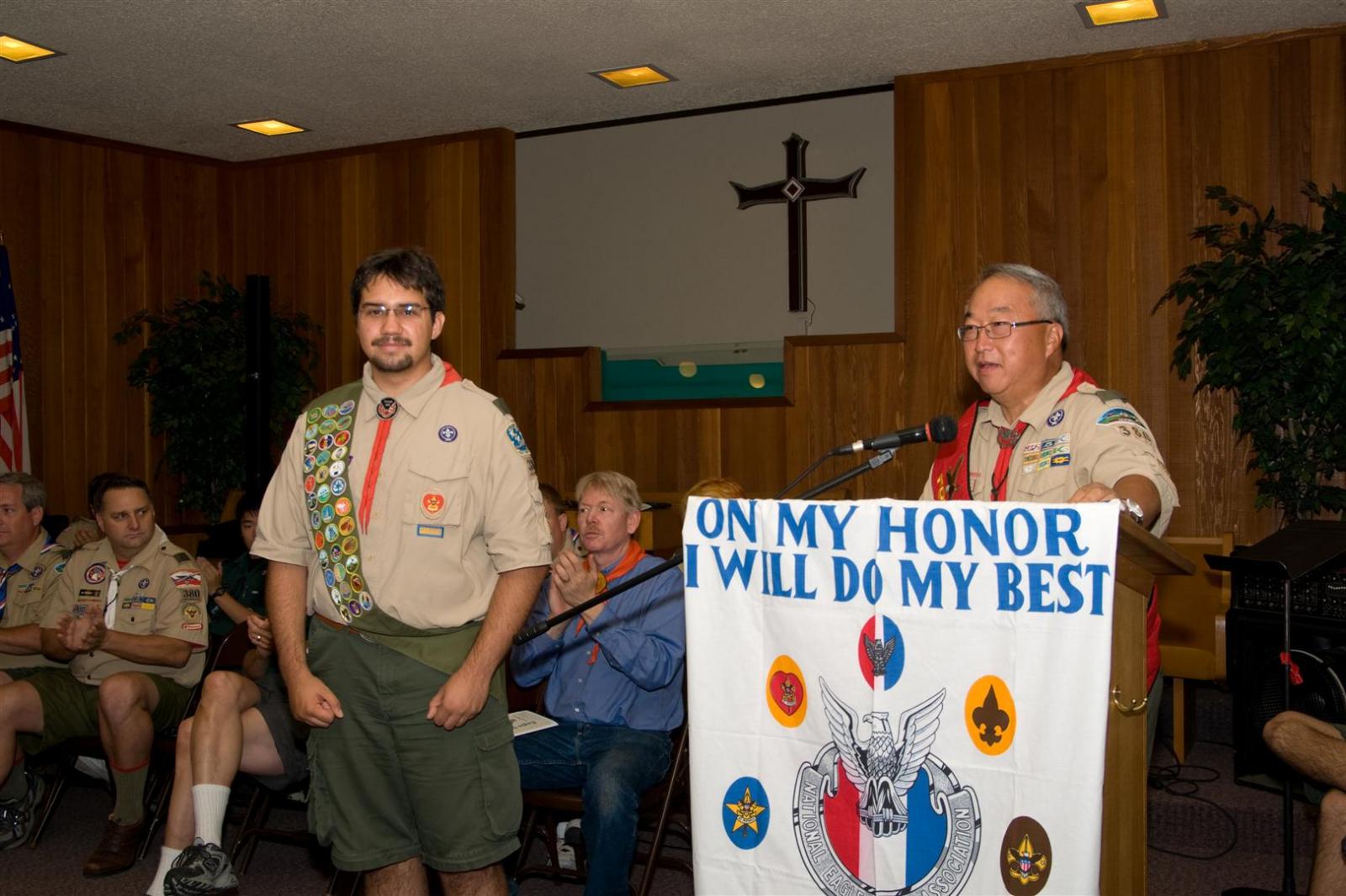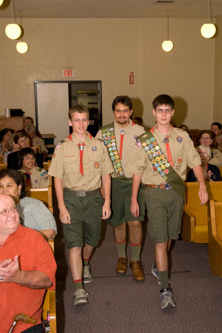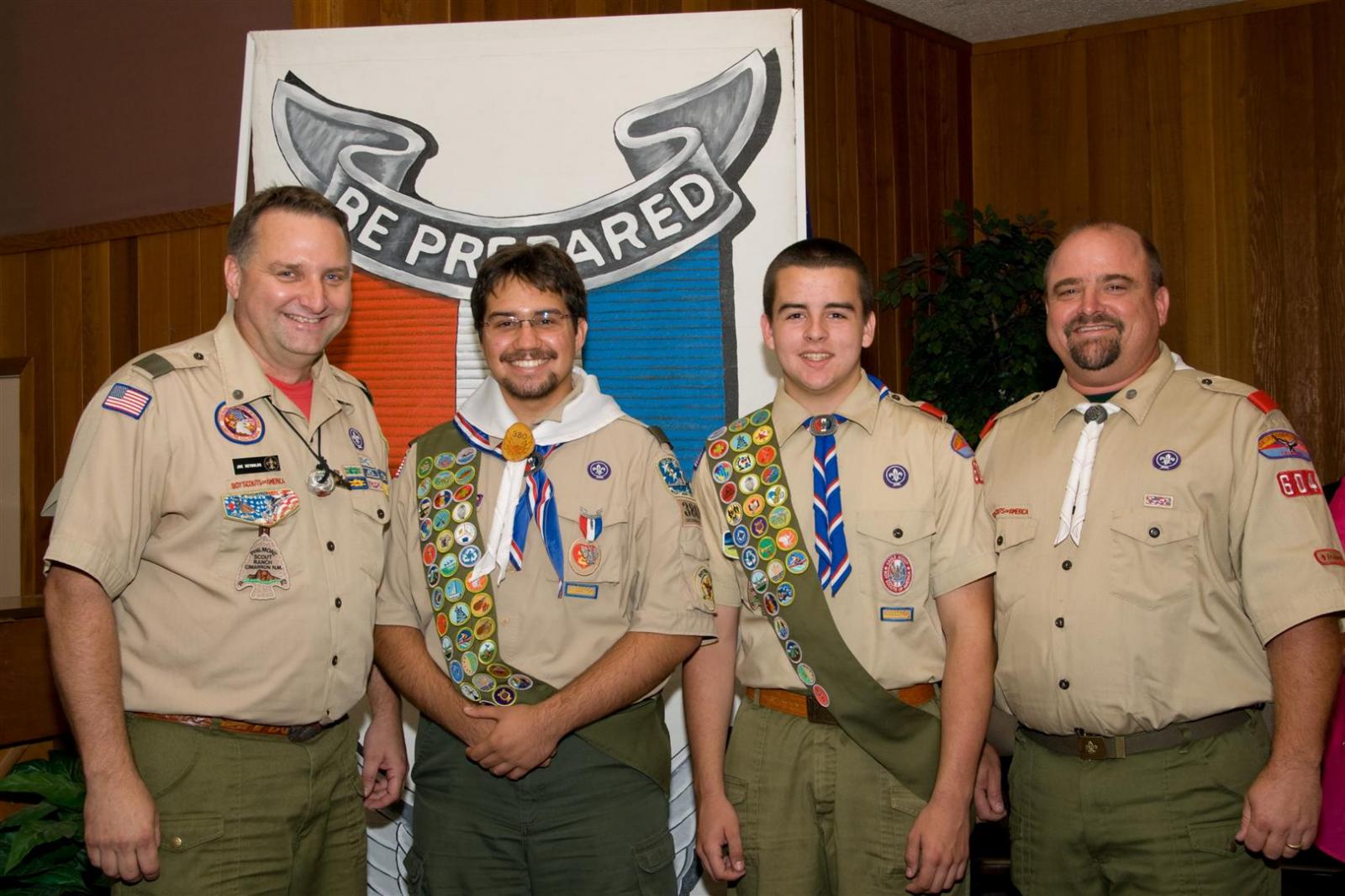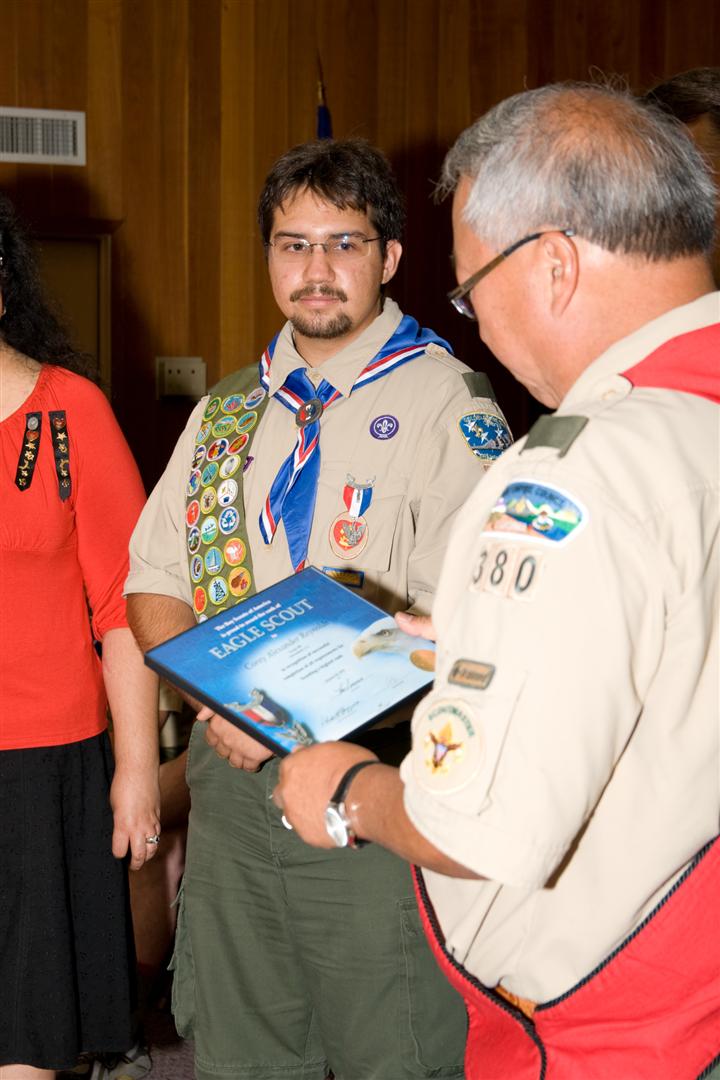 On July 3, 2010, Troop 380 held the Eagle Court of Honor for Corey Reynolds at Emmanuel Baptist Church. At the court of honor Garret R., a cousin of Corey and an Eagle Scout, himself, played trumpet for the opening colors which was followed by a slide show presentation showing some of the major events Corey had participated in. After the slide show was done, previous eagle Scouts were asked to join and form the Eagles’ Nest. The court of honor progressed to the presentation of the Eagle Scout Award to Corey. In addition to being presented the award, Corey and his father both made presentations to people instrumental to Corey earning the award. After the court of honor was concluded, refreshments of cookies, cake, and root beer floats were served. All in all, the evening was happy.