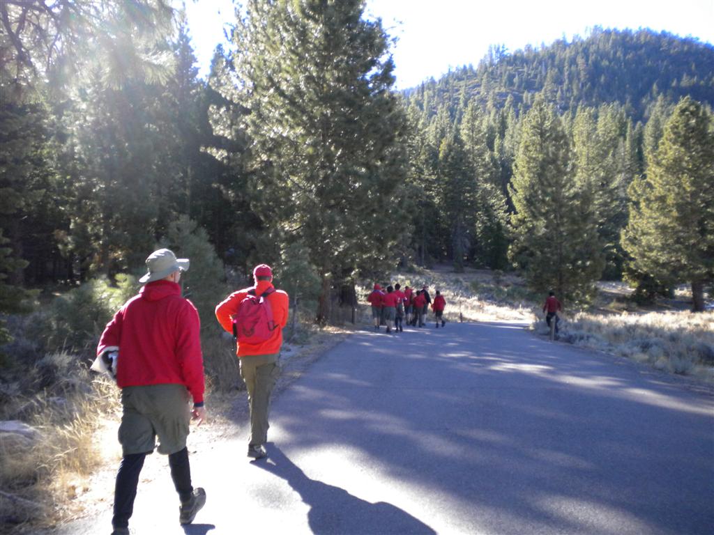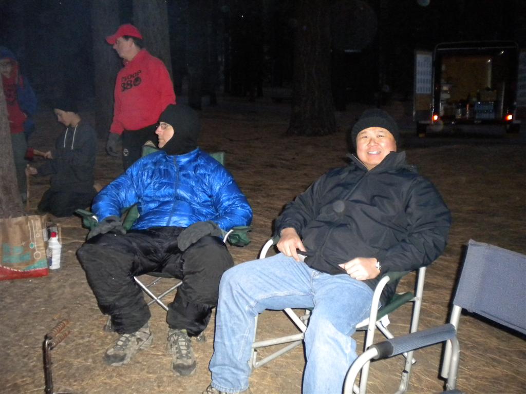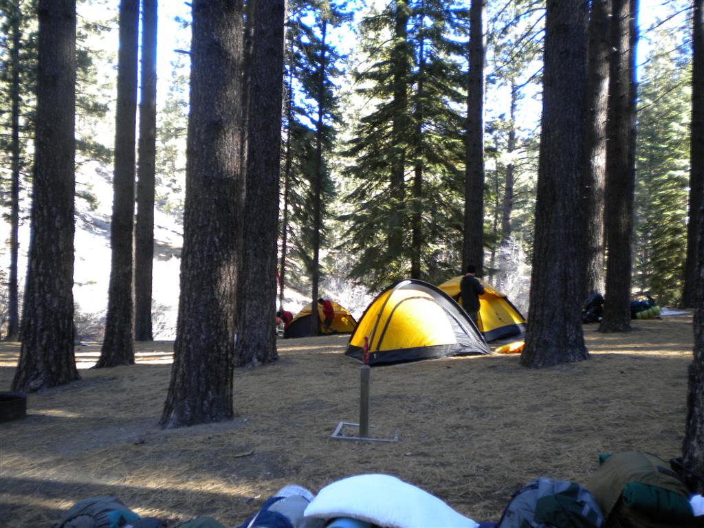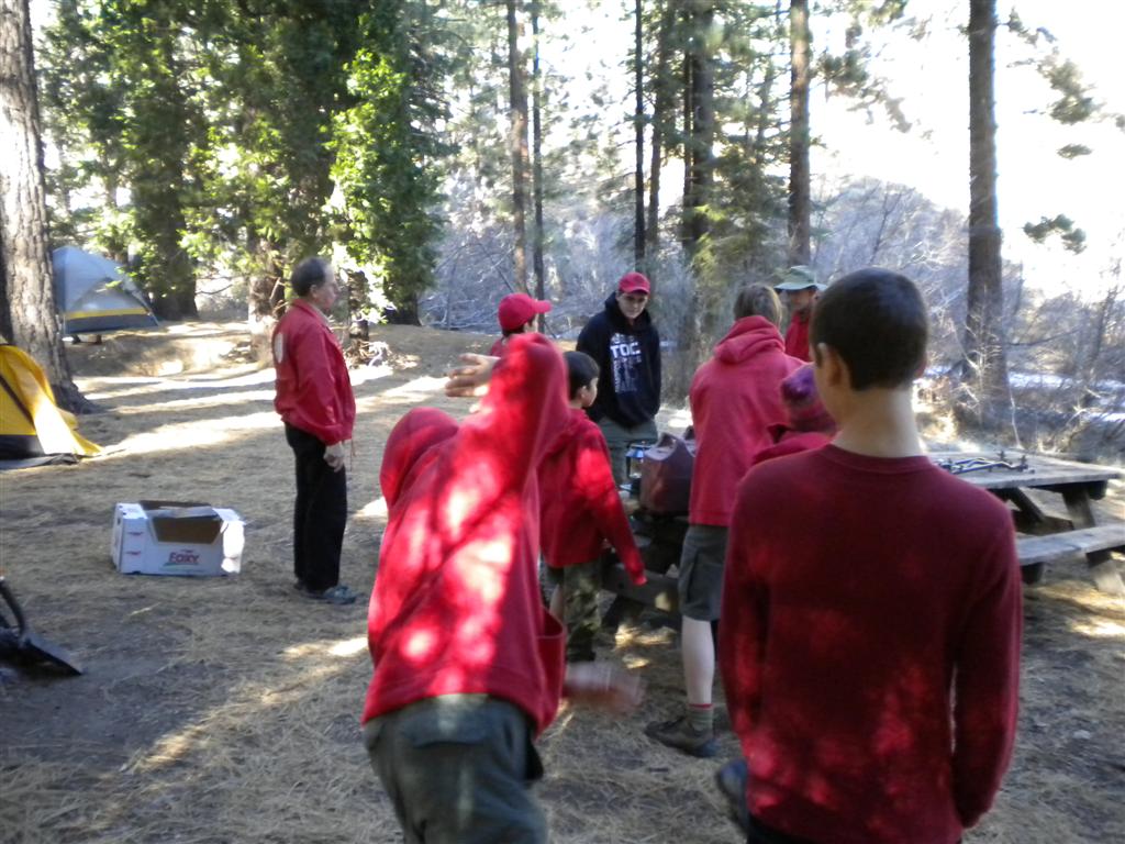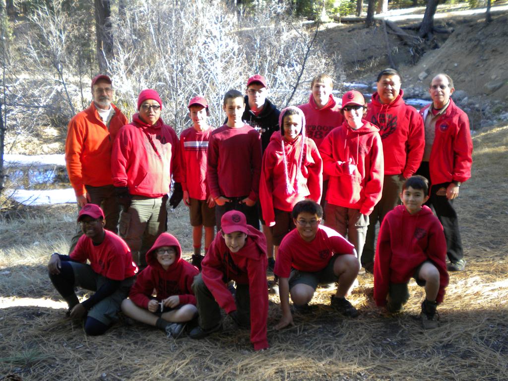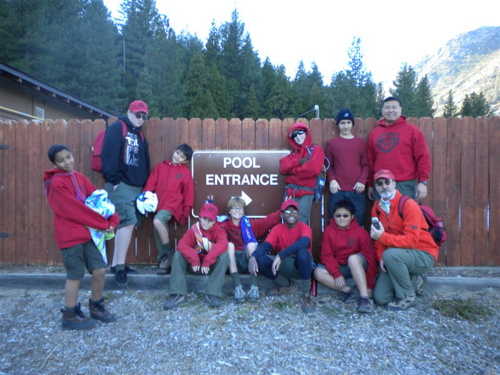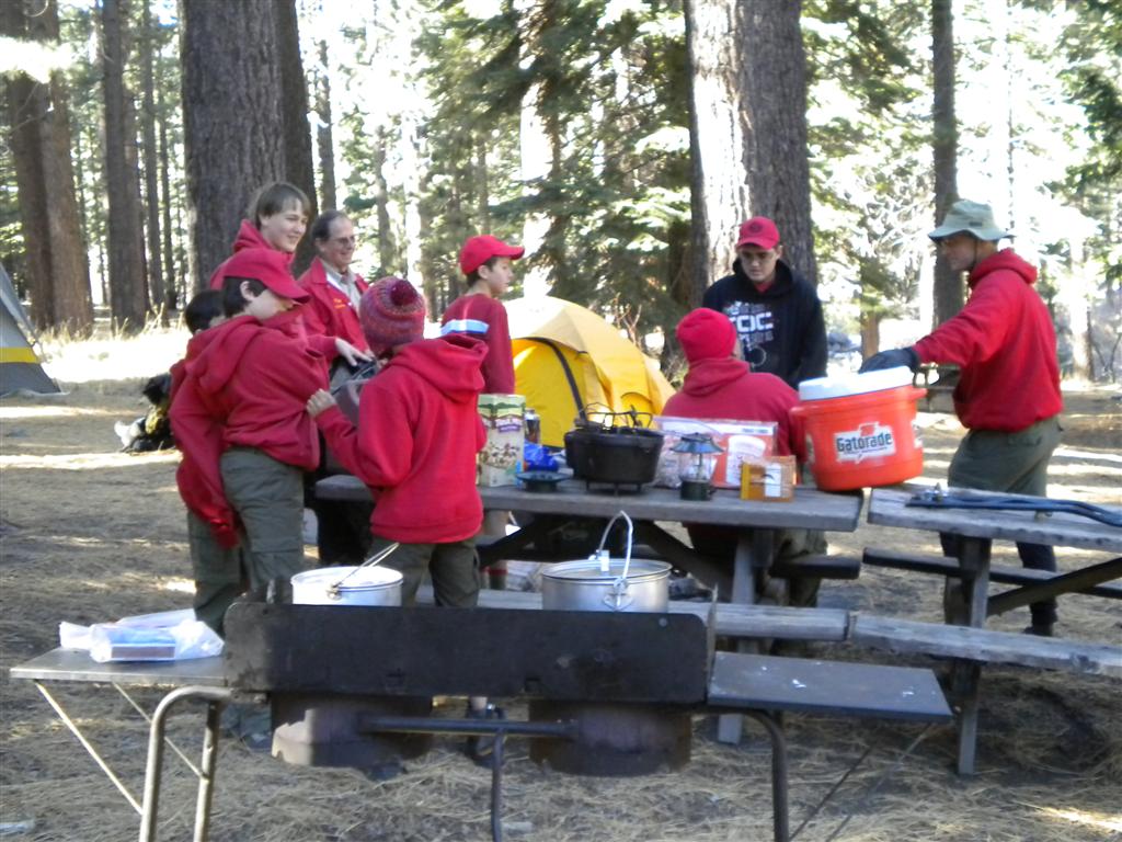 We were finally able to go camping at Grover Hot Springs State Park (last year we were snowed out). No snow this year but it was cold. There were 5 adults and 11 scouts that ventured in the Sierras. Grover Hot Springs is located off Hwy 89 just west of Markleeville. After we setup camp Michael Kuykendall took the scouts on a hike from our campsite to the hot springs and was able to find several geocache sites that are in the park. While waiting to get into the pool area Dave Ishikawa demonstrated to the scouts how to measure trees and other items without the use of any measuring device. Once inside the pool area all 16 of us completed the requirements for the coveted Order of the Ice Cube. When finished we returned to the campsite for a very filling dinner, after dinner the scouts participated in a rousing game of capture the flag against another Troop from Reno. I think we won. The adults tried to stay warm around a nice campfire.