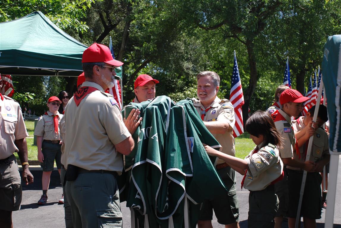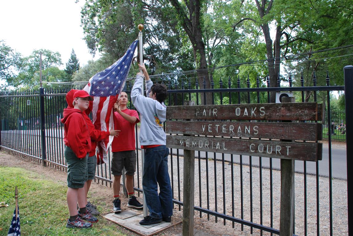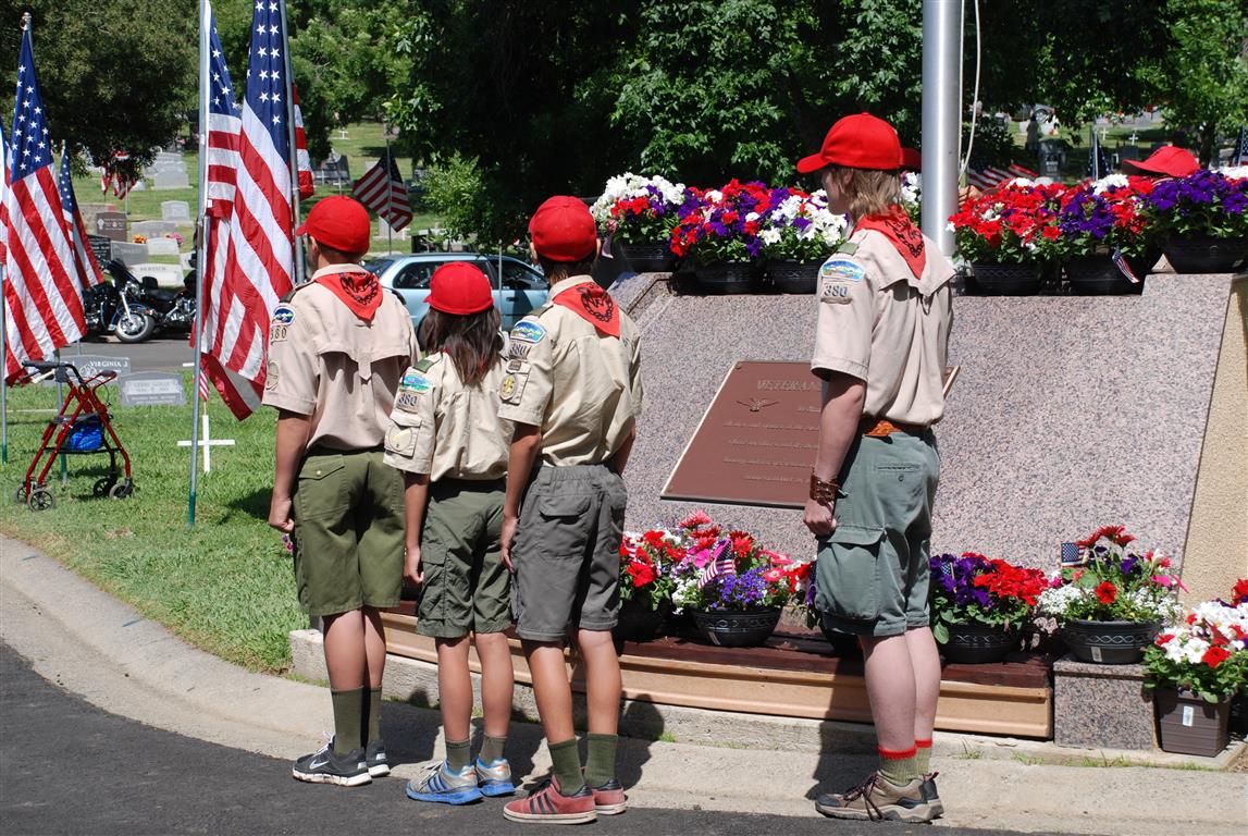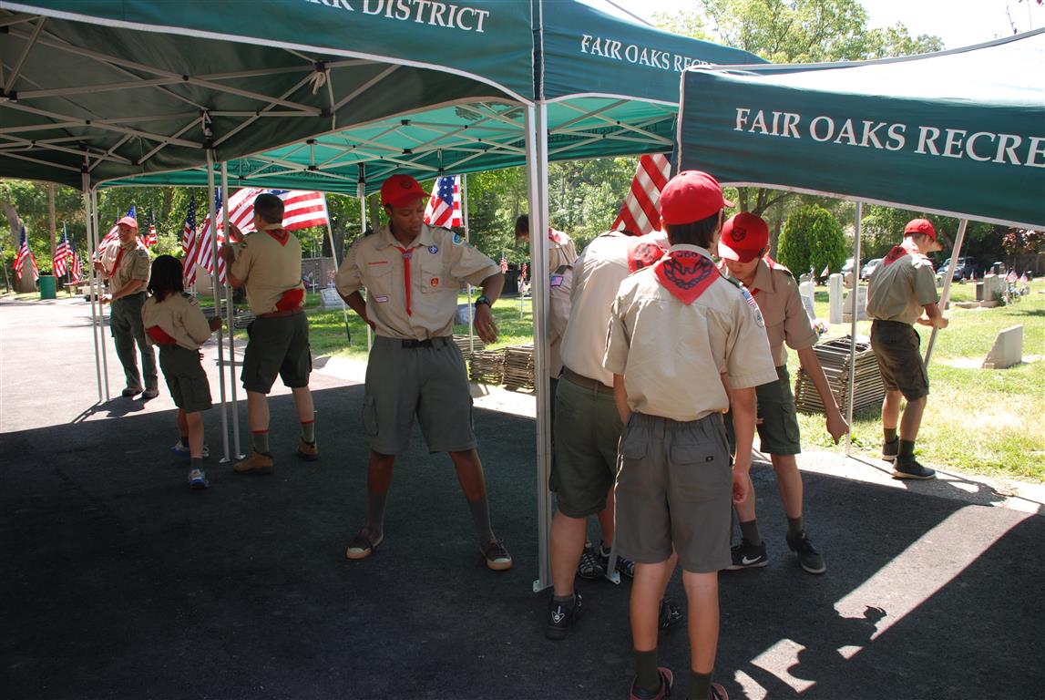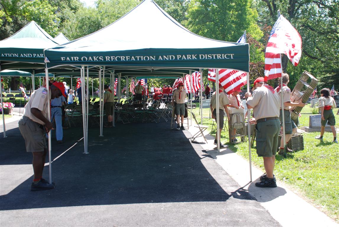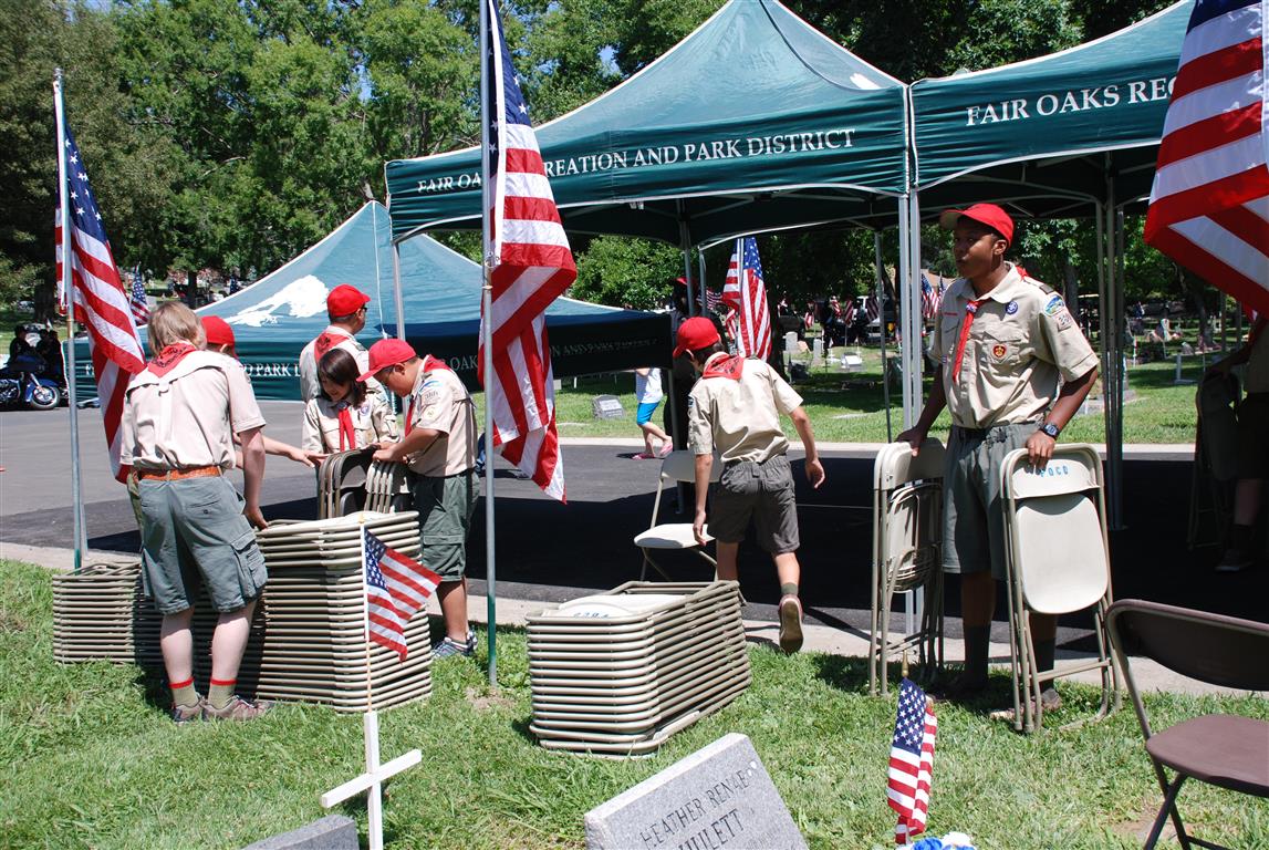 Troop 380 was at the Fair Oaks Cemetery on May 25th and 27th. Troop 380 did the flag ceremony on the morning of May 25th and also directed the parking and handed out programs and afterwards folded chairs and took down the awnings. We helped take down and put up the Avenue of Flags on the 25th afternoon and the morning and afternoon of 27th. There were 35 Scouts and Scouters who helped during the weekend. Troop 380 got lots of compliments from the staff and the people who attended the ceremony. Troop 380 does this annually to remember our fallen hero’s Thank you to everyone who attended and helped with this wonderful event.