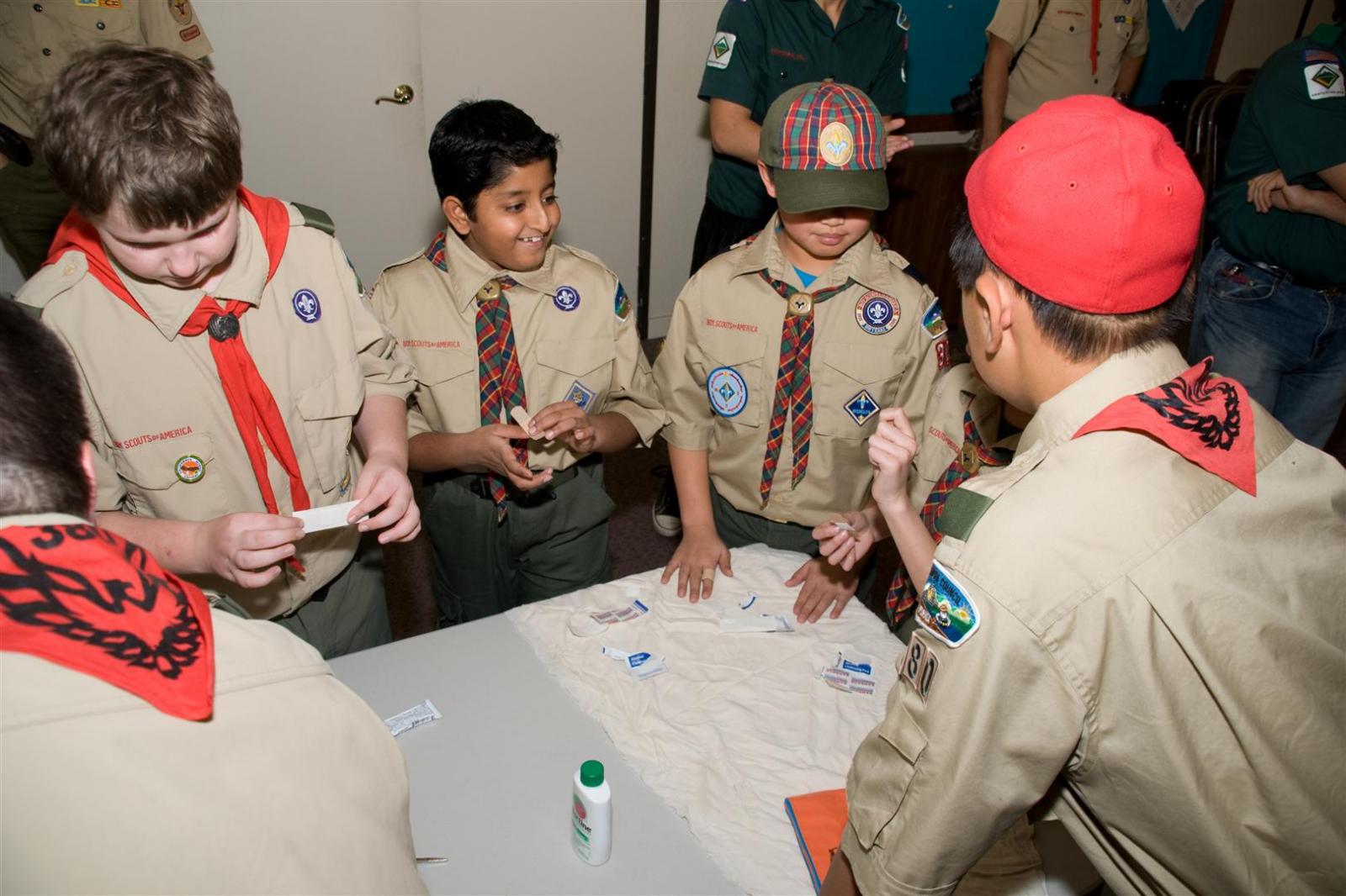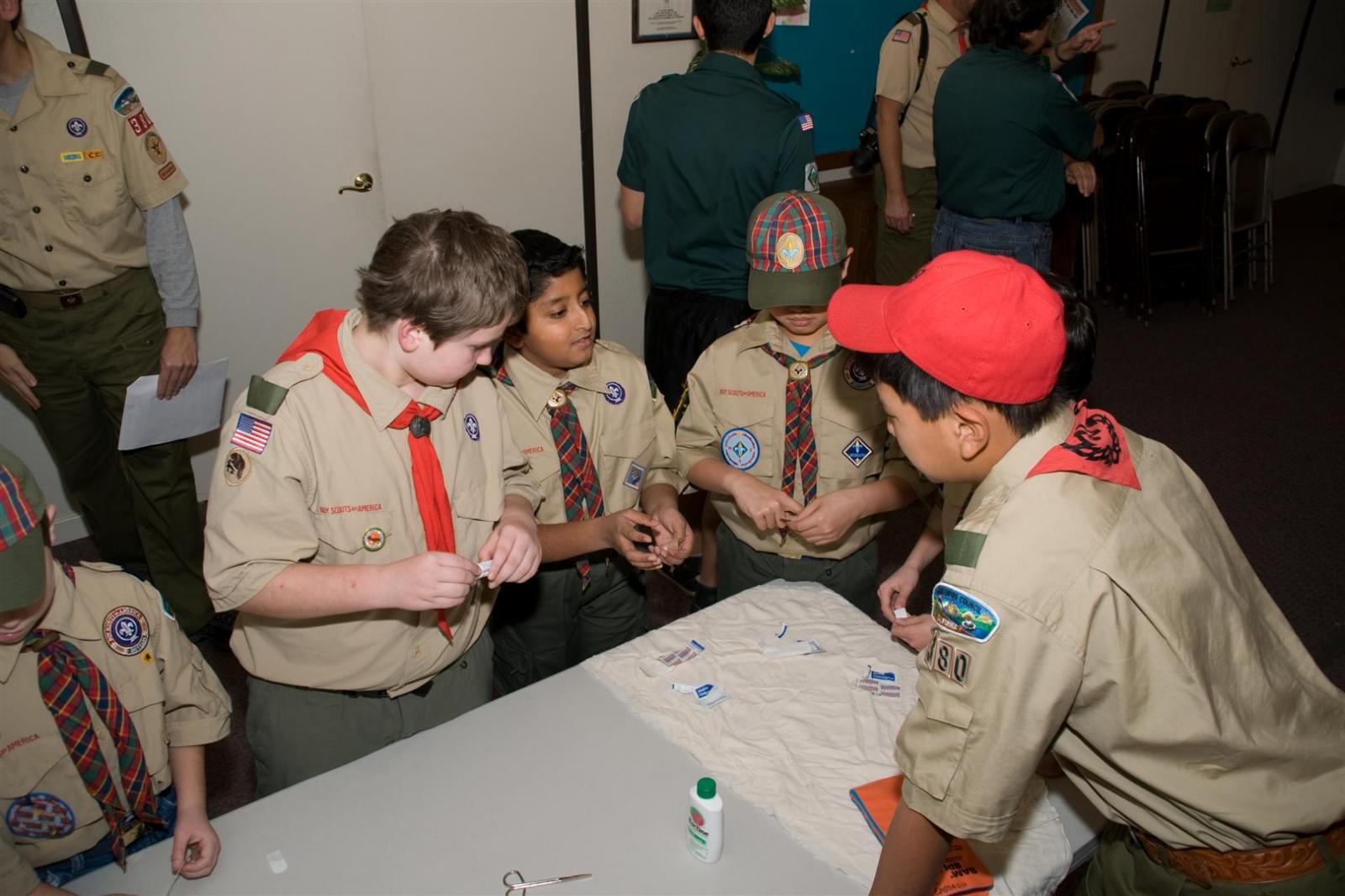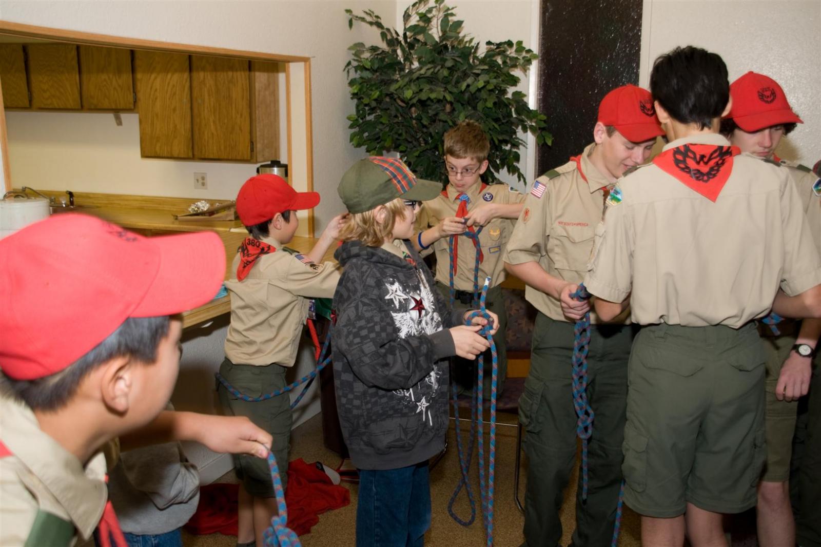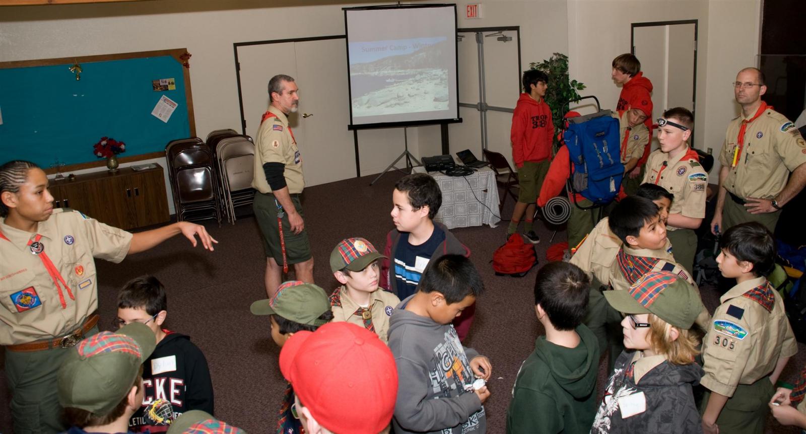 The Webelos Open House was held at the church on January 11. The troop was asked to be there at 6:00 to 6:30 pm. There were displays set up in the chapel and the Cub Scouts were greeted by greeters and shown some new knots. The meeting started at 7:00, and we carried on with flags and upcoming events like a regular meeting. We then showed a slide show of our previous campouts to the Webelos and their parents, and afterwards, the parents were sent into the chapel to discuss details while the Webelos stayed with us to do the program. We had 6 different stations for the Webelos to check out. There were 4 groups of Cub Scouts, each led by a leader. We did rotations every 10 minutes or so. The six areas were first aid, uniform, Dutch-oven cooking, car lot, gear and knots. After we finished with program, we had all of the Scouts go and get a quick bite to eat then we circled up. By now, the parents were coming back from the chapel. We did a closing circle like we would in a regular meeting, thanked the Webelos for coming, sang Scout Vespers, and cleaned up and went home around 8:45 p.m.