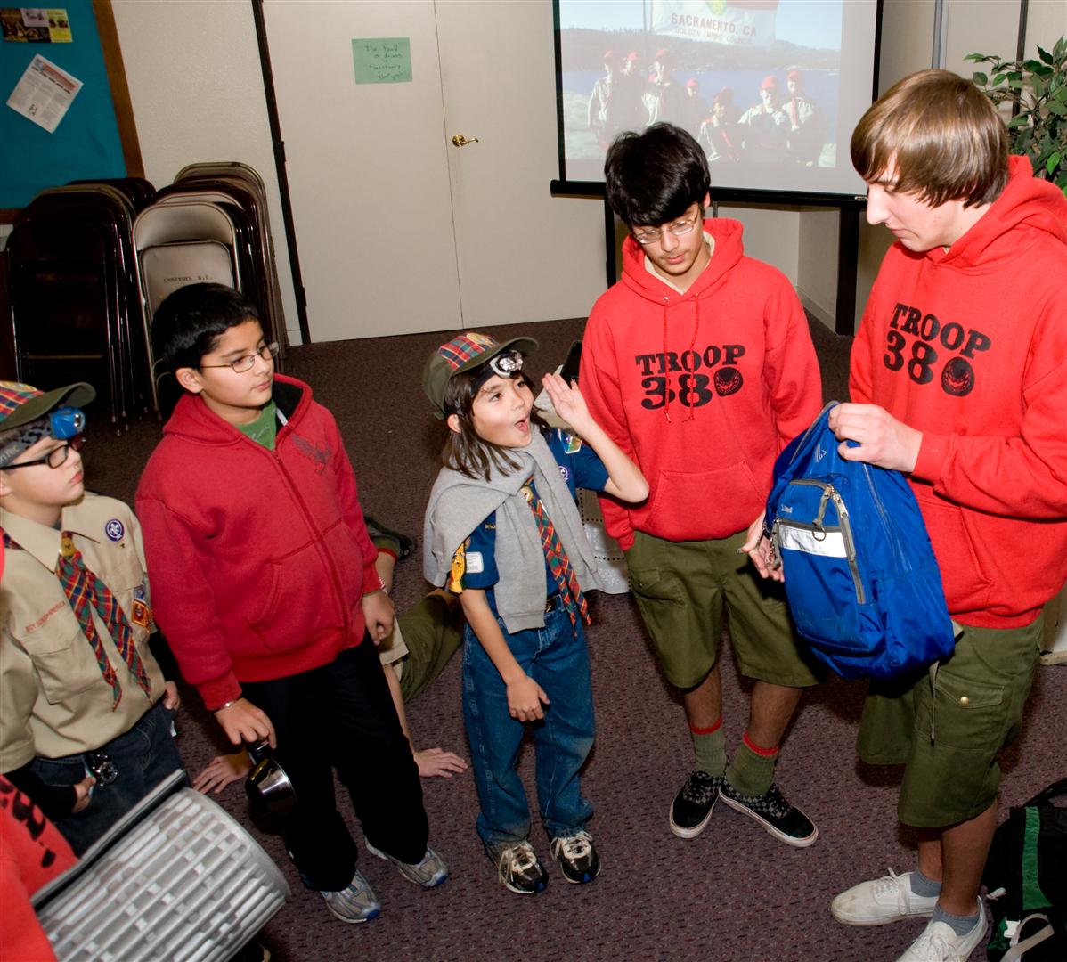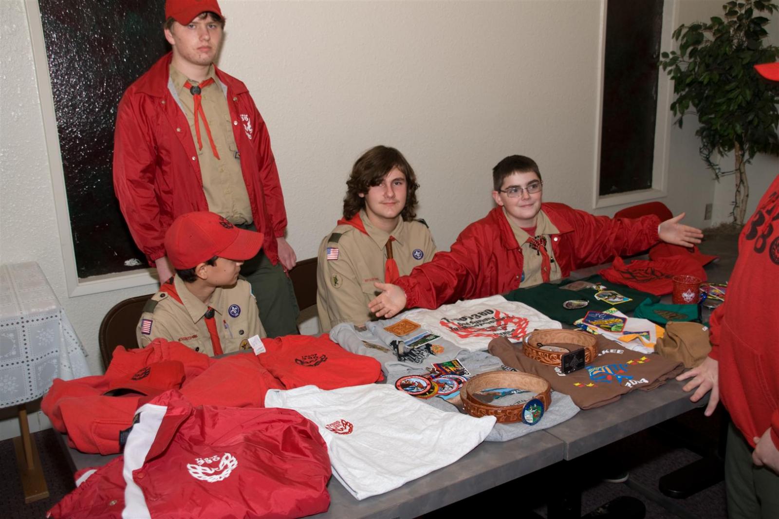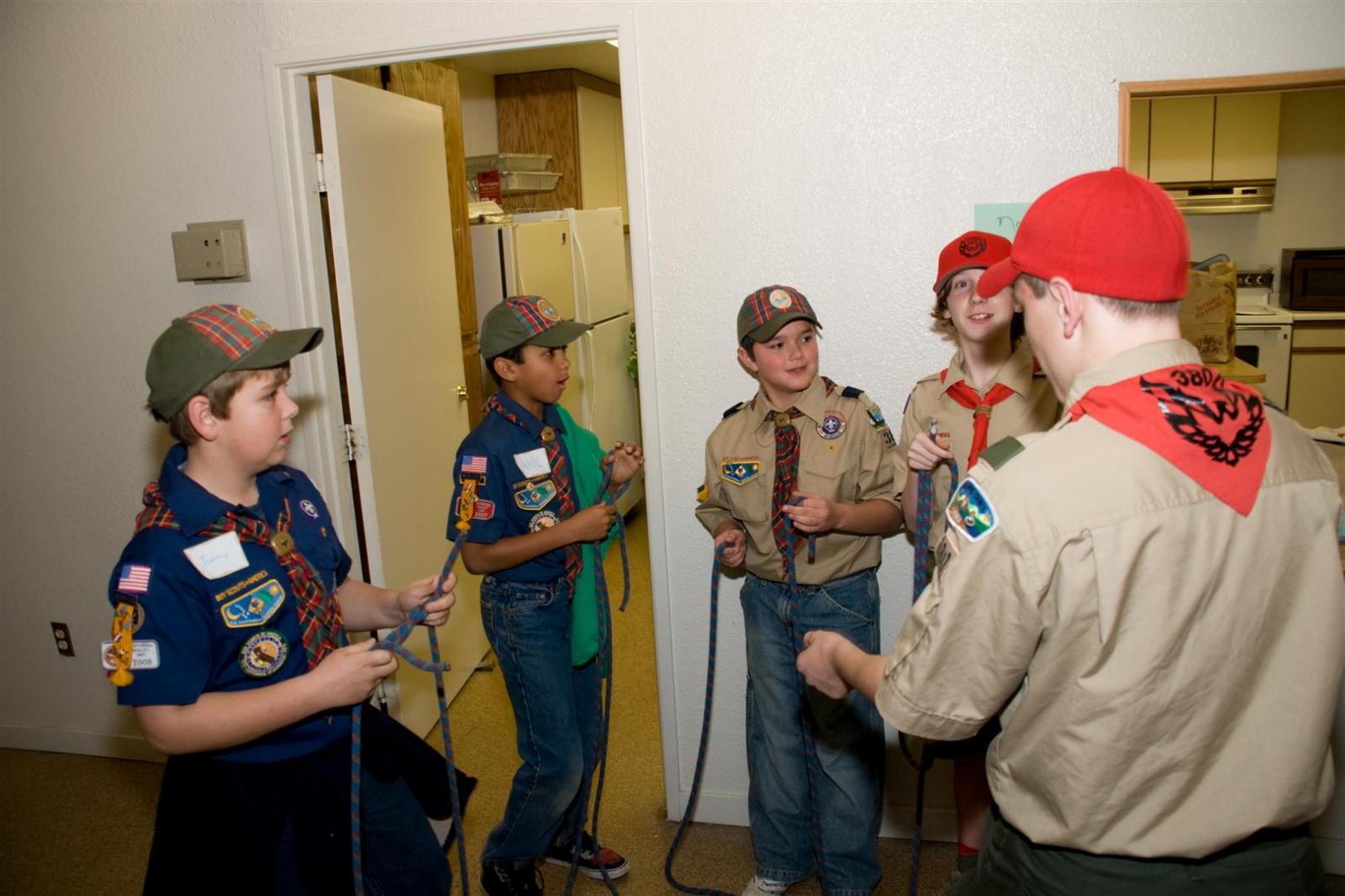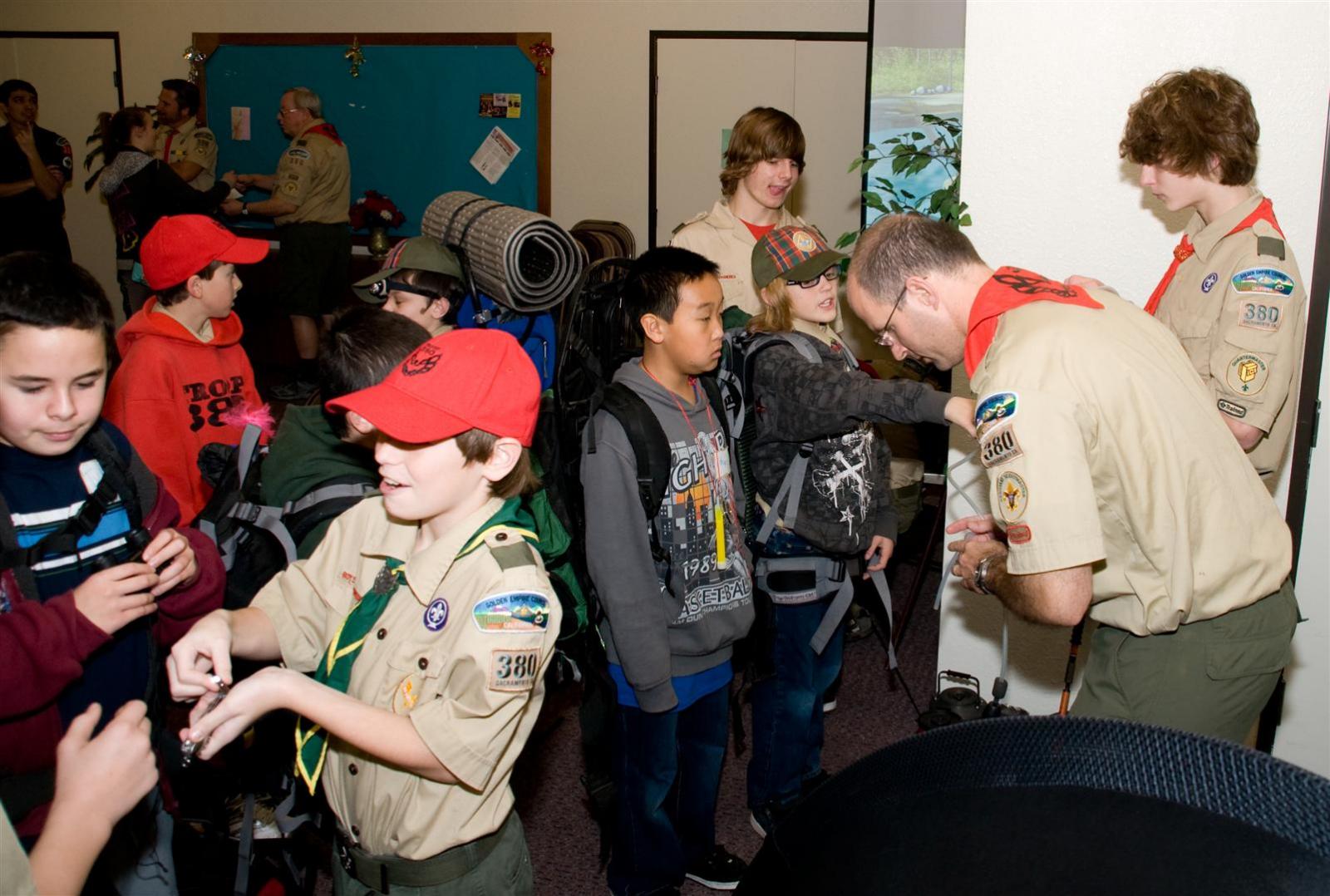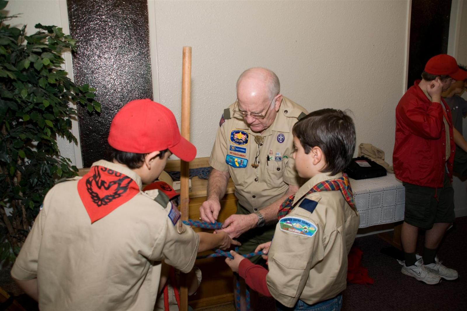 The Webelos Open House was held at the church on January 11. The troop was asked to be there at 6:00 to 6:30 pm. There were displays set up in the chapel and the Cub Scouts were greeted by greeters and shown some new knots. The meeting started at 7:00, and we carried on with flags and upcoming events like a regular meeting. We then showed a slide show of our previous campouts to the Webelos and their parents, and afterwards, the parents were sent into the chapel to discuss details while the Webelos stayed with us to do the program. We had 6 different stations for the Webelos to check out. There were 4 groups of Cub Scouts, each led by a leader. We did rotations every 10 minutes or so. The six areas were first aid, uniform, Dutch-oven cooking, car lot, gear and knots. After we finished with program, we had all of the Scouts go and get a quick bite to eat then we circled up. By now, the parents were coming back from the chapel. We did a closing circle like we would in a regular meeting, thanked the Webelos for coming, sang Scout Vespers, and cleaned up and went home around 8:45 p.m.
