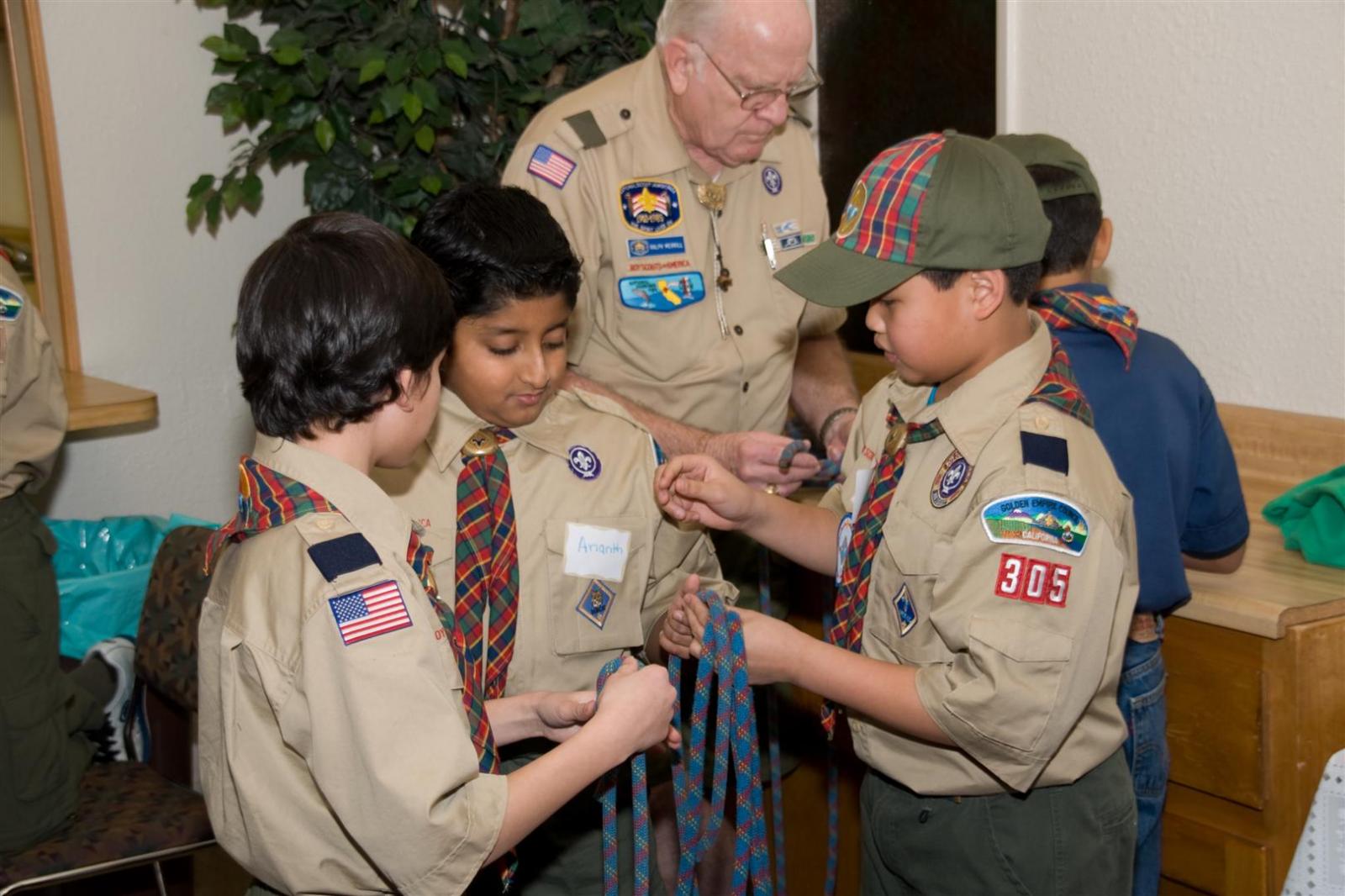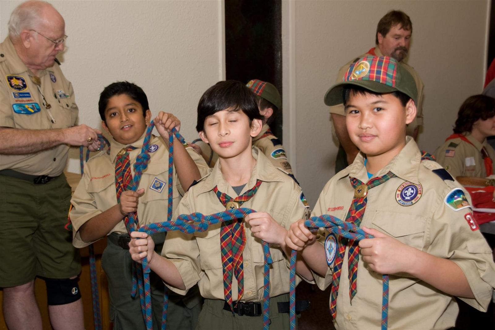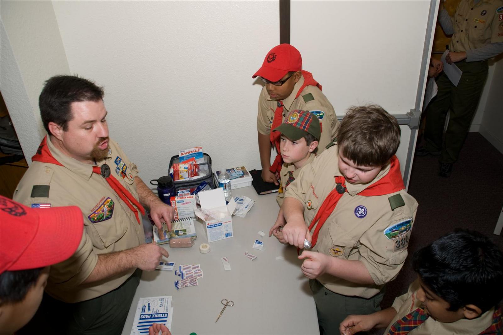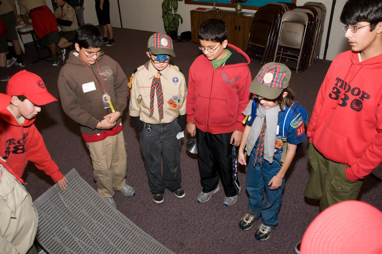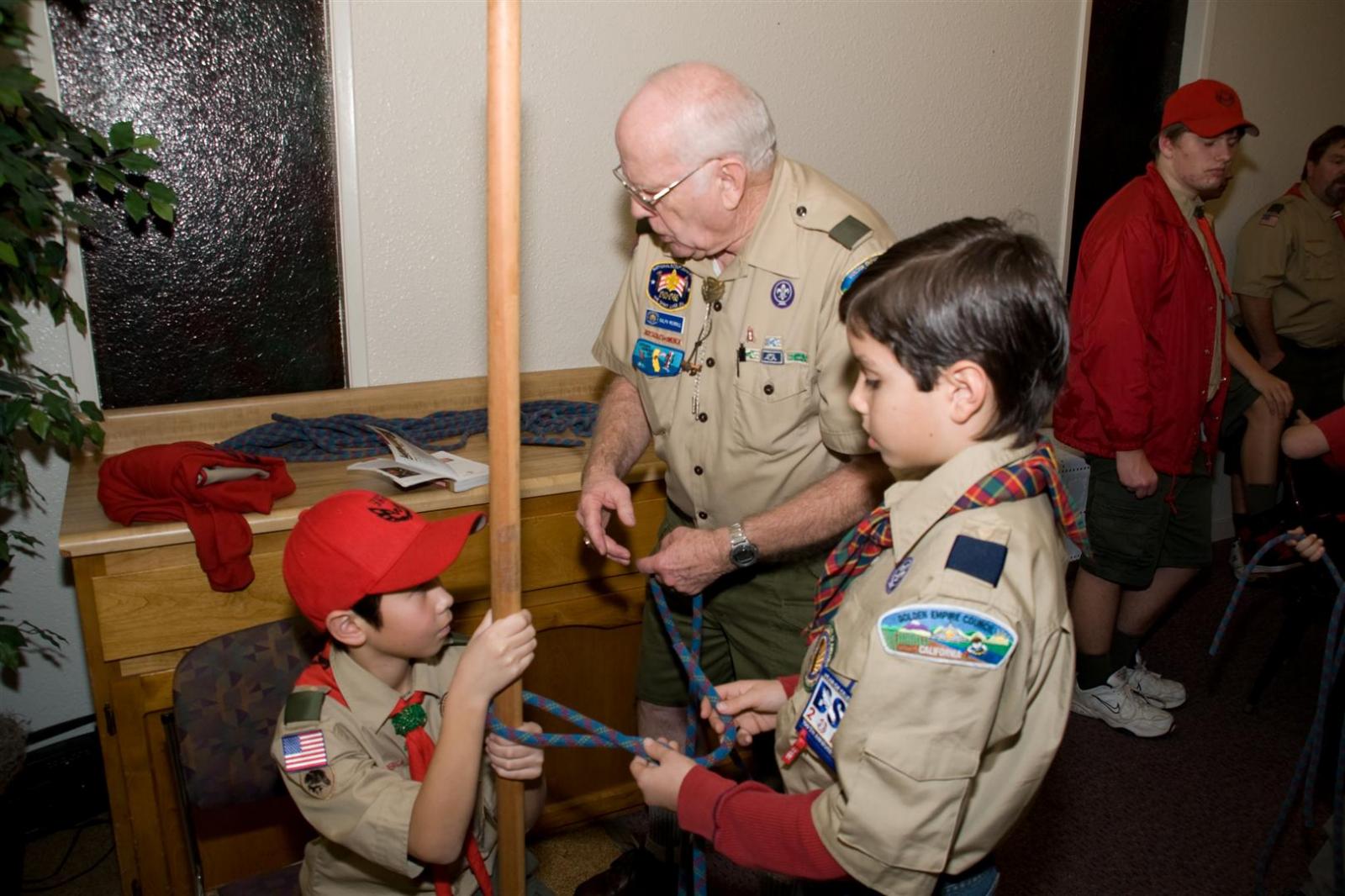 The Webelos Open House was held at the church on January 11. The troop was asked to be there at 6:00 to 6:30 pm. There were displays set up in the chapel and the Cub Scouts were greeted by greeters and shown some new knots. The meeting started at 7:00, and we carried on with flags and upcoming events like a regular meeting. We then showed a slide show of our previous campouts to the Webelos and their parents, and afterwards, the parents were sent into the chapel to discuss details while the Webelos stayed with us to do the program. We had 6 different stations for the Webelos to check out. There were 4 groups of Cub Scouts, each led by a leader. We did rotations every 10 minutes or so. The six areas were first aid, uniform, Dutch-oven cooking, car lot, gear and knots. After we finished with program, we had all of the Scouts go and get a quick bite to eat then we circled up. By now, the parents were coming back from the chapel. We did a closing circle like we would in a regular meeting, thanked the Webelos for coming, sang Scout Vespers, and cleaned up and went home around 8:45 p.m.