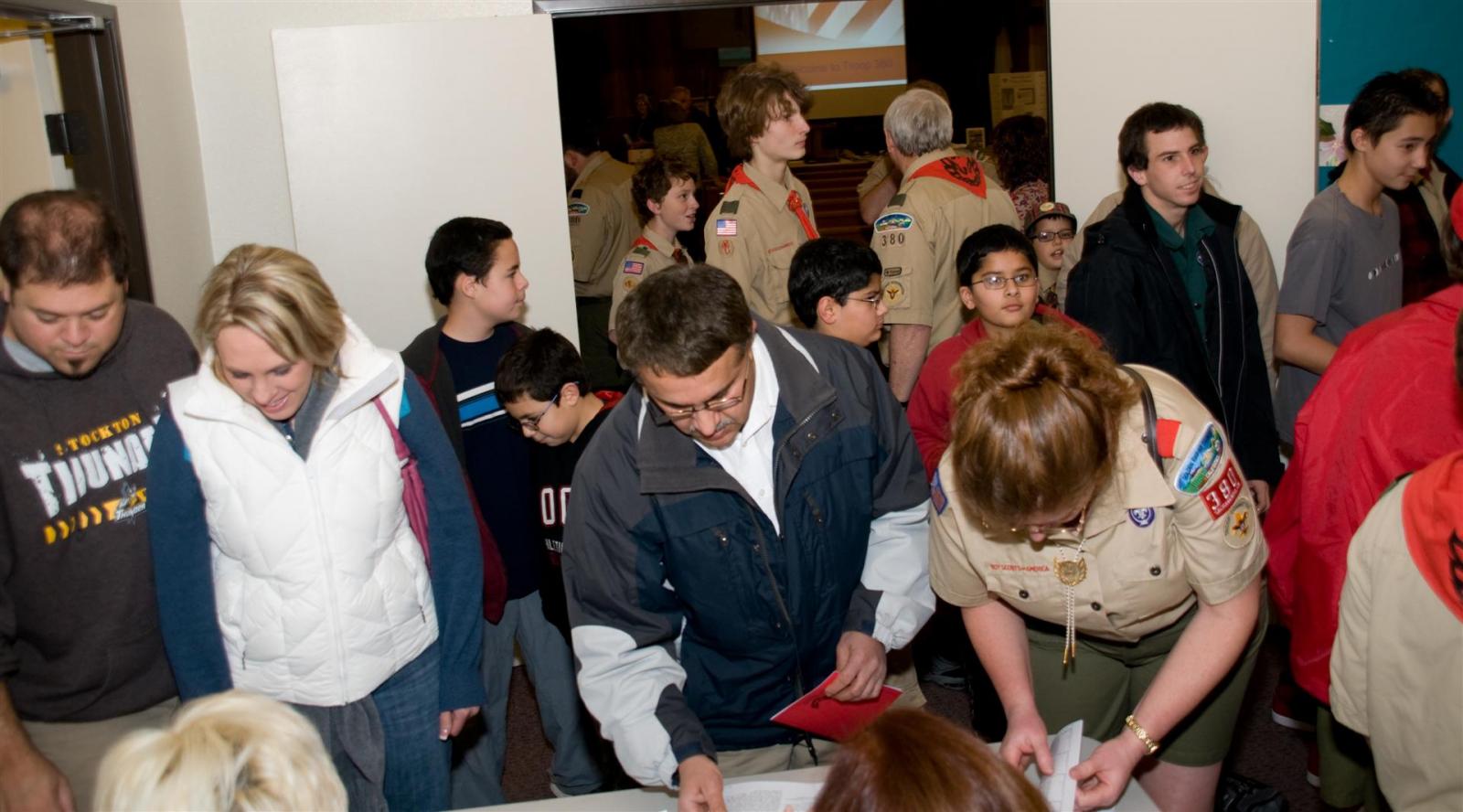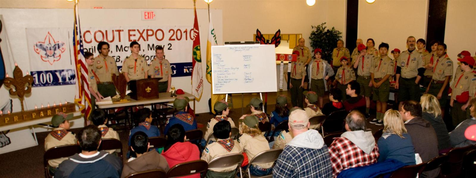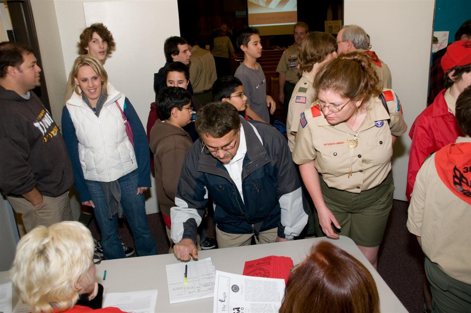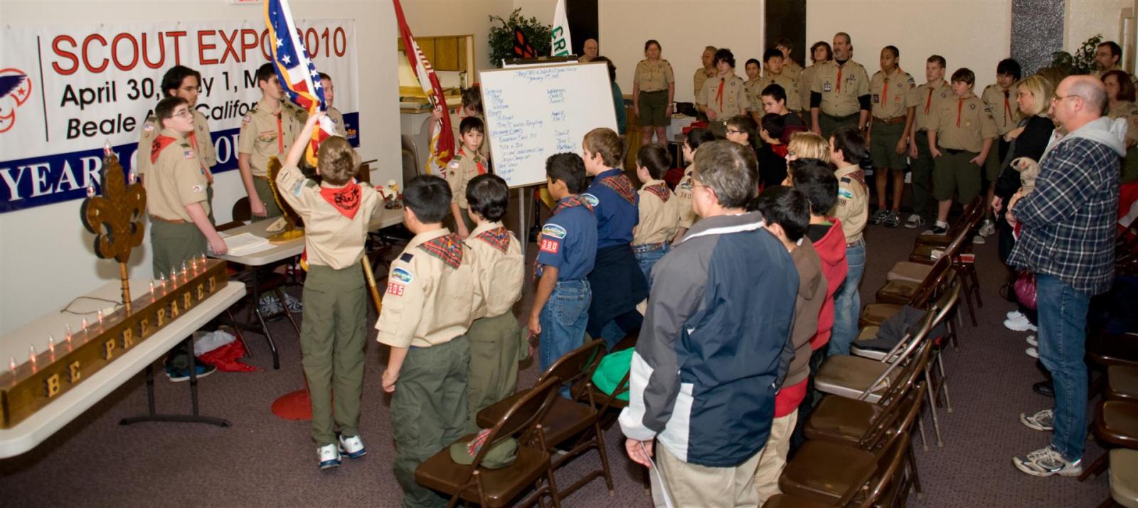 The Webelos Open House was held at the church on January 11. The troop was asked to be there at 6:00 to 6:30 pm. There were displays set up in the chapel and the Cub Scouts were greeted by greeters and shown some new knots. The meeting started at 7:00, and we carried on with flags and upcoming events like a regular meeting. We then showed a slide show of our previous campouts to the Webelos and their parents, and afterwards, the parents were sent into the chapel to discuss details while the Webelos stayed with us to do the program. We had 6 different stations for the Webelos to check out. There were 4 groups of Cub Scouts, each led by a leader. We did rotations every 10 minutes or so. The six areas were first aid, uniform, Dutch-oven cooking, car lot, gear and knots. After we finished with program, we had all of the Scouts go and get a quick bite to eat then we circled up. By now, the parents were coming back from the chapel. We did a closing circle like we would in a regular meeting, thanked the Webelos for coming, sang Scout Vespers, and cleaned up and went home around 8:45 p.m.