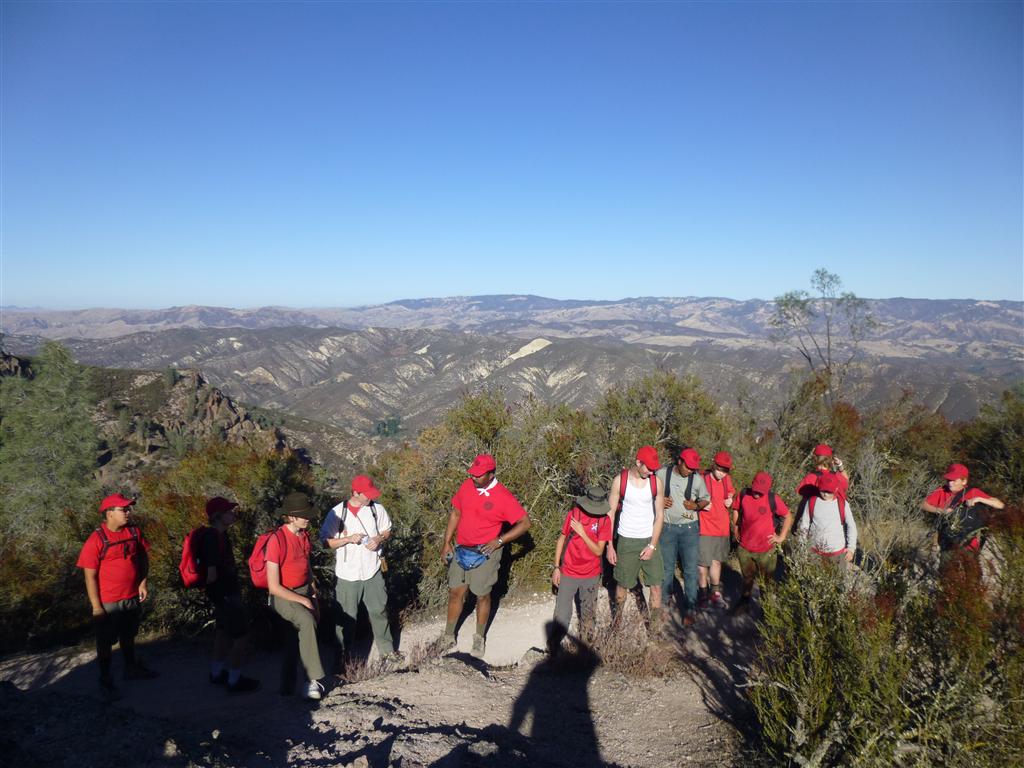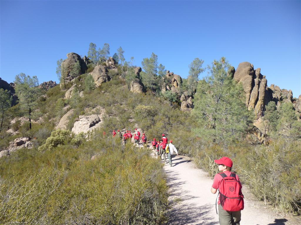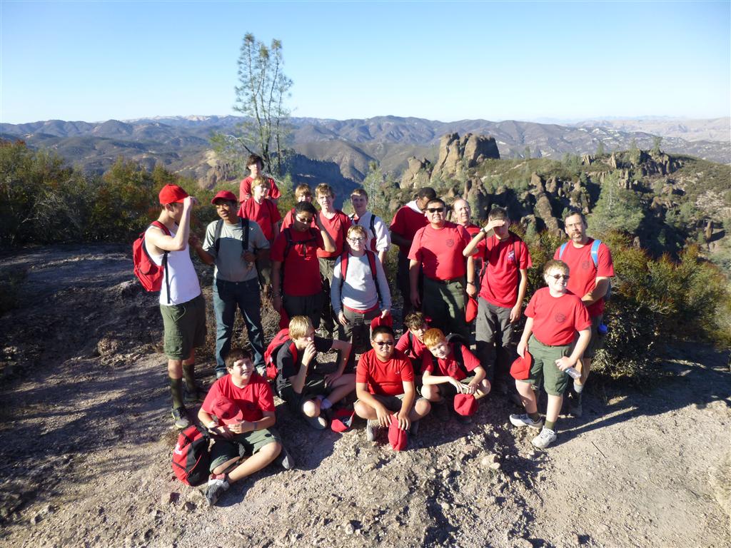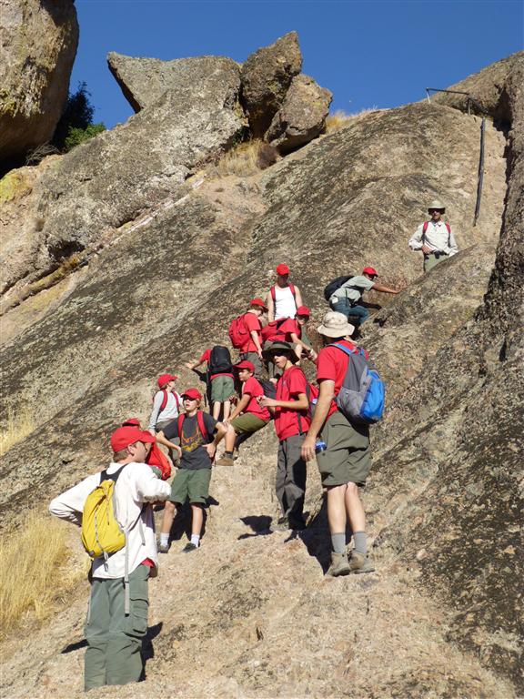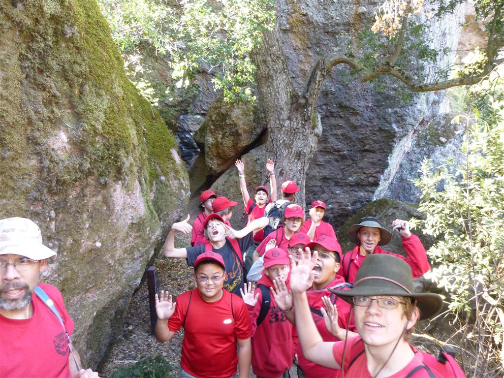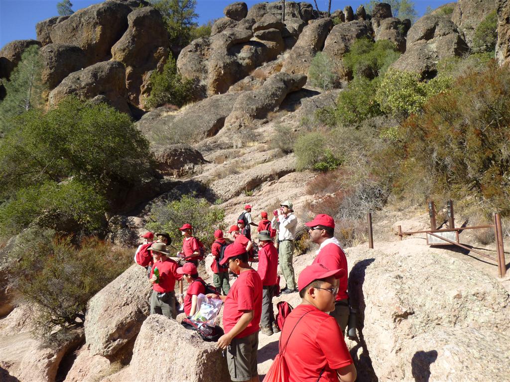 After spending the weekend in Monterey Bay, on Veterans Day, 16 scouts and 5 adults drove to Pinnacles National Monument and completed a 6.1 mile rim of the bay hike. We started in the Bear Gulch parking lot, hiked through the caves (thanks for the flashlight Evan!) and took a breather at the Bear Gulch reservoir. We then hiked uphill to the rim portion of the trail and then back down for an early dinner of sandwiches and chips. We saw no condors, but our resident geologist Ben Heningburg pointed out various rock, ash and mud formations along the way. A thanks goes out to Adam Boles our scout leader and the other adult leaders who helped make this hike happen.