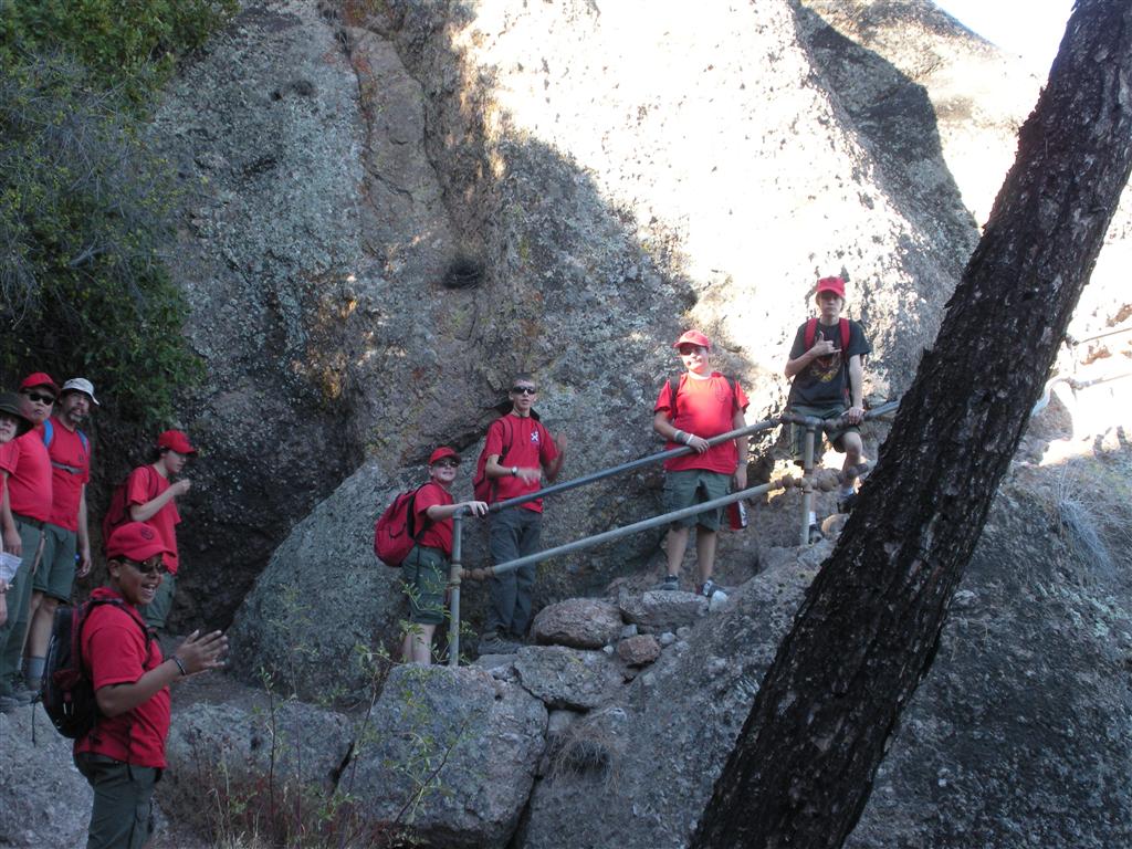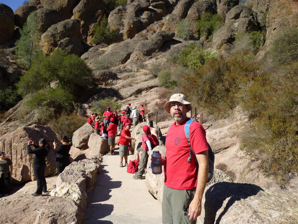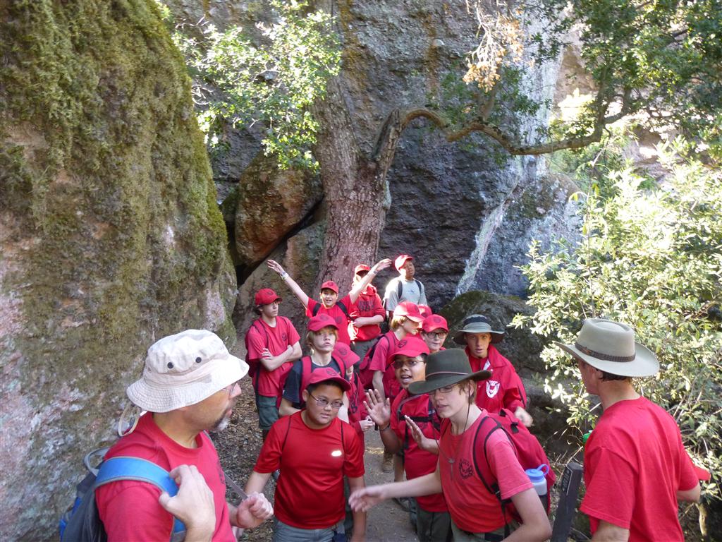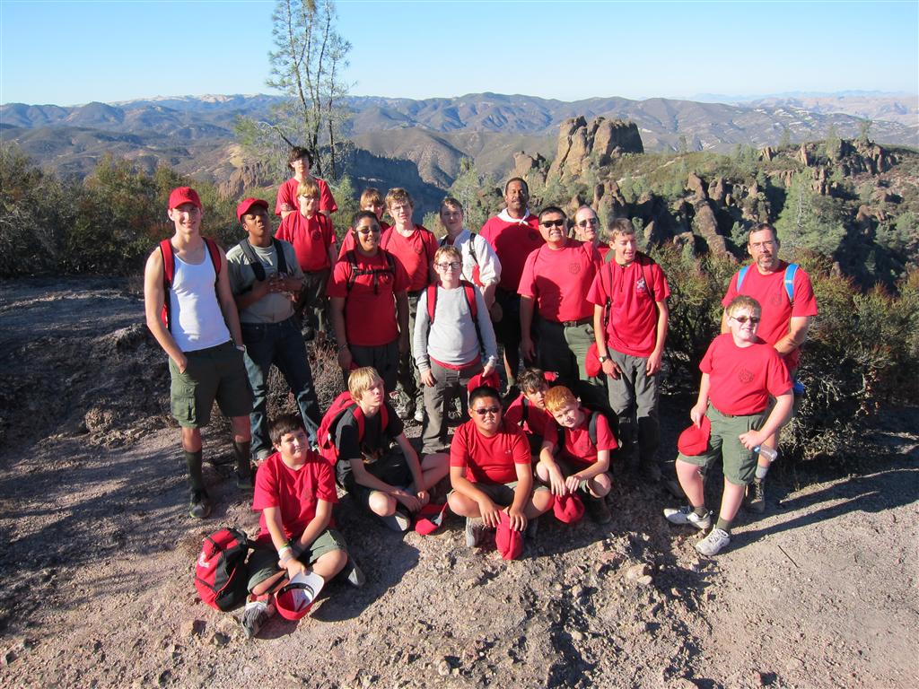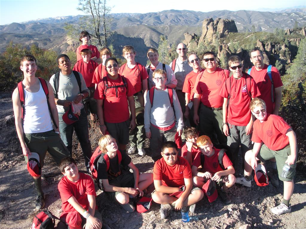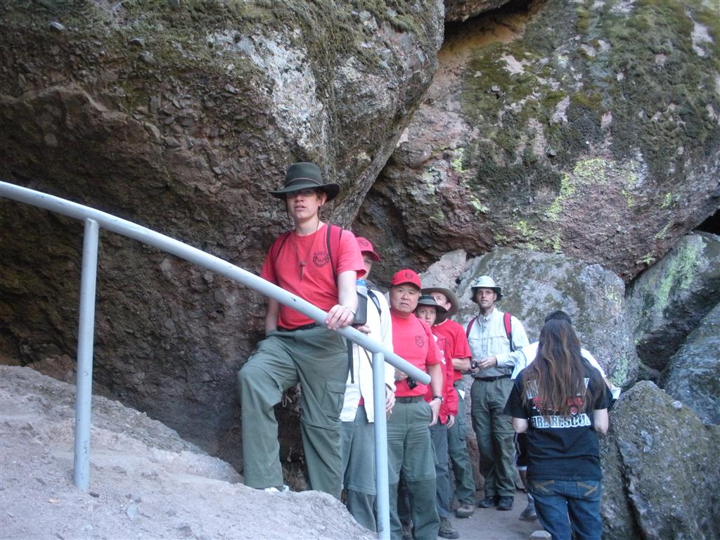 After spending the weekend in Monterey Bay, on Veterans Day, 16 scouts and 5 adults drove to Pinnacles National Monument and completed a 6.1 mile rim of the bay hike. We started in the Bear Gulch parking lot, hiked through the caves (thanks for the flashlight Evan!) and took a breather at the Bear Gulch reservoir. We then hiked uphill to the rim portion of the trail and then back down for an early dinner of sandwiches and chips. We saw no condors, but our resident geologist Ben Heningburg pointed out various rock, ash and mud formations along the way. A thanks goes out to Adam Boles our scout leader and the other adult leaders who helped make this hike happen.