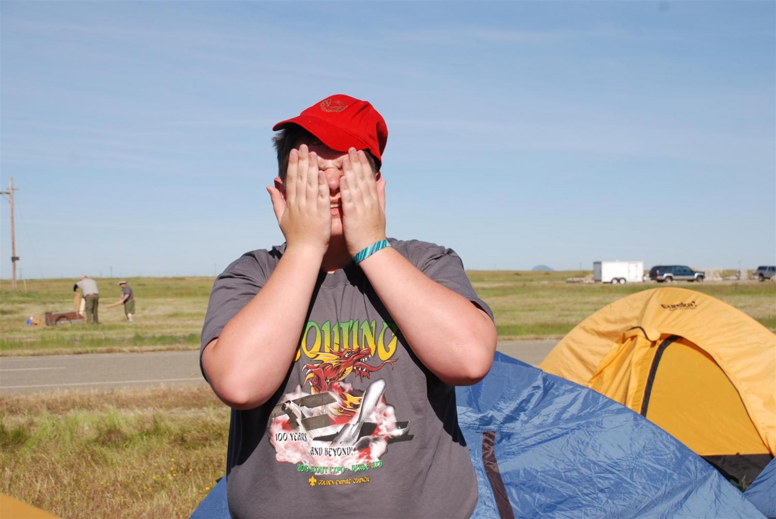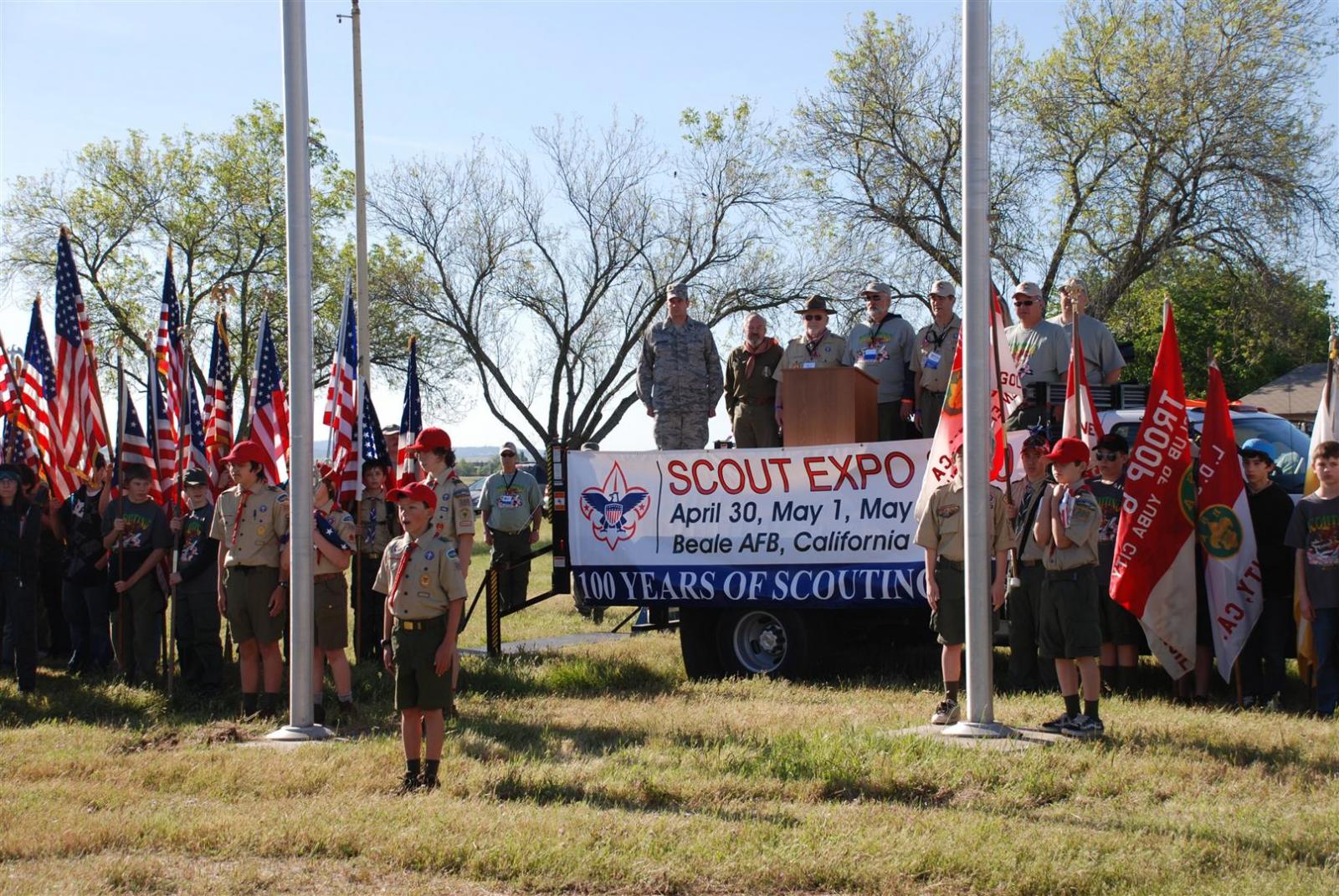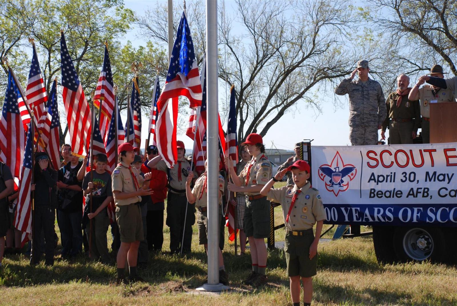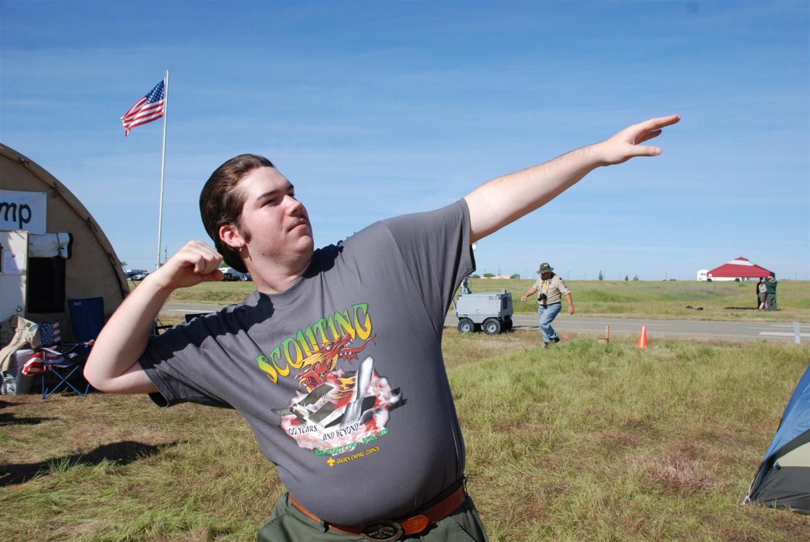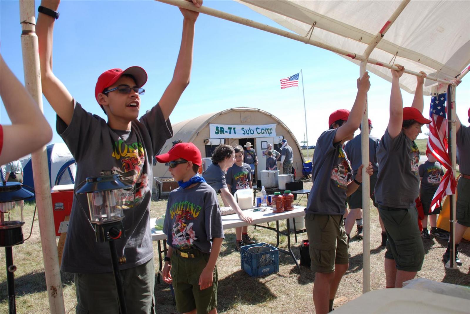 On April 30, forty-nine Scouts and 10 adults from Troop 380, descended on Beale AFB for the Scout Expo 2010. We arrived at Beale at 6:30 PM. We would have been earlier if it were not for the expert directions provided by MapQuest and our fearless Scoutmaster Michael Kuykendall. Attempting the North entry of the Base, the intrepid crew was denied entrance. Quick thinking ASM Mark Woosley maneuvered a perfect U-turn and the Troop was on their way. Once arriving at the front gate, we had no problems entering and soon found Dragon Town, the site of the Scout Expo. Troop 380 sprang into action and with little trouble arranged the tents into a faultless ―double U‖ at the gate to SR-71.