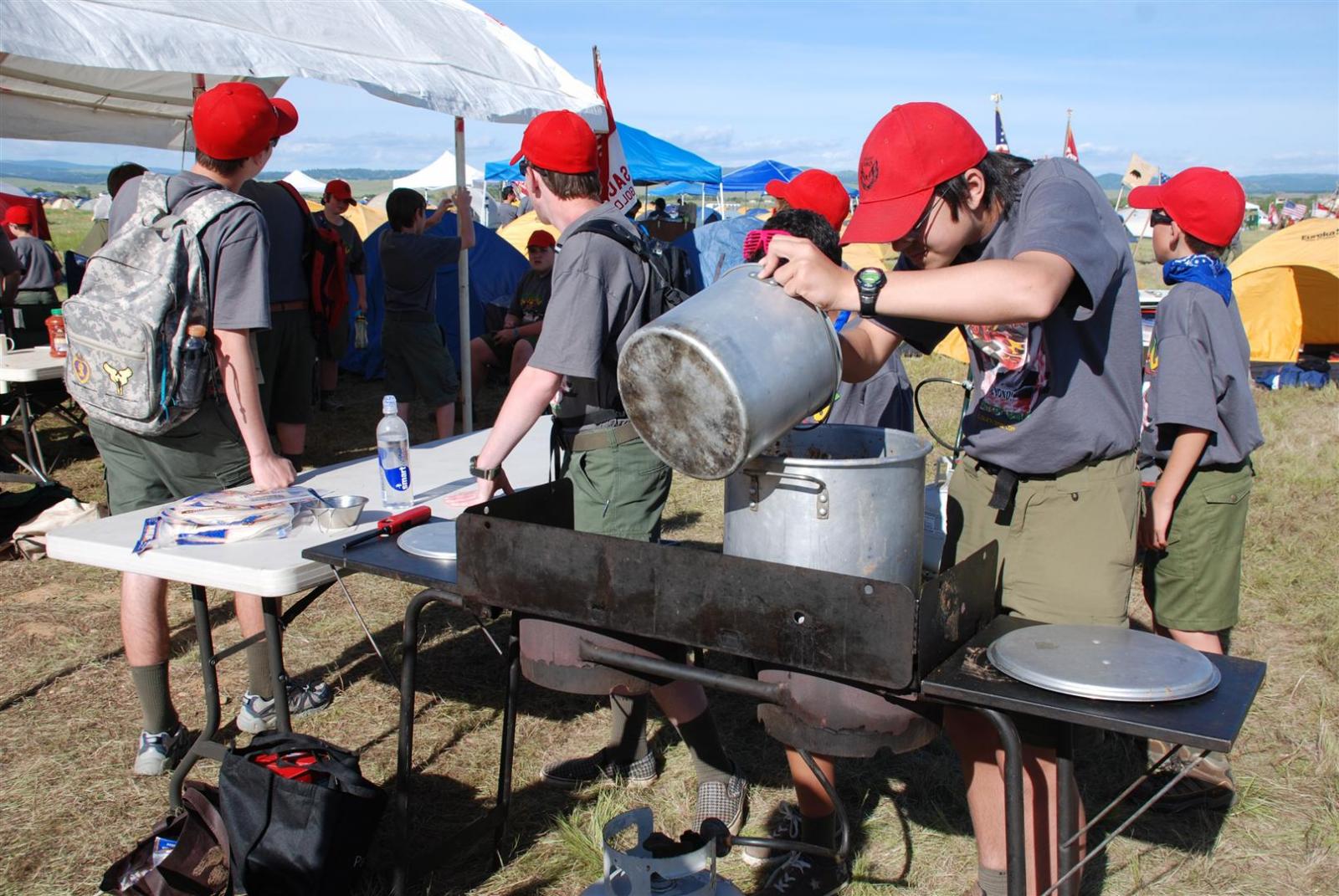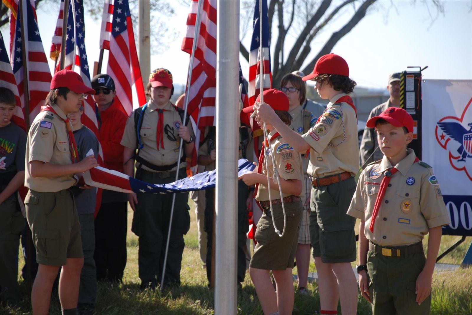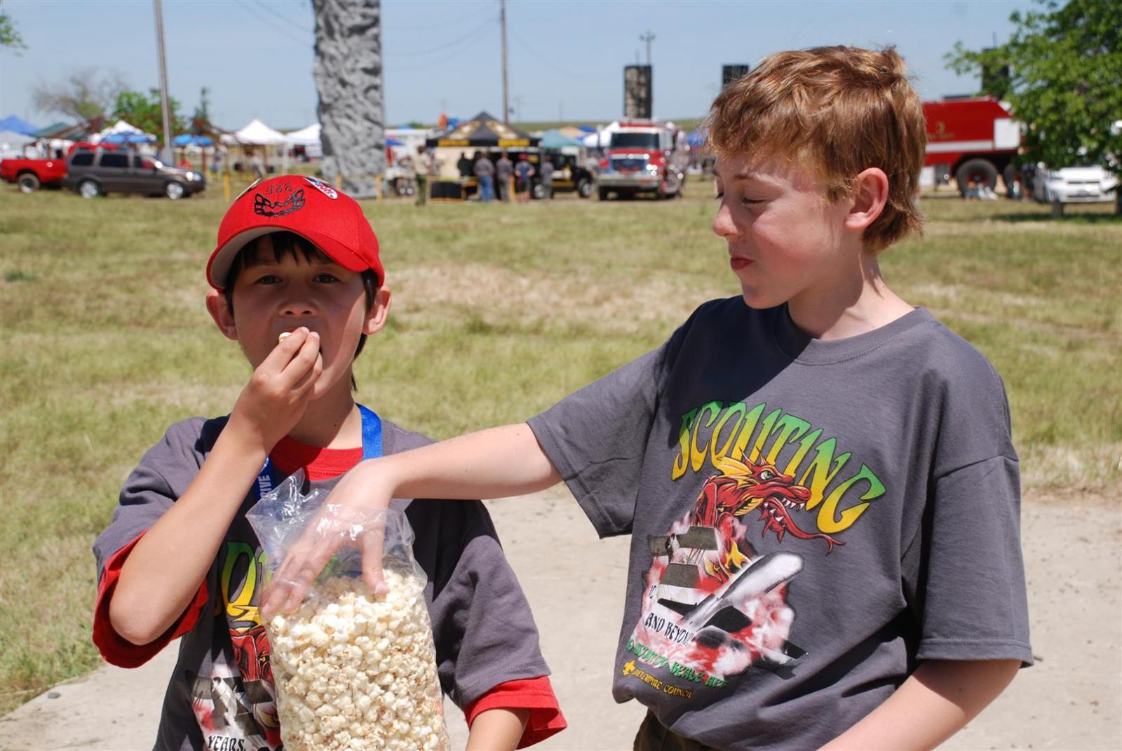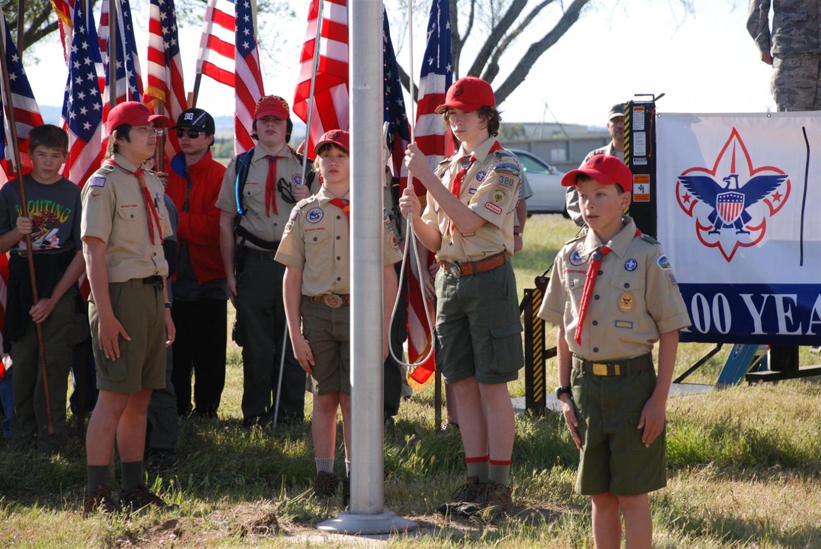 Saturday awoke to the sound of revelry. A hearty breakfast of oats, mini-wheats, and milk was served. Tickets were passed out for lunch at the Trading Post. The Troop participated in opening flags. The rest of the day was spent hiking to the flight line for a static display, merit badge alley, BMX biking, shooting bow/arrow, .22, and throwing tomahawks. Dinner was Mexican Tacos. The evening concluded with a stroll to the flight line for the arena show. A number of Troop 380 Scouts were a part of the show.