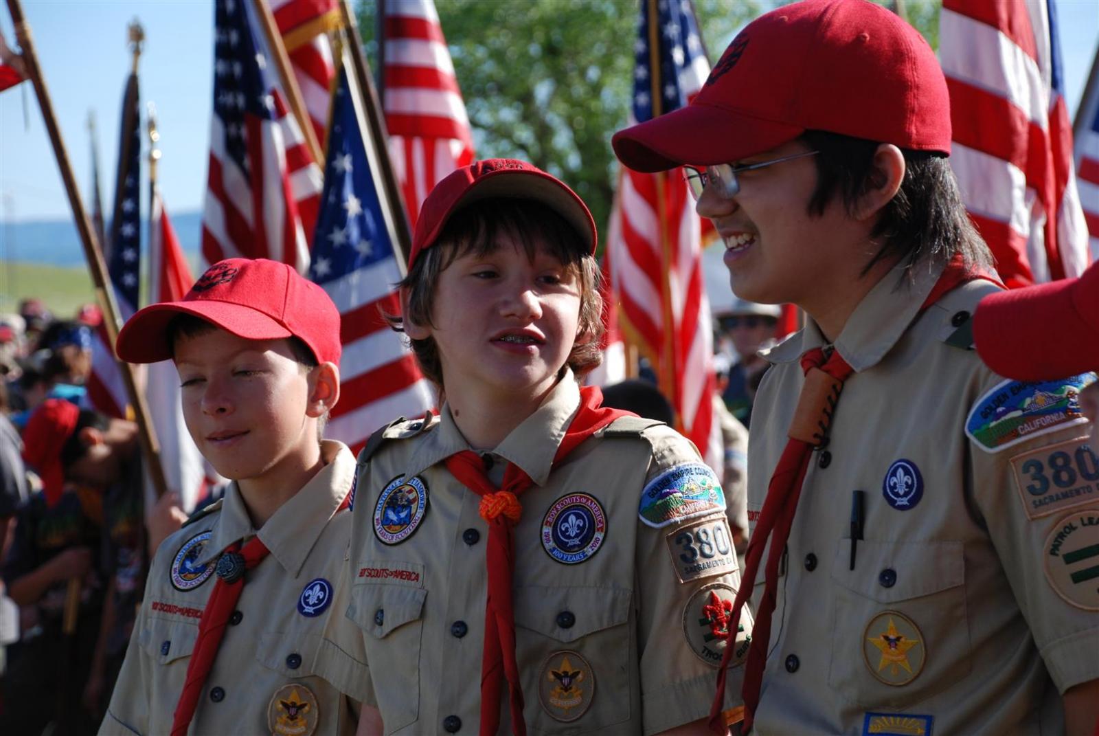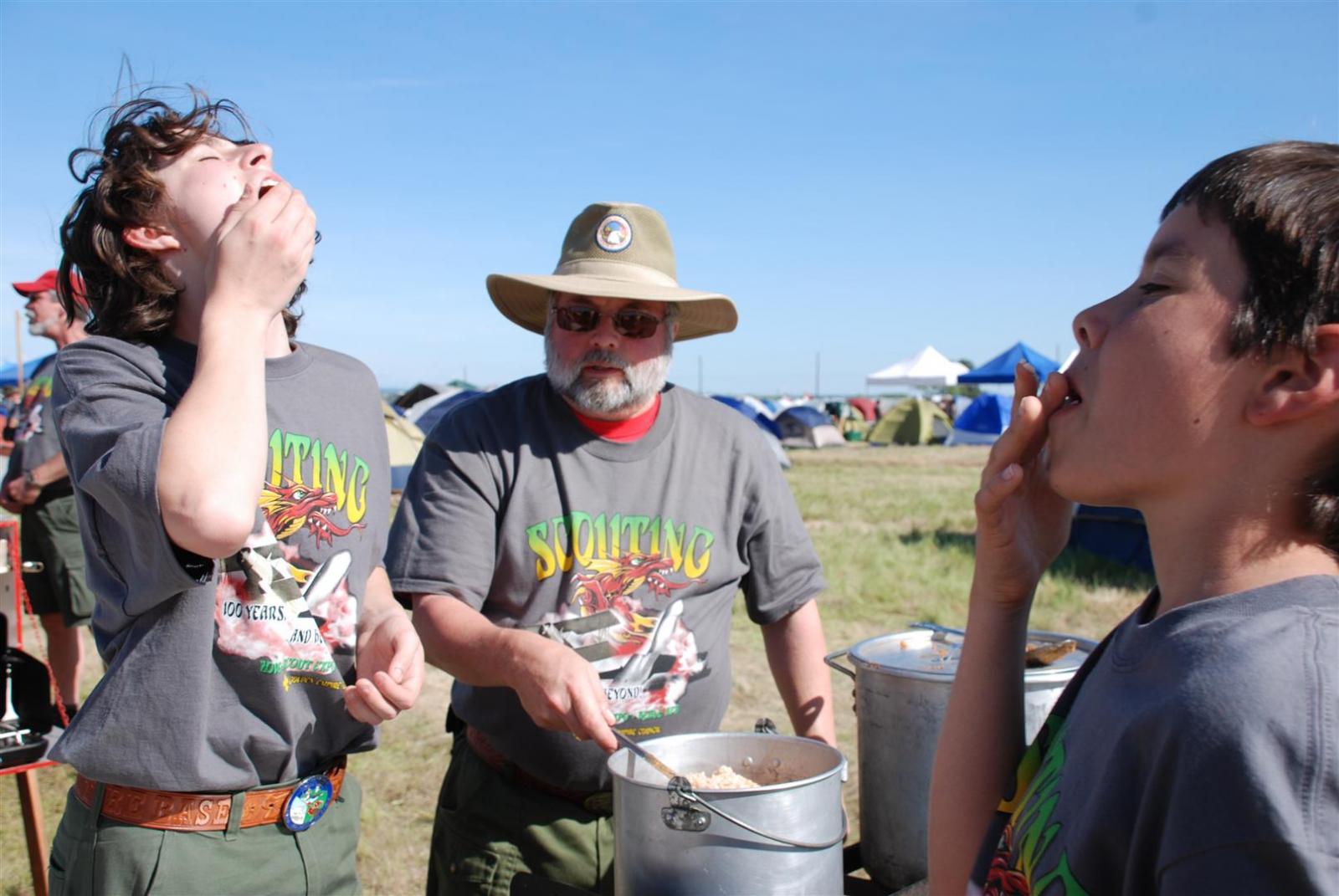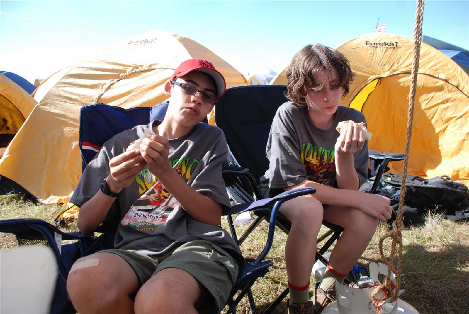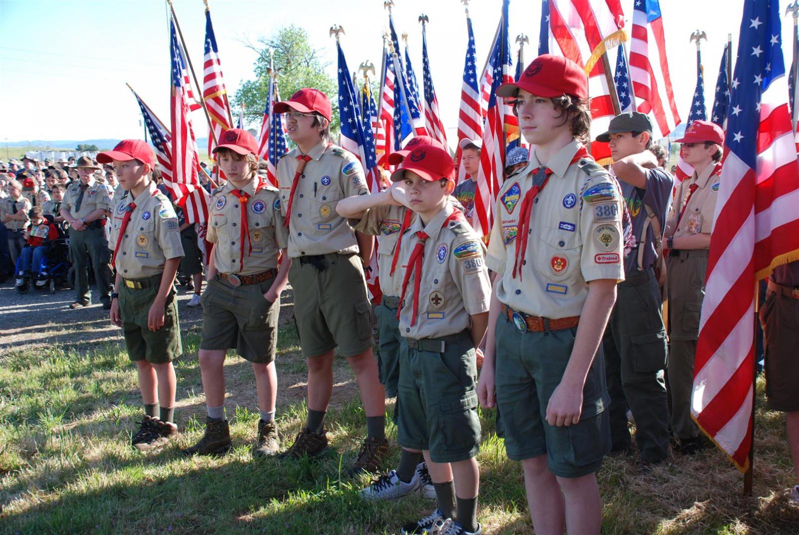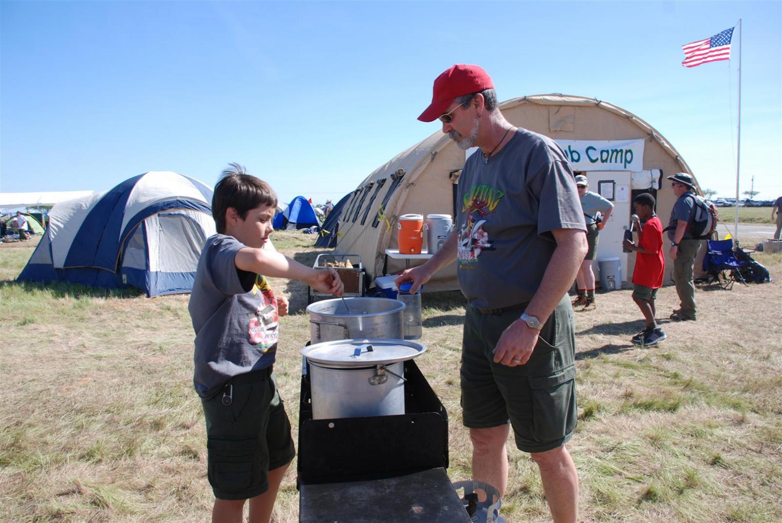 Saturday awoke to the sound of revelry. A hearty breakfast of oats, mini-wheats, and milk was served. Tickets were passed out for lunch at the Trading Post. The Troop participated in opening flags. The rest of the day was spent hiking to the flight line for a static display, merit badge alley, BMX biking, shooting bow/arrow, .22, and throwing tomahawks. Dinner was Mexican Tacos. The evening concluded with a stroll to the flight line for the arena show. A number of Troop 380 Scouts were a part of the show.