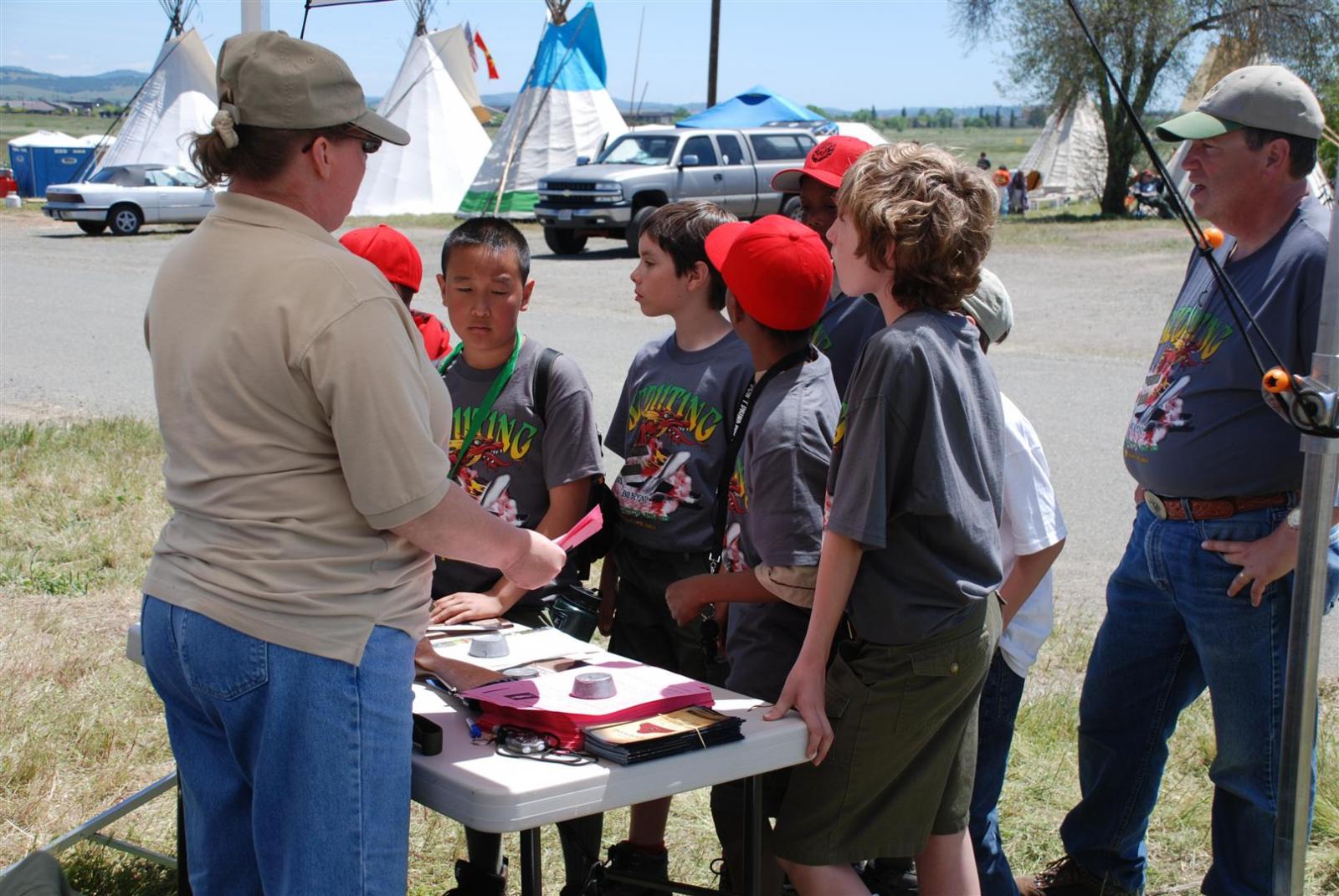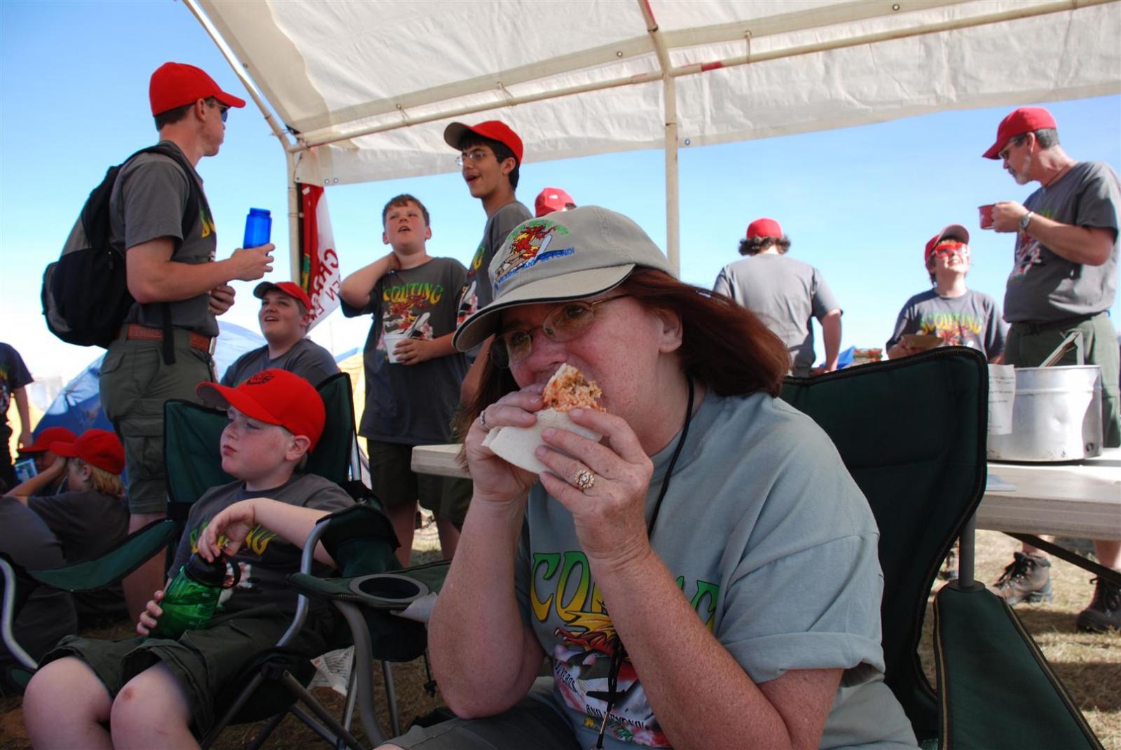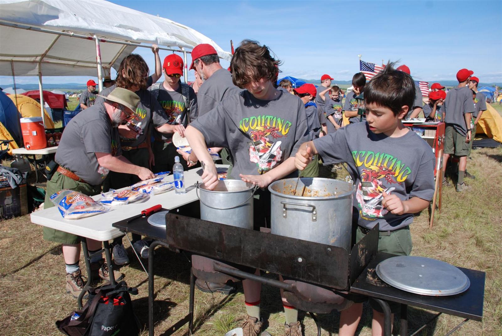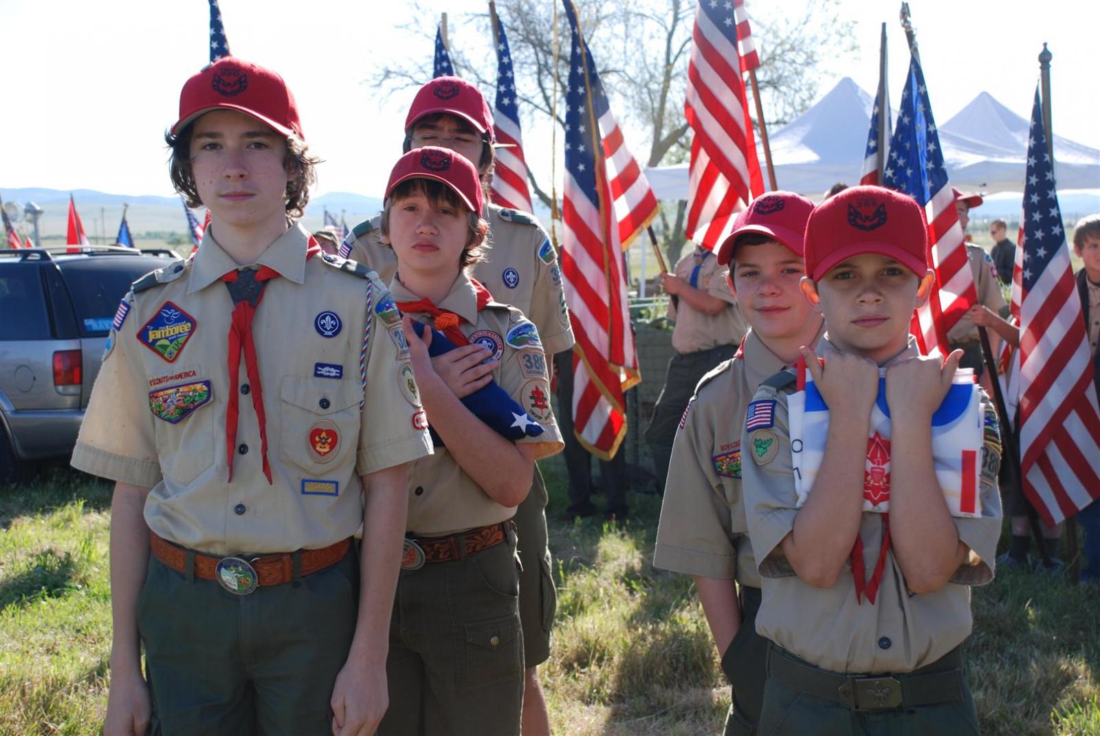 Saturday awoke to the sound of revelry. A hearty breakfast of oats, mini-wheats, and milk was served. Tickets were passed out for lunch at the Trading Post. The Troop participated in opening flags. The rest of the day was spent hiking to the flight line for a static display, merit badge alley, BMX biking, shooting bow/arrow, .22, and throwing tomahawks. Dinner was Mexican Tacos. The evening concluded with a stroll to the flight line for the arena show. A number of Troop 380 Scouts were a part of the show.