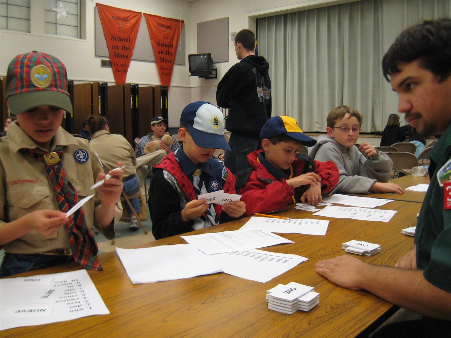 You might ask yourself, what is TWBW? It stands for Tigers, Wolves, Bears, and Webelos. It originated when Don Dier and his wife created any activity for the Cubs Scouts who were not Webelos. The Webelos are always working on belt loops and activities and the younger scouts sometimes miss out. When we were in Pack 380, it was a night where the all the Cubs Scouts, including Webelos could earn a Belt Loop. The event had not been done for a few years and I needed a diversity item for my Woodbadge ticket. I chose to have the Boy Scouts teach the Cub Scouts the Language and Culture belt loop. This belt loop requires that the boys play two games from a different country or culture. They learn ten words from a different language and talk with a person born in a different country.