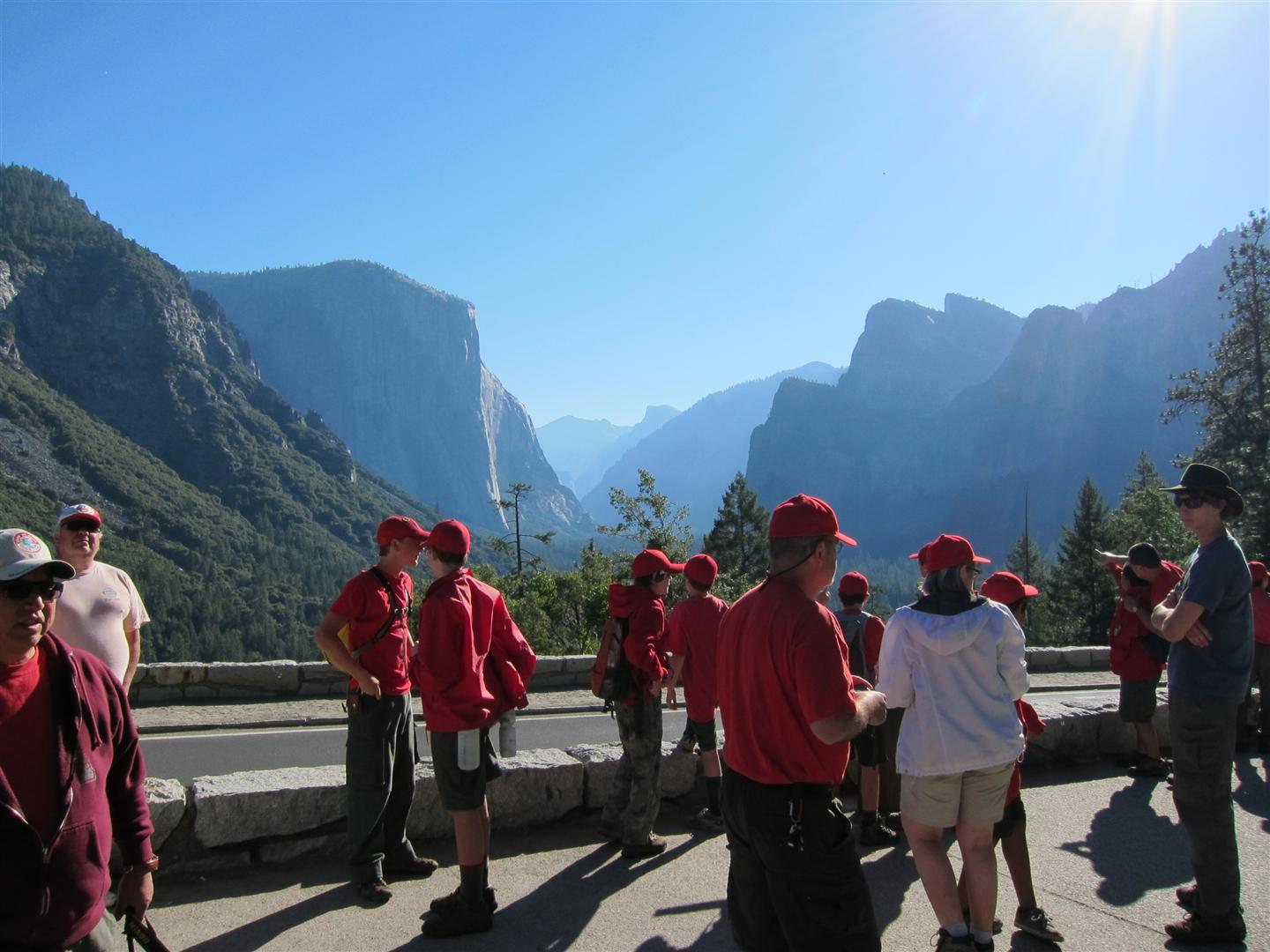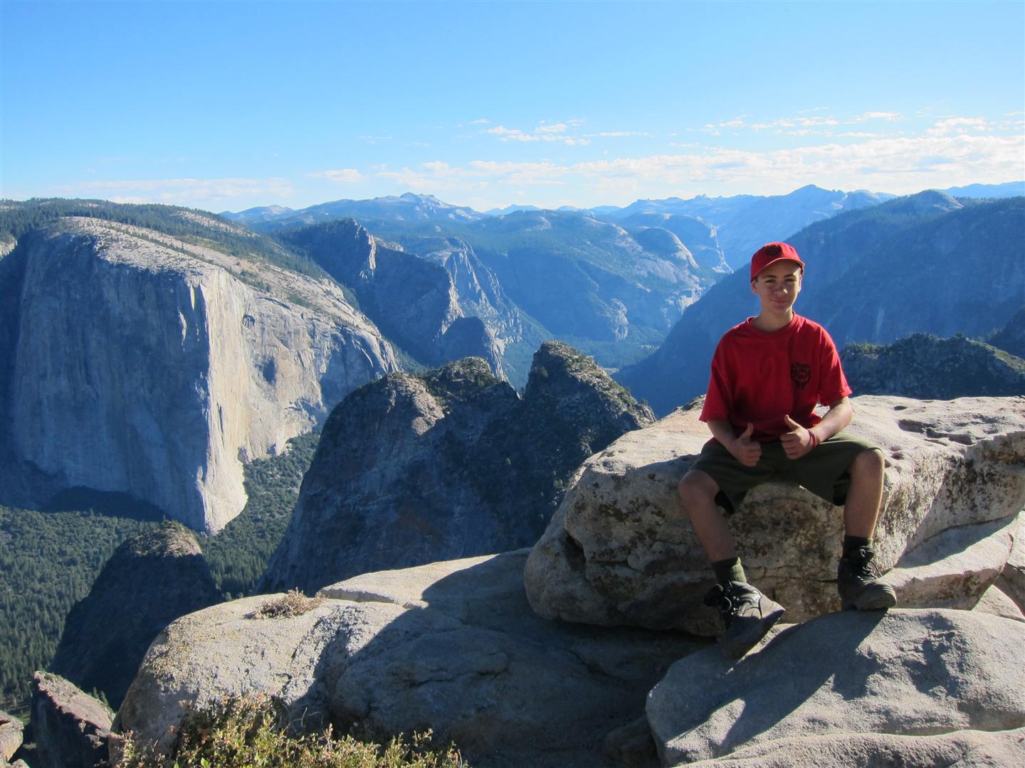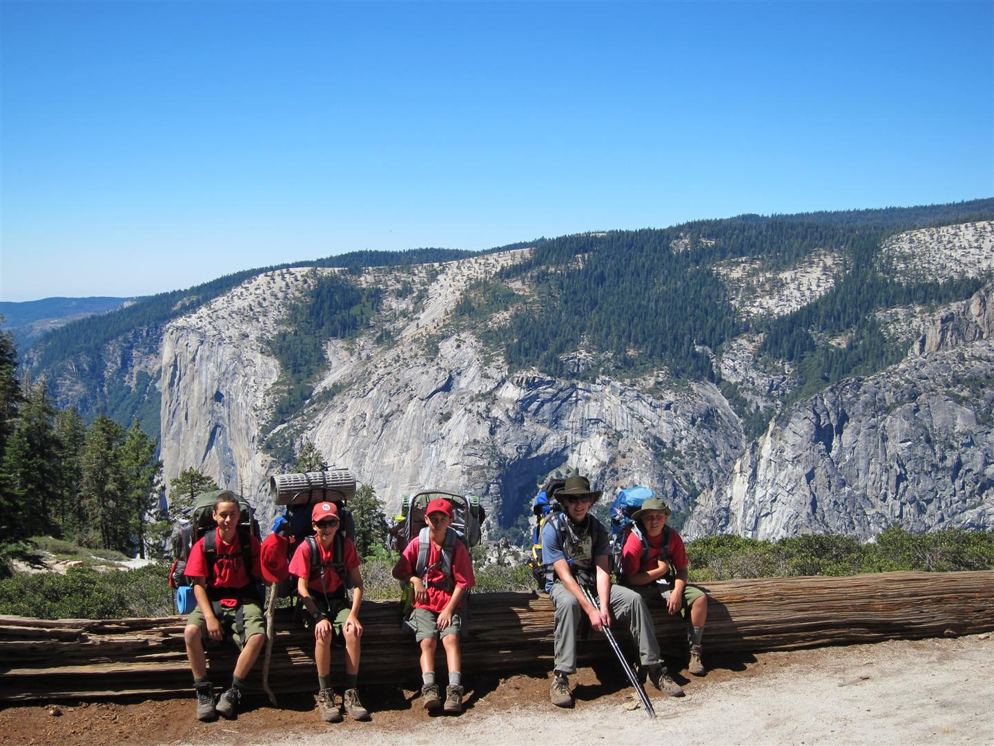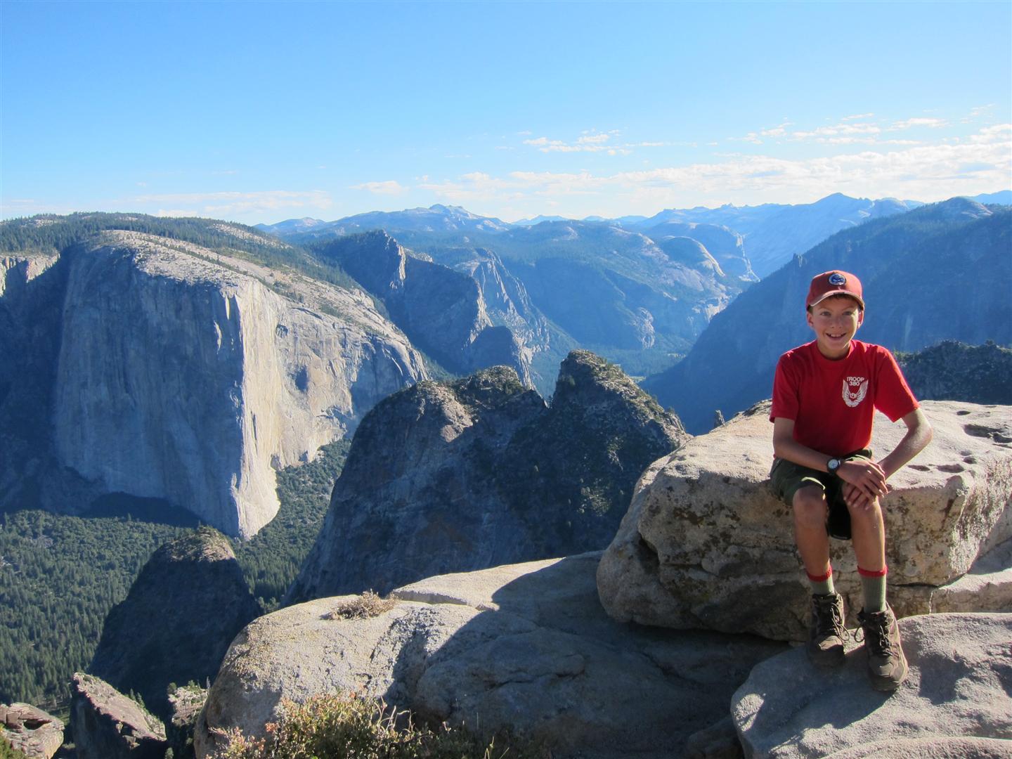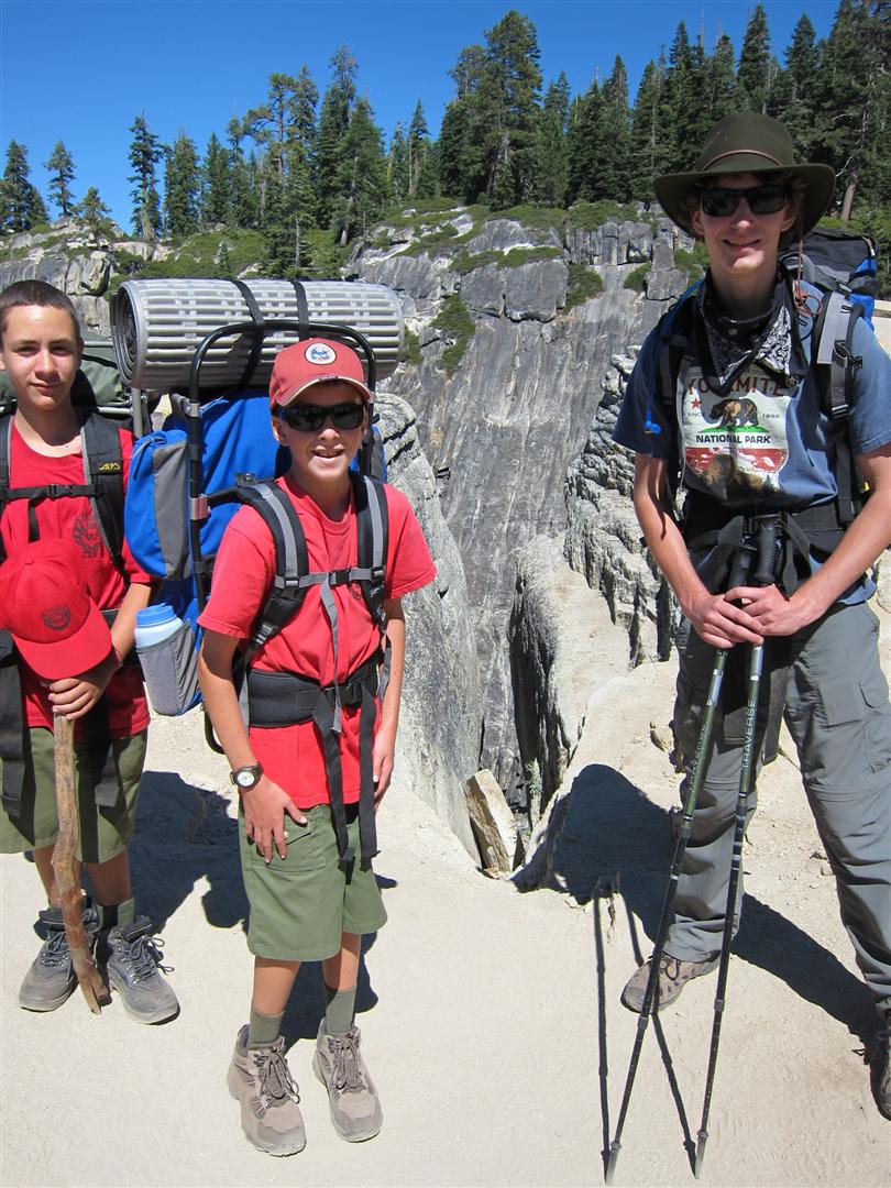 For the backpacking trip, five Scouts and three adults hiked the 14 mile Pohono trail along the upper south rim of the valley. Not only did they get to see the magnificent views from Glacier Point with the entire group on Sunday, but through Sunday and Monday they stopped along Taft Point, Dewey Point, Crocker Point, Stanford Point, and Inspiration Point. After 14 miles and two days of excellent weather, this was their parting vista of the day at the Wawona Tunnel.