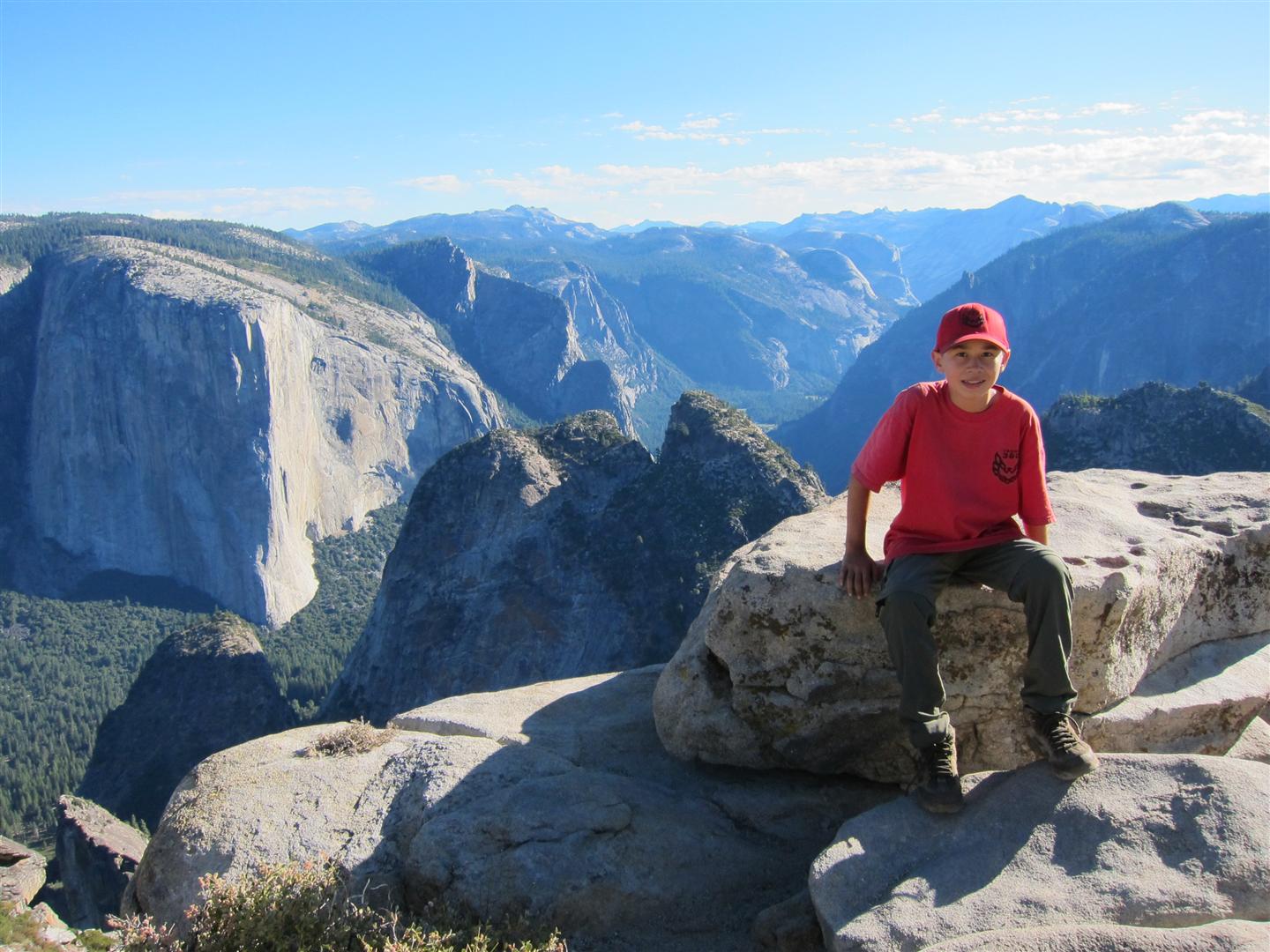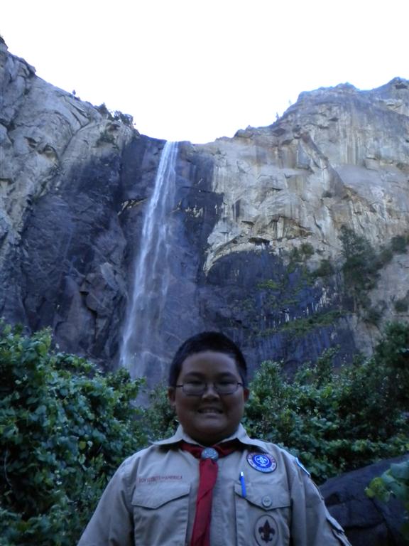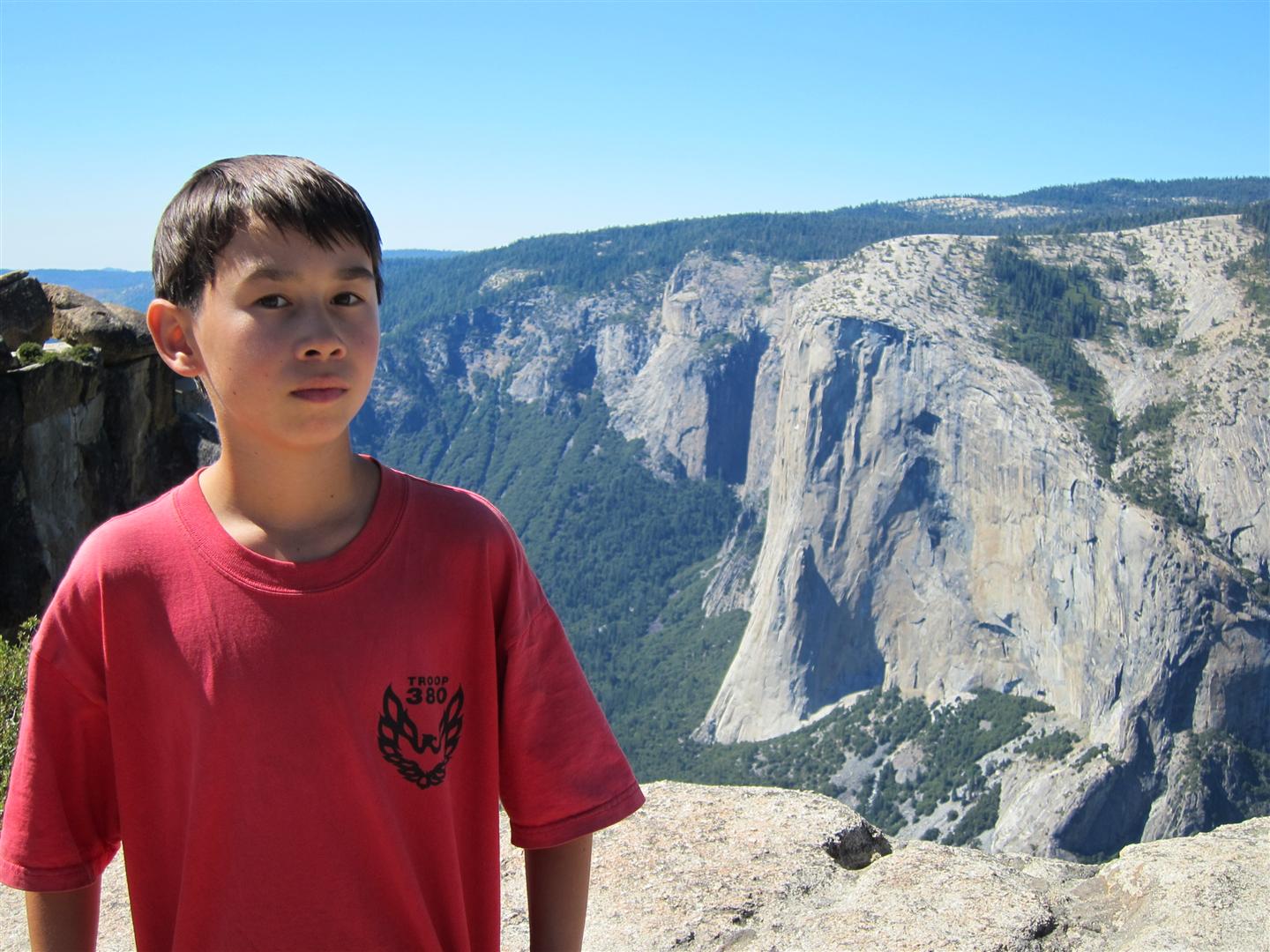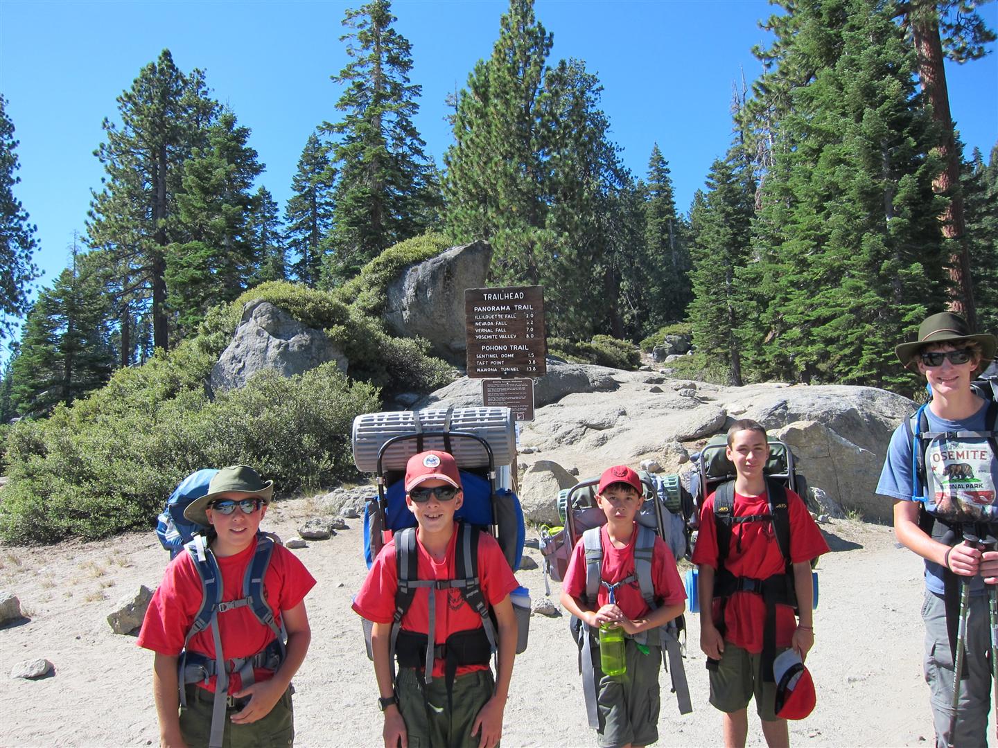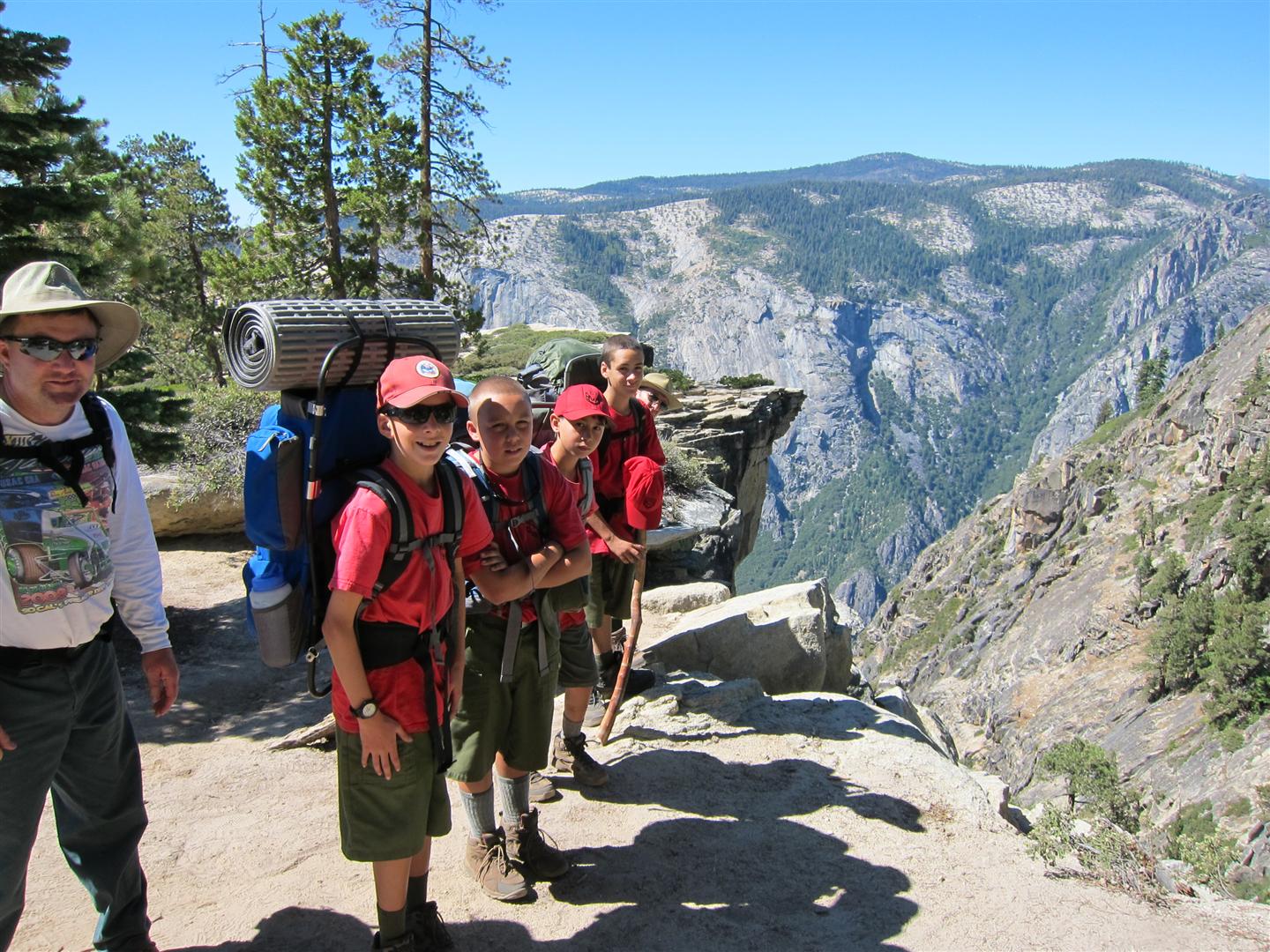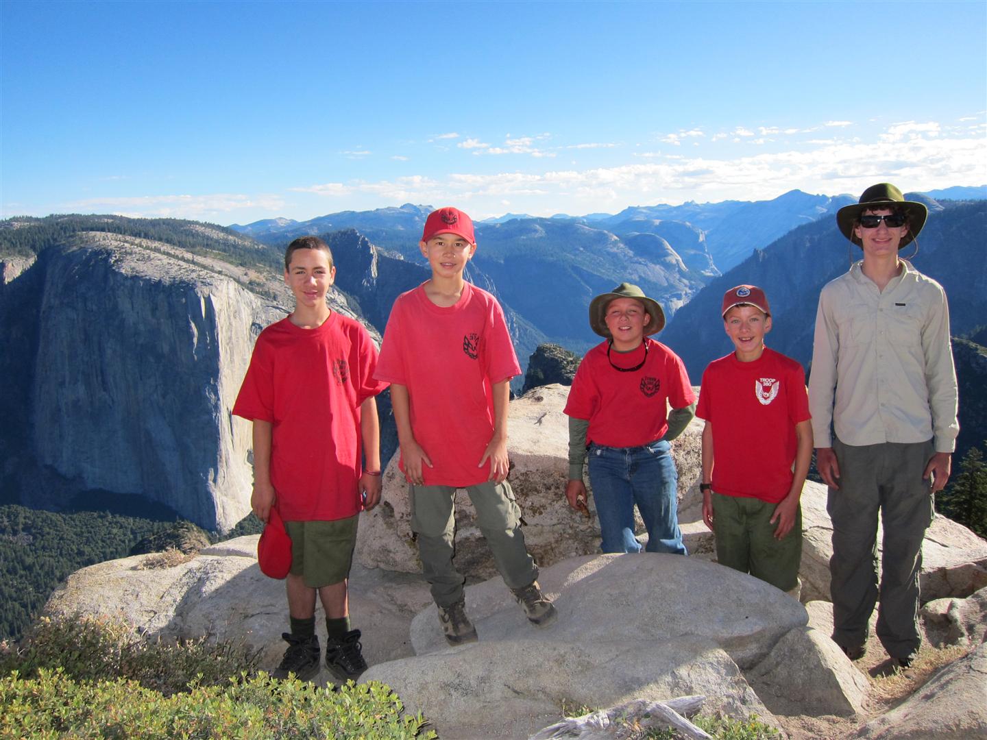 For the backpacking trip, five Scouts and three adults hiked the 14 mile Pohono trail along the upper south rim of the valley. Not only did they get to see the magnificent views from Glacier Point with the entire group on Sunday, but through Sunday and Monday they stopped along Taft Point, Dewey Point, Crocker Point, Stanford Point, and Inspiration Point. After 14 miles and two days of excellent weather, this was their parting vista of the day at the Wawona Tunnel.