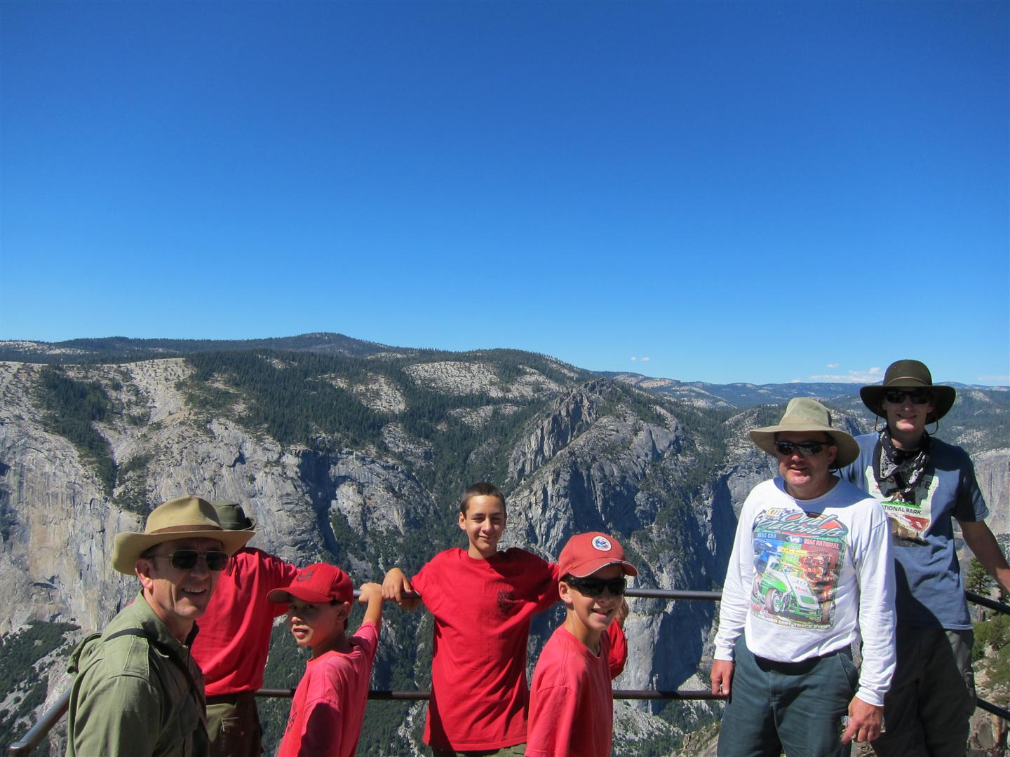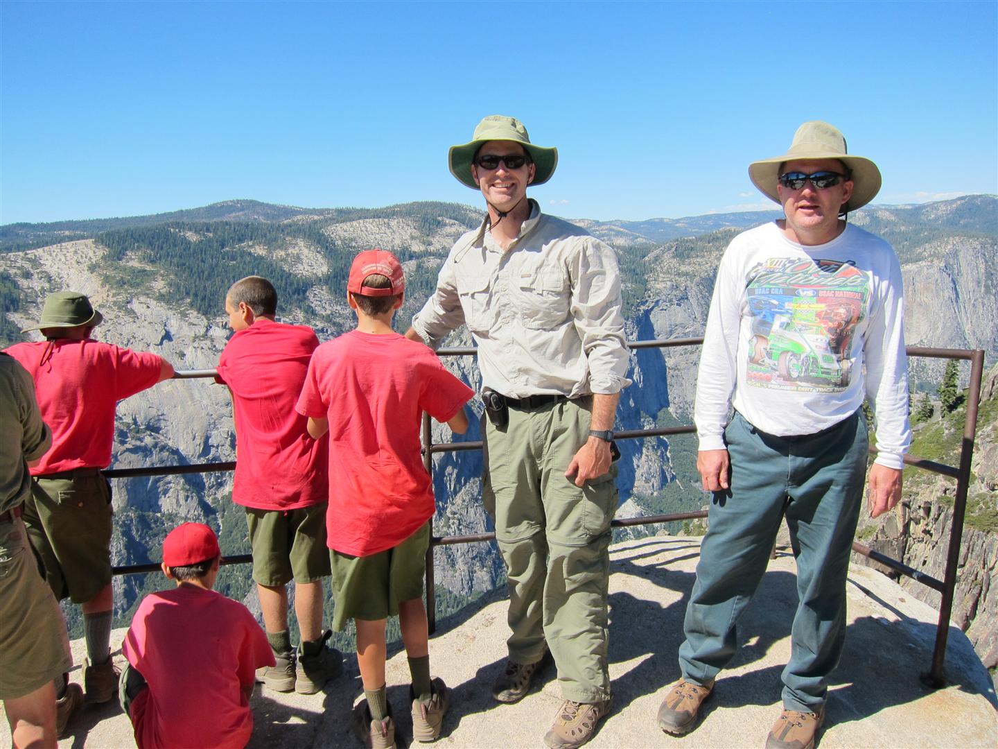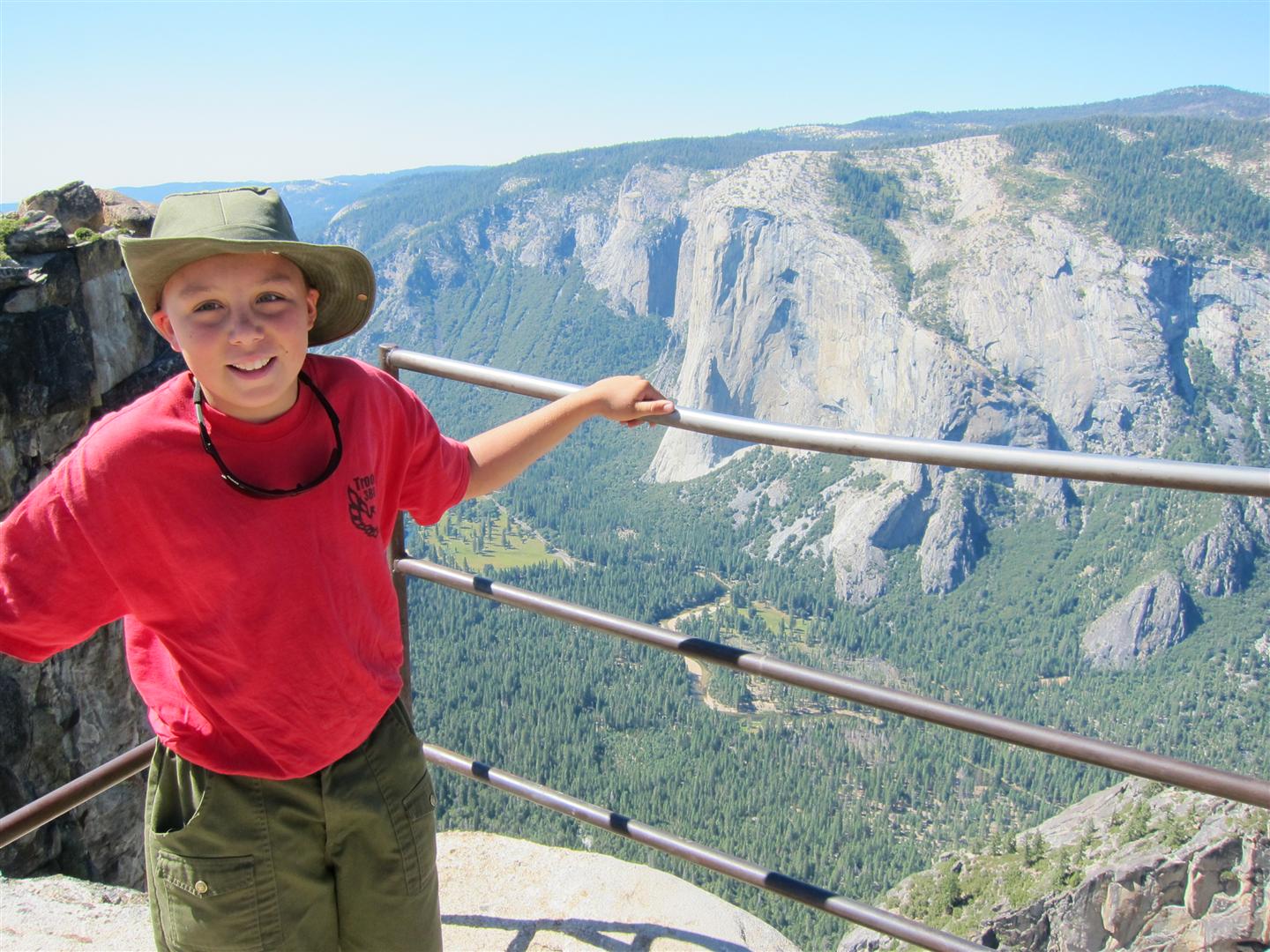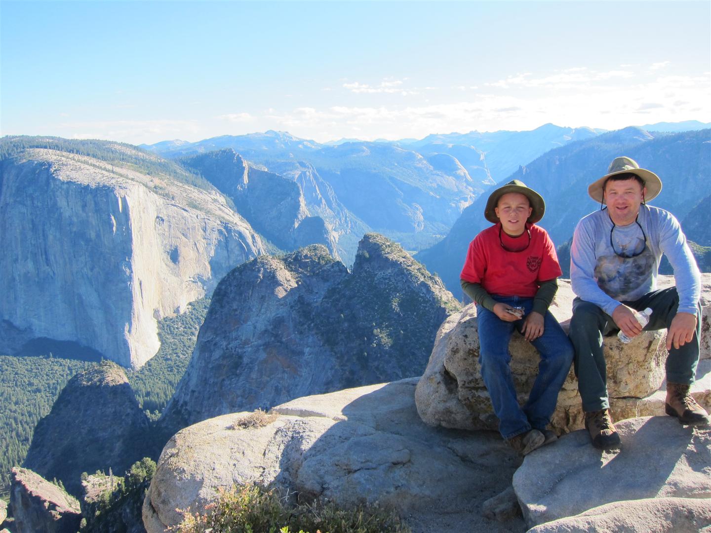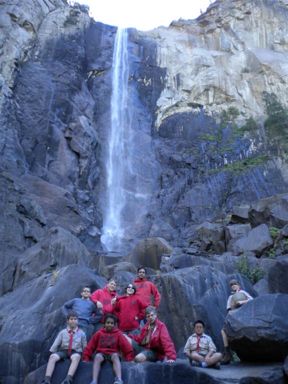 For the backpacking trip, five Scouts and three adults hiked the 14 mile Pohono trail along the upper south rim of the valley. Not only did they get to see the magnificent views from Glacier Point with the entire group on Sunday, but through Sunday and Monday they stopped along Taft Point, Dewey Point, Crocker Point, Stanford Point, and Inspiration Point. After 14 miles and two days of excellent weather, this was their parting vista of the day at the Wawona Tunnel.