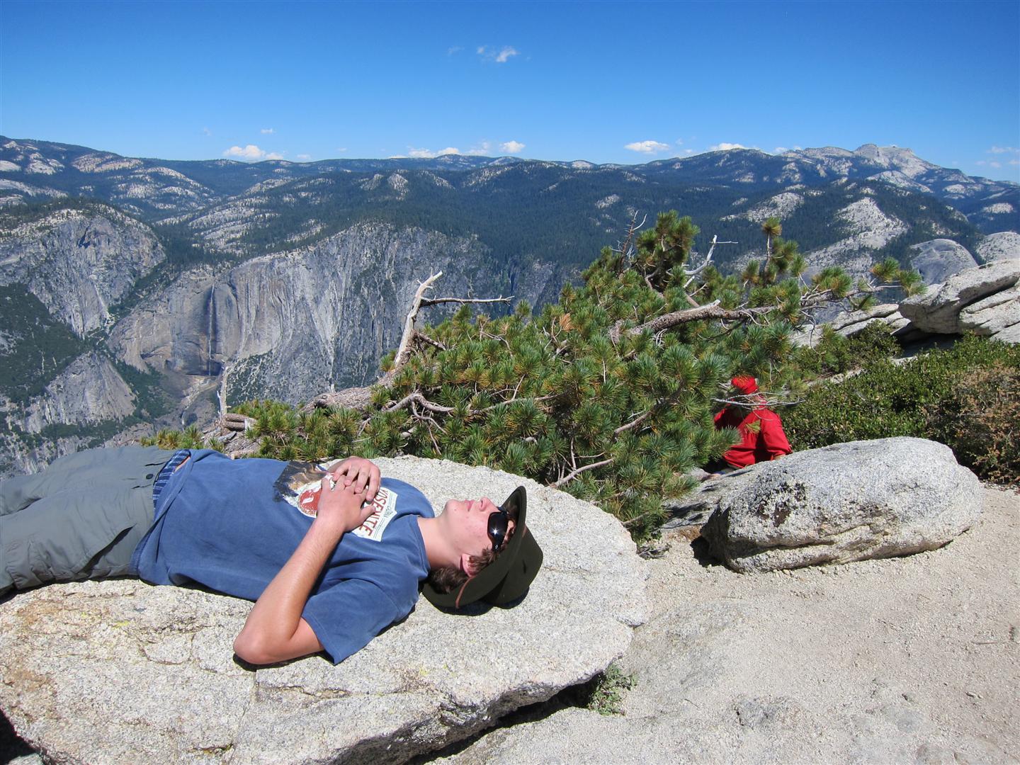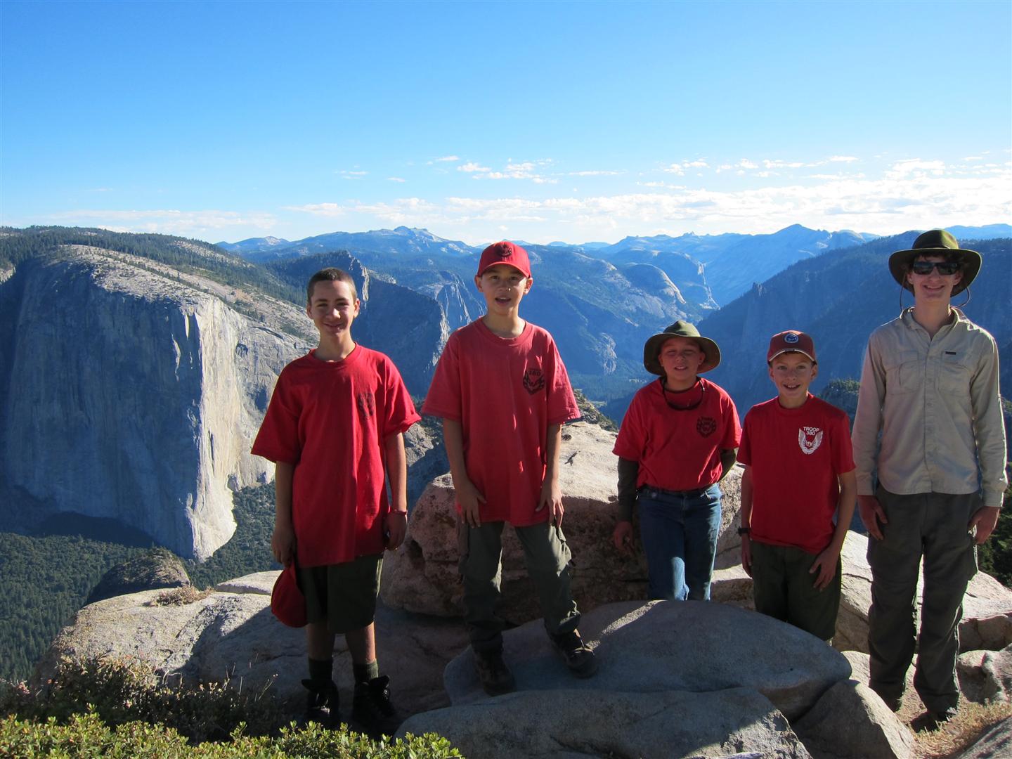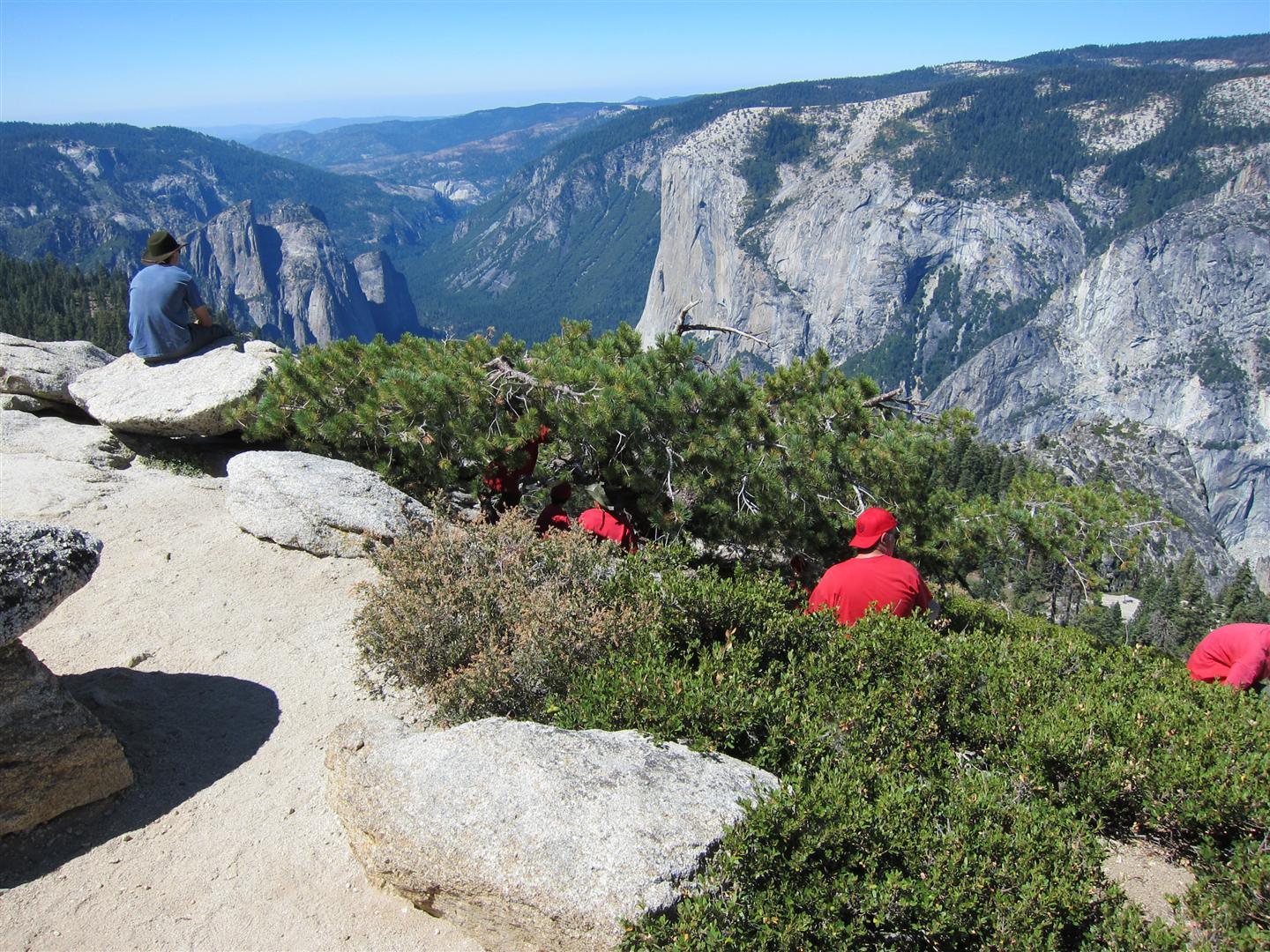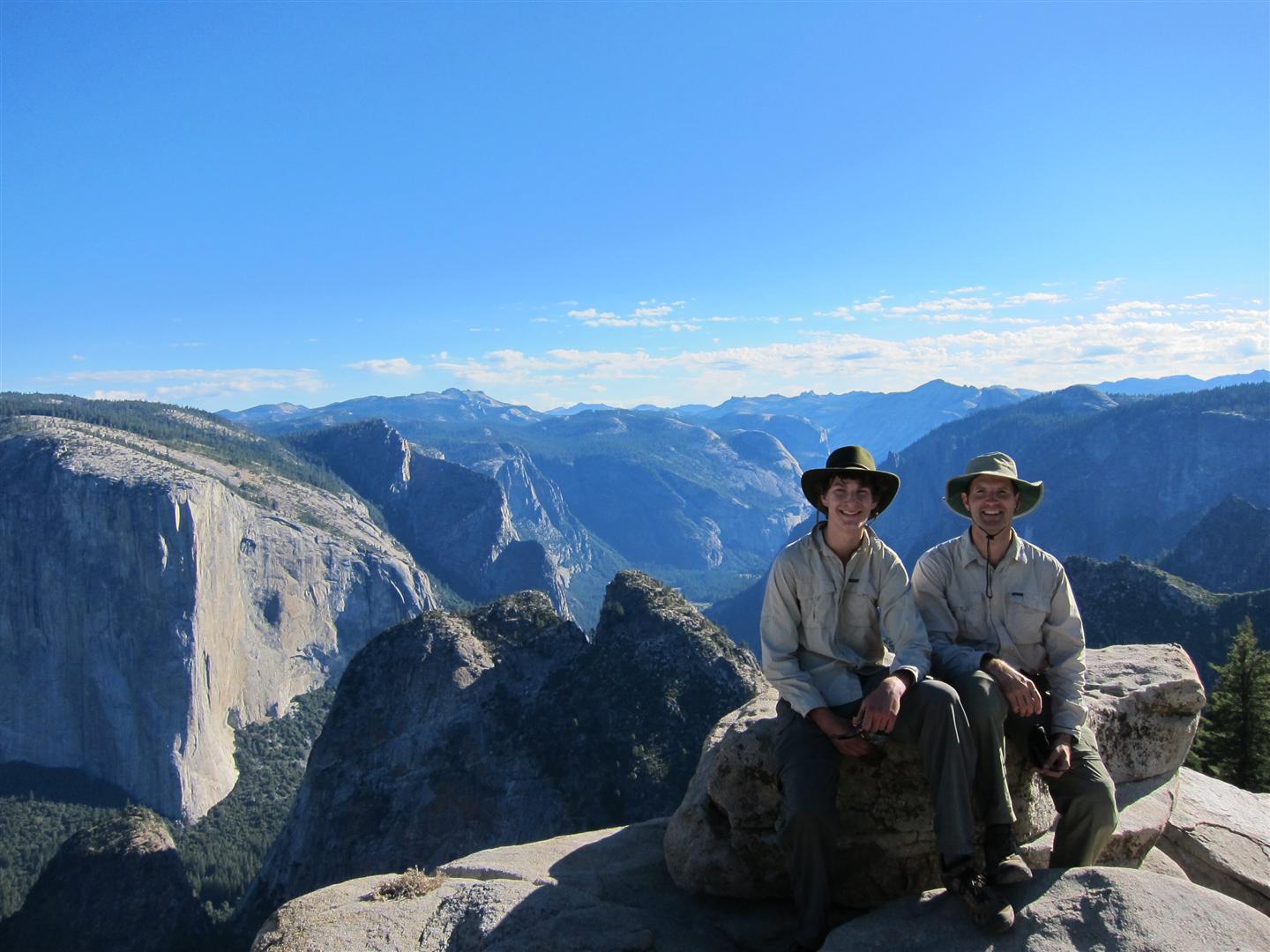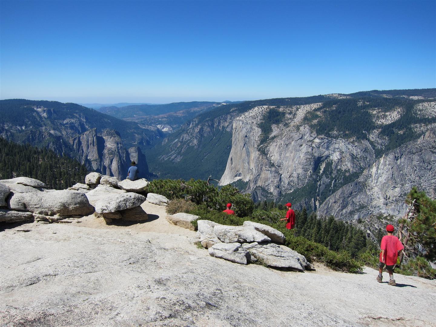 For the backpacking trip, five Scouts and three adults hiked the 14 mile Pohono trail along the upper south rim of the valley. Not only did they get to see the magnificent views from Glacier Point with the entire group on Sunday, but through Sunday and Monday they stopped along Taft Point, Dewey Point, Crocker Point, Stanford Point, and Inspiration Point. After 14 miles and two days of excellent weather, this was their parting vista of the day at the Wawona Tunnel.