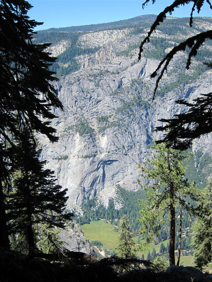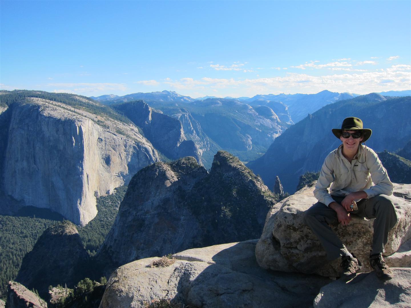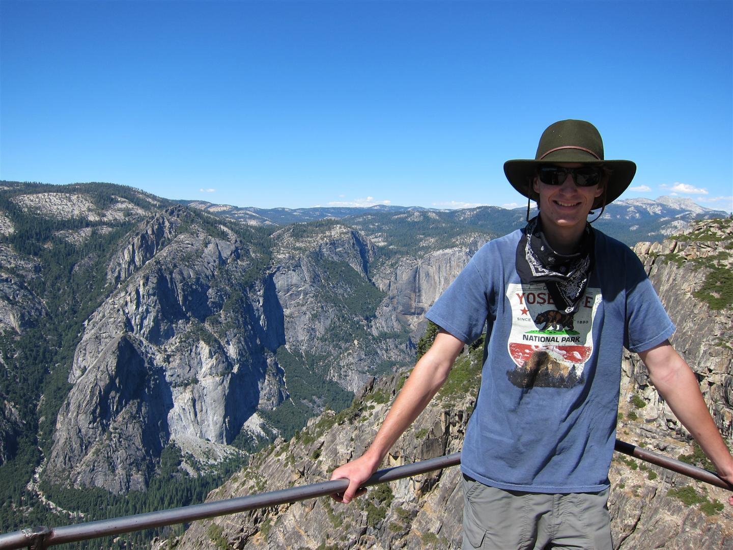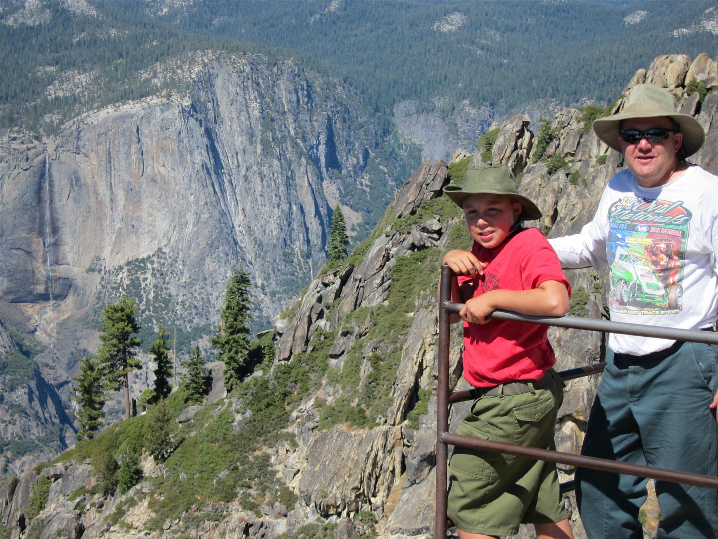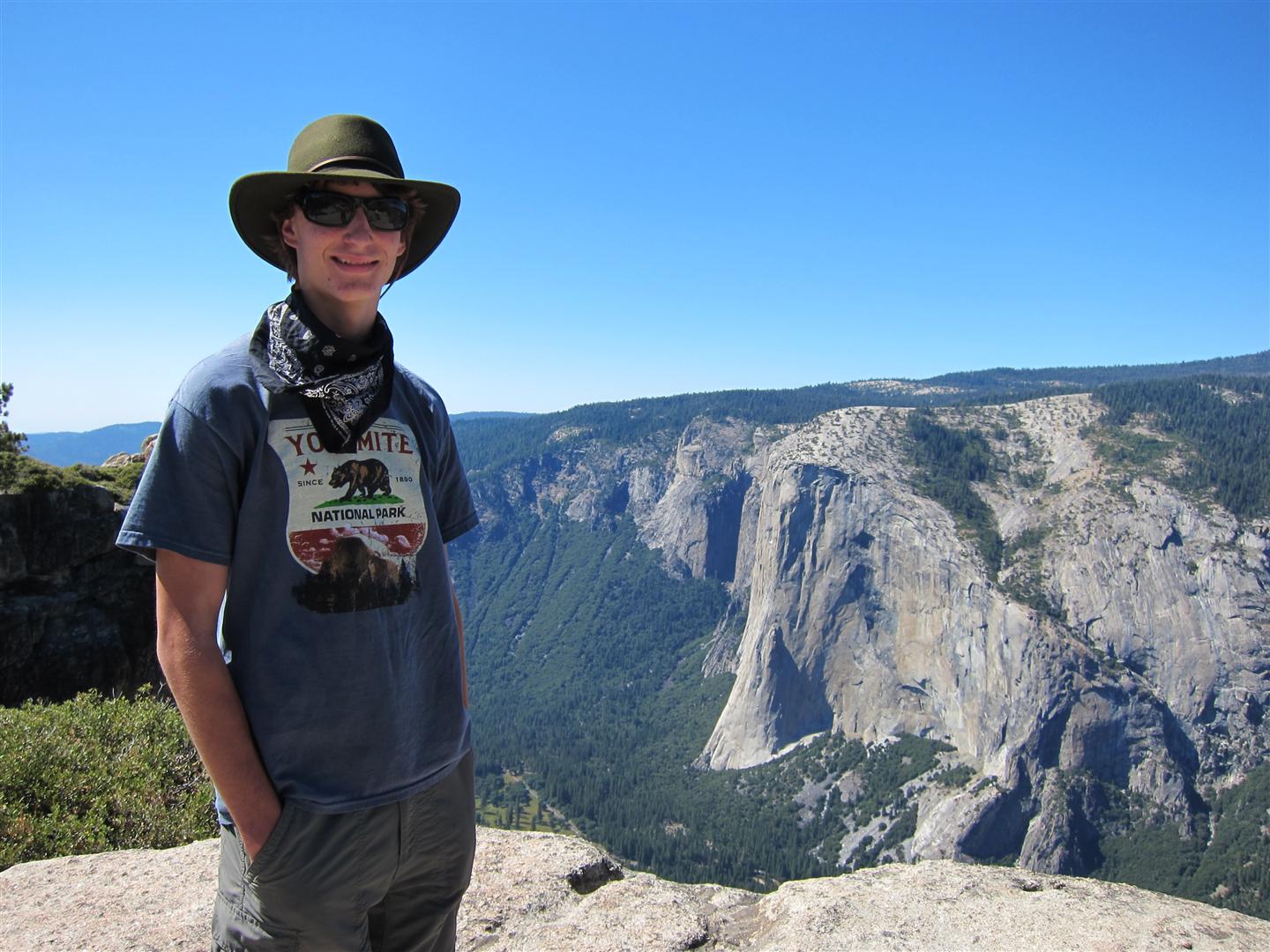 For the backpacking trip, five Scouts and three adults hiked the 14 mile Pohono trail along the upper south rim of the valley. Not only did they get to see the magnificent views from Glacier Point with the entire group on Sunday, but through Sunday and Monday they stopped along Taft Point, Dewey Point, Crocker Point, Stanford Point, and Inspiration Point. After 14 miles and two days of excellent weather, this was their parting vista of the day at the Wawona Tunnel.